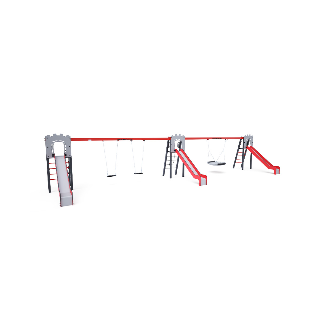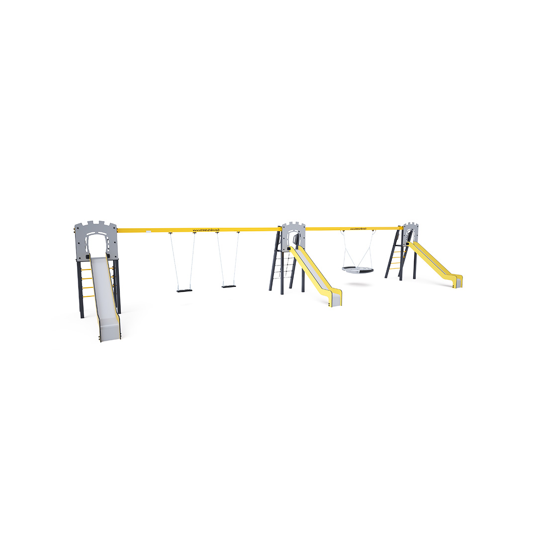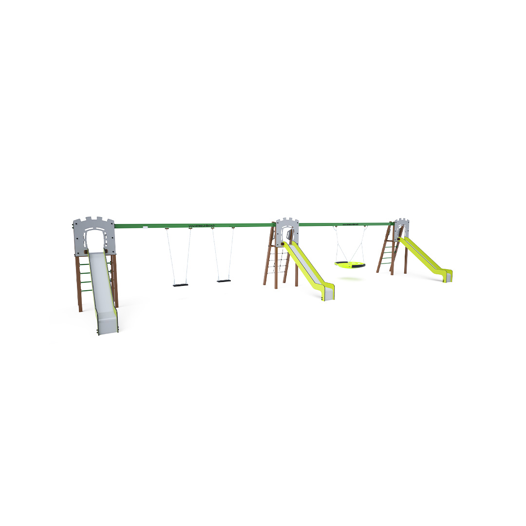 Drei zertifizierte, wartungsfreie A-förmige Türme. Zwei davon mit geriffeltem Ausgang und Rutsche, einer mit Seilnetz und Rutsche, verbunden durch zwei Hängeschaukeln. Eine Doppelschaukel bietet Platz für zwei klassische Sitze, zwei Babysitze oder eine Kombination aus beidem. Die zweite Schaukel ist ein Hängenest. Der Babysitz verfügt über einen Laufstall mit einer Trennwand zwischen den Beinen des Kindes, die ein Verrutschen oder Herausfallen verhindert. Gleichzeitig kann man sich anlehnen. Das Nest eignet sich zum Schaukeln mehrerer Kinder, auch in ungewöhnlicher, liegender Position. Es ist mit einem Sicherheitsgelenk und einer Sicherheitskette ausgestattet. Die Stahlkonstruktion ist dank Verzinkung und Pulverbeschichtung witterungsbeständig. Die verwendeten Materialien HPL und HDPE sind chemikalienbeständig, UV-beständig, farbecht, ungiftig, recycelbar und bruchfest. Es besteht keine Verletzungsgefahr durch scharfe Kanten oder Splitter.