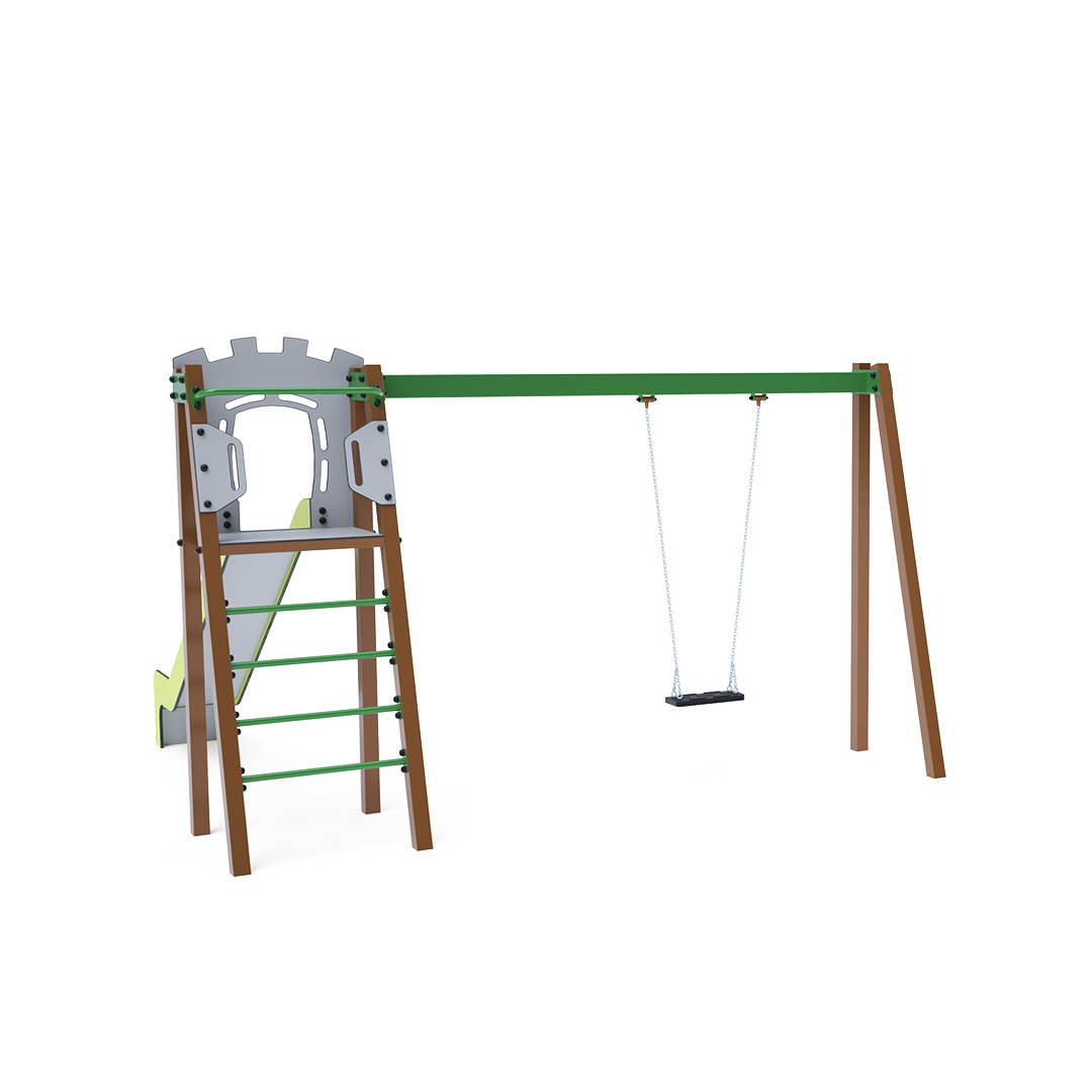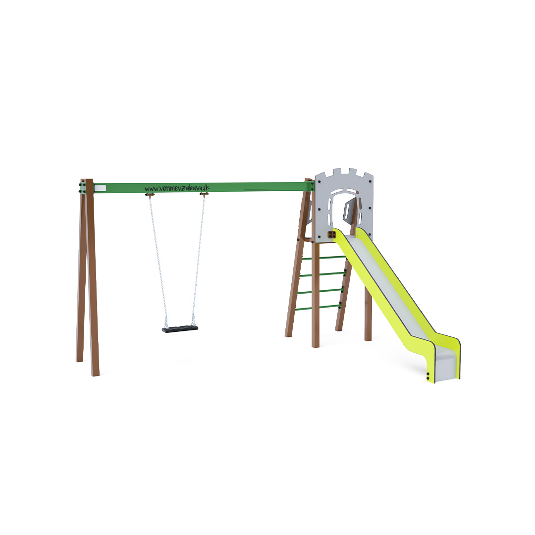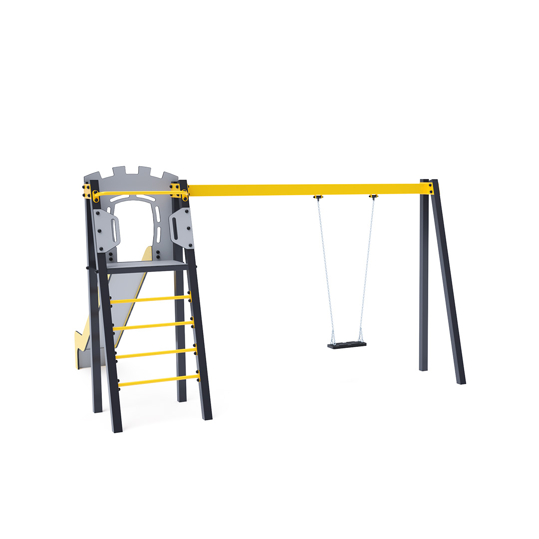 Zertifizierter, wartungsfreier A-förmiger Turm mit geriffeltem Ausstieg und Rutsche, ergänzt durch eine Hängeschaukel mit klassischem Sitz. Die Stahlkonstruktion ist dank Feuerverzinkung und langlebiger Pulverbeschichtung witterungsbeständig. Das verwendete HPL-Material ist chemikalienbeständig, UV-beständig, farbecht, ungiftig, recycelbar und bruchfest. Es besteht keine Verletzungsgefahr für Kinder durch scharfe Kanten oder Splitter. Alle Verbindungen sind aus Edelstahl und mit Kunststoffkappen abgedeckt, um Langlebigkeit und Sicherheit zu erhöhen.