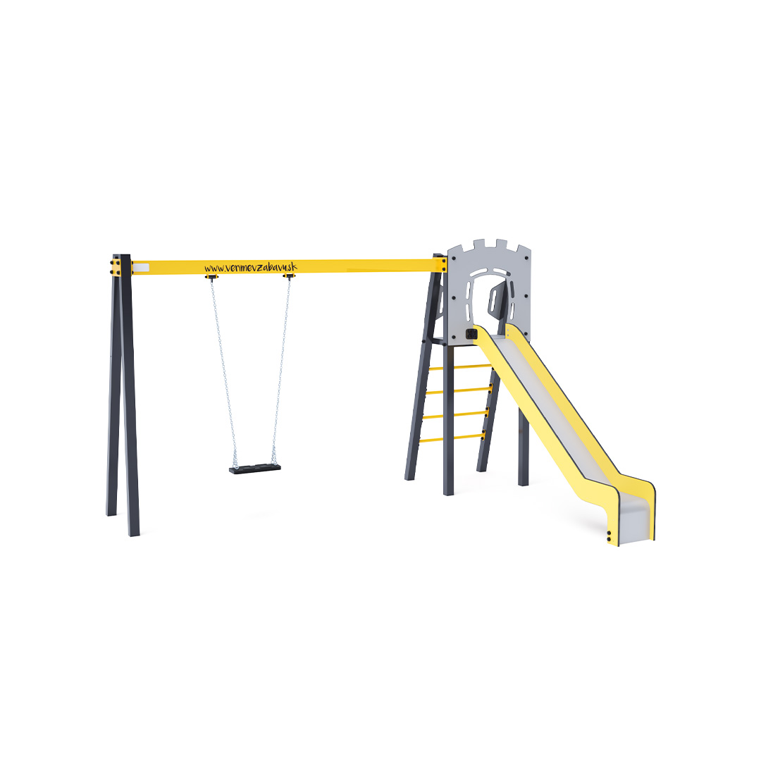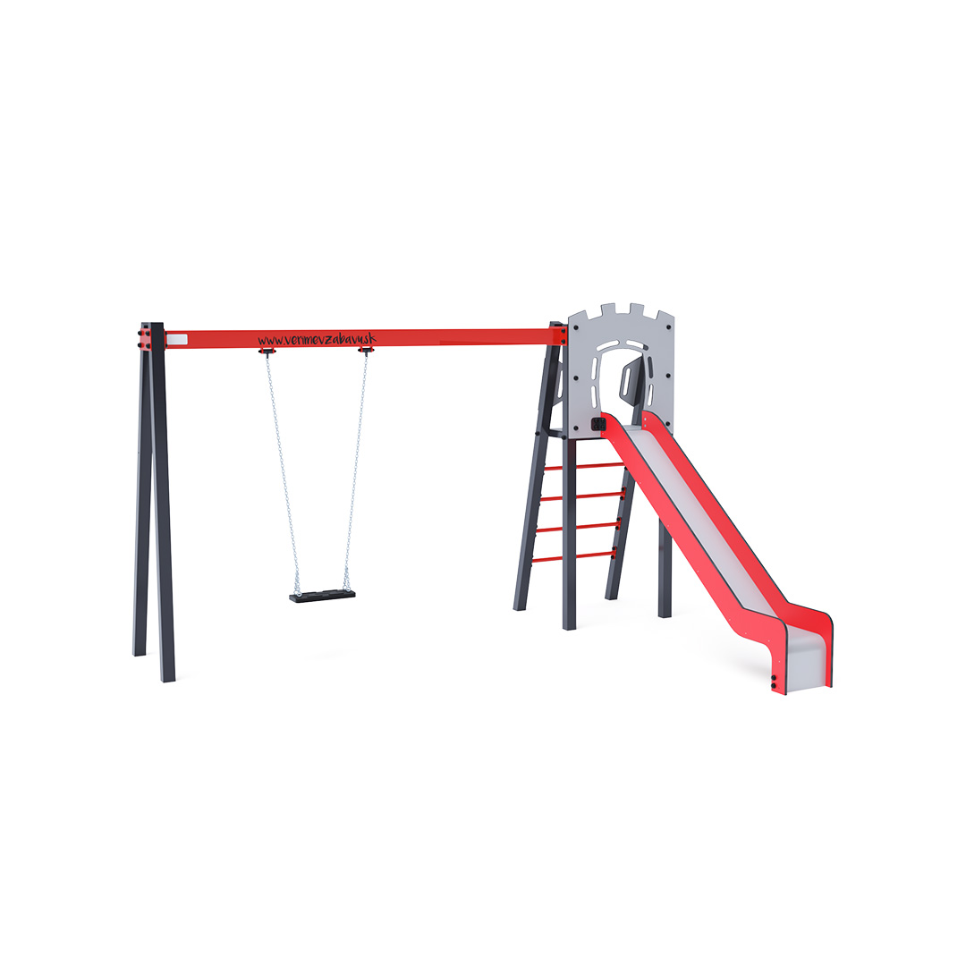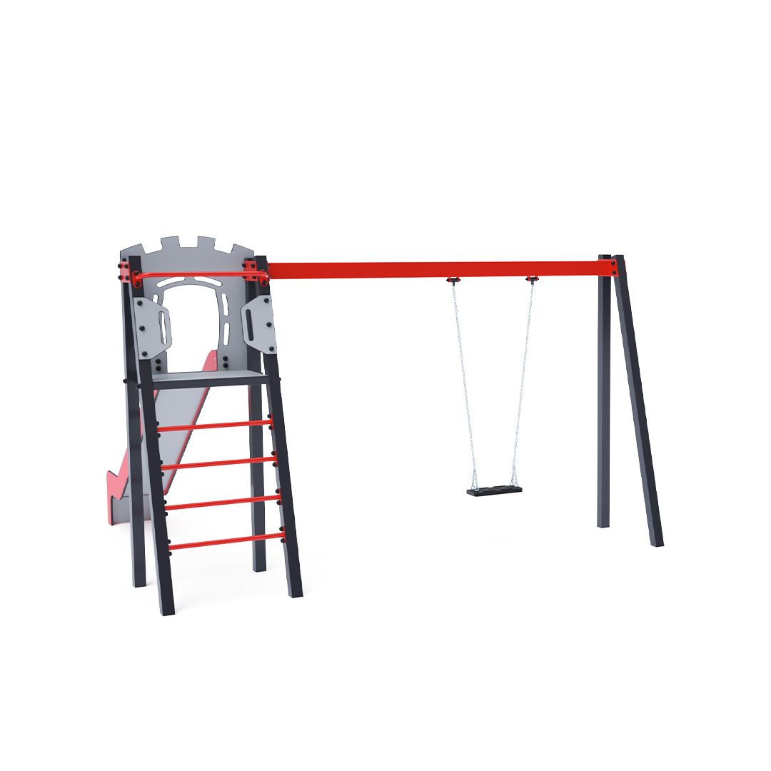 Zertifizierter, wartungsfreier A-förmiger Turm mit geriffeltem Ausstieg und Rutsche, ergänzt durch eine Hängeschaukel mit klassischem Sitz. Die Stahlkonstruktion ist dank Feuerverzinkung und langlebiger Pulverbeschichtung witterungsbeständig. Das verwendete HPL-Material ist chemikalienbeständig, UV-beständig, farbecht, ungiftig, recycelbar und bruchfest. Es besteht keine Verletzungsgefahr für Kinder durch scharfe Kanten oder Splitter. Alle Verbindungen sind aus Edelstahl und mit Kunststoffkappen abgedeckt, um Langlebigkeit und Sicherheit zu erhöhen.