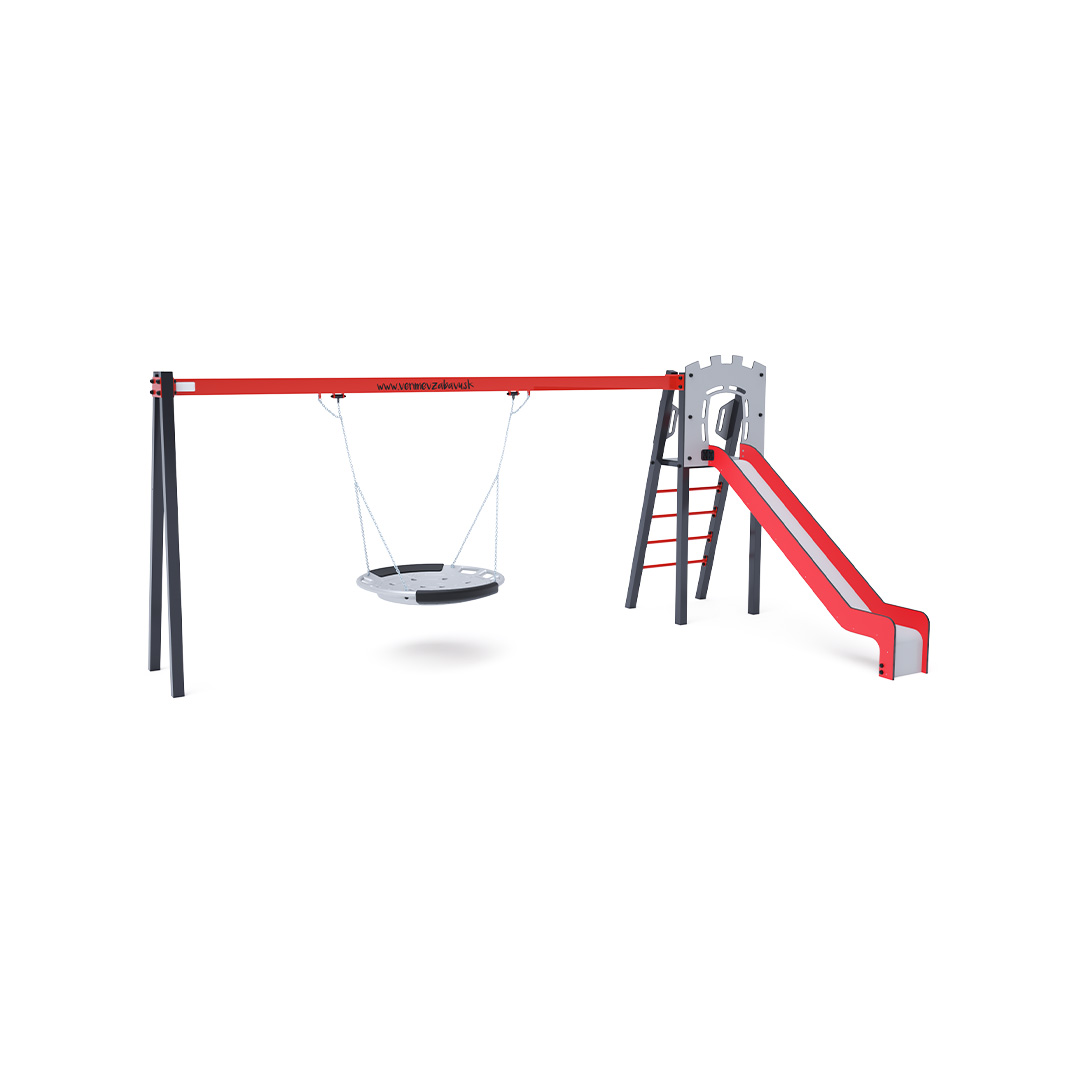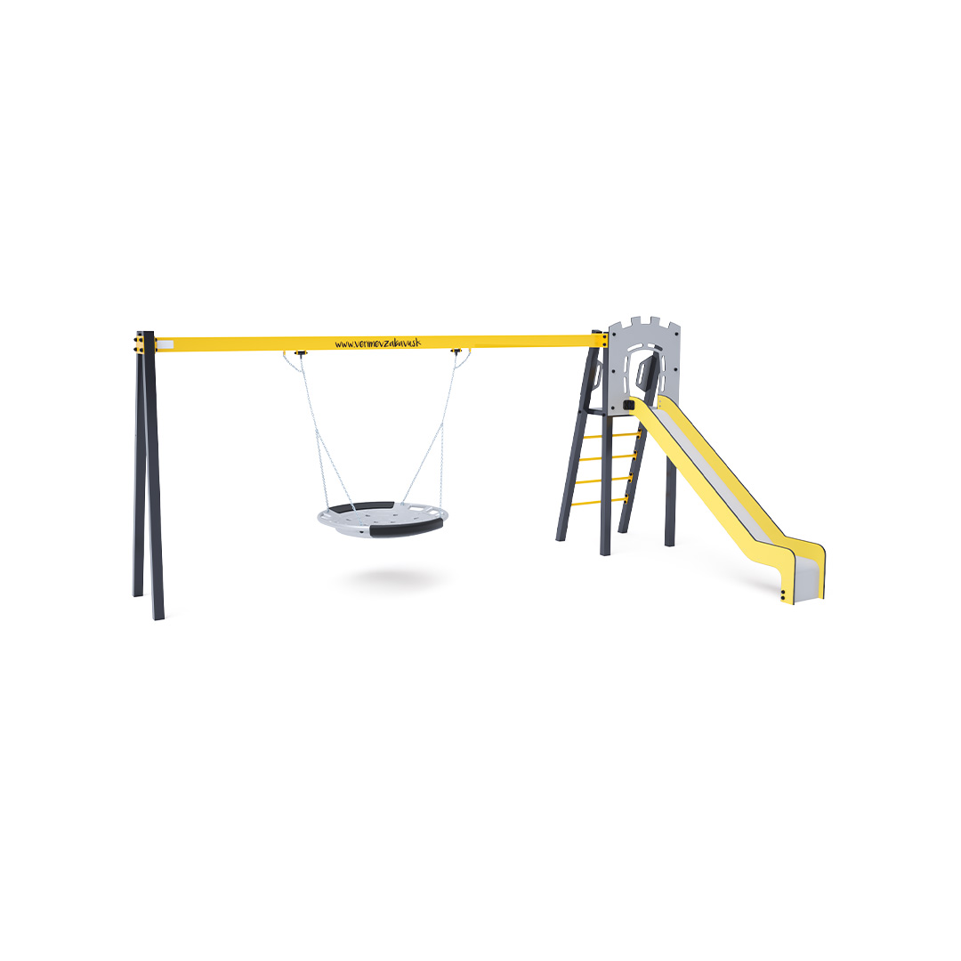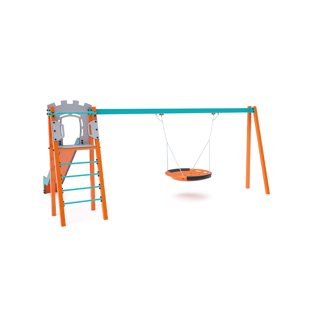 Zertifizierter, wartungsfreier A-förmiger Turm mit geriffeltem Ausstieg und Rutsche, ergänzt durch eine Hängeschaukel mit Nest. Das Schaukelnest eignet sich zum Schaukeln von Kleinkindern im Liegen oder für mehrere Kinder gleichzeitig. Das Nest verfügt über ein Sicherheitsgelenk mit Sicherheitskette. Die Stahlkonstruktion ist dank Verzinkung und widerstandsfähiger Pulverbeschichtung witterungsbeständig. Die verwendeten Materialien HPL und HDPE sind chemikalienbeständig, UV-beständig, farbecht, ungiftig, recycelbar und bruchfest. Es besteht keine Verletzungsgefahr durch scharfe Kanten oder Splitter. Alle Verbindungen sind aus Edelstahl und mit Kunststoffkappen abgedeckt, um Langlebigkeit und Sicherheit zu erhöhen.
