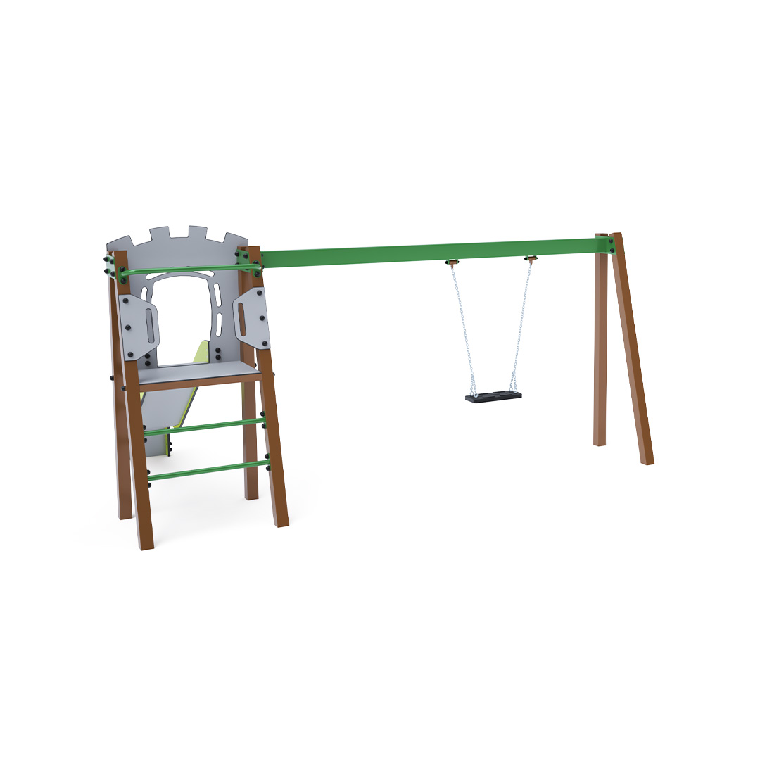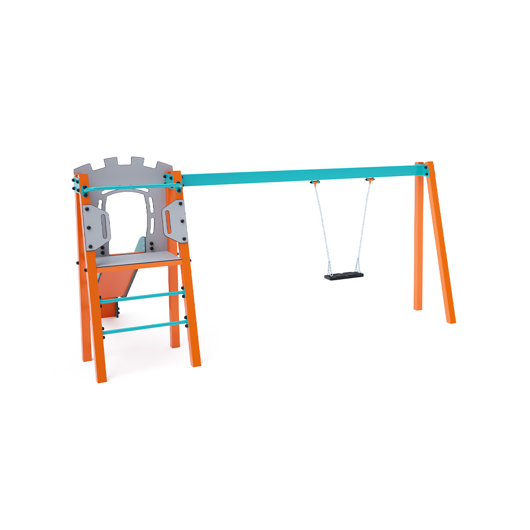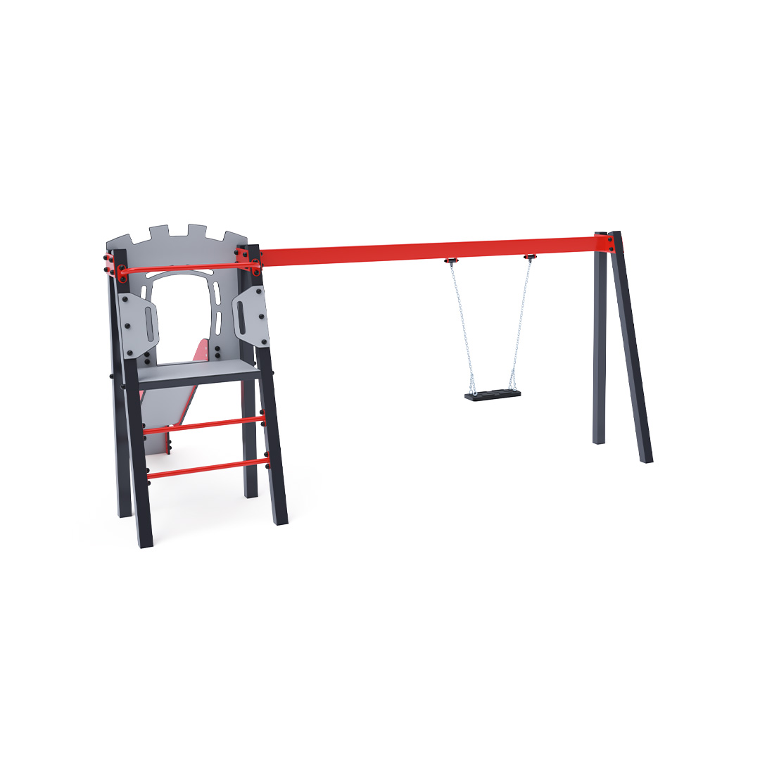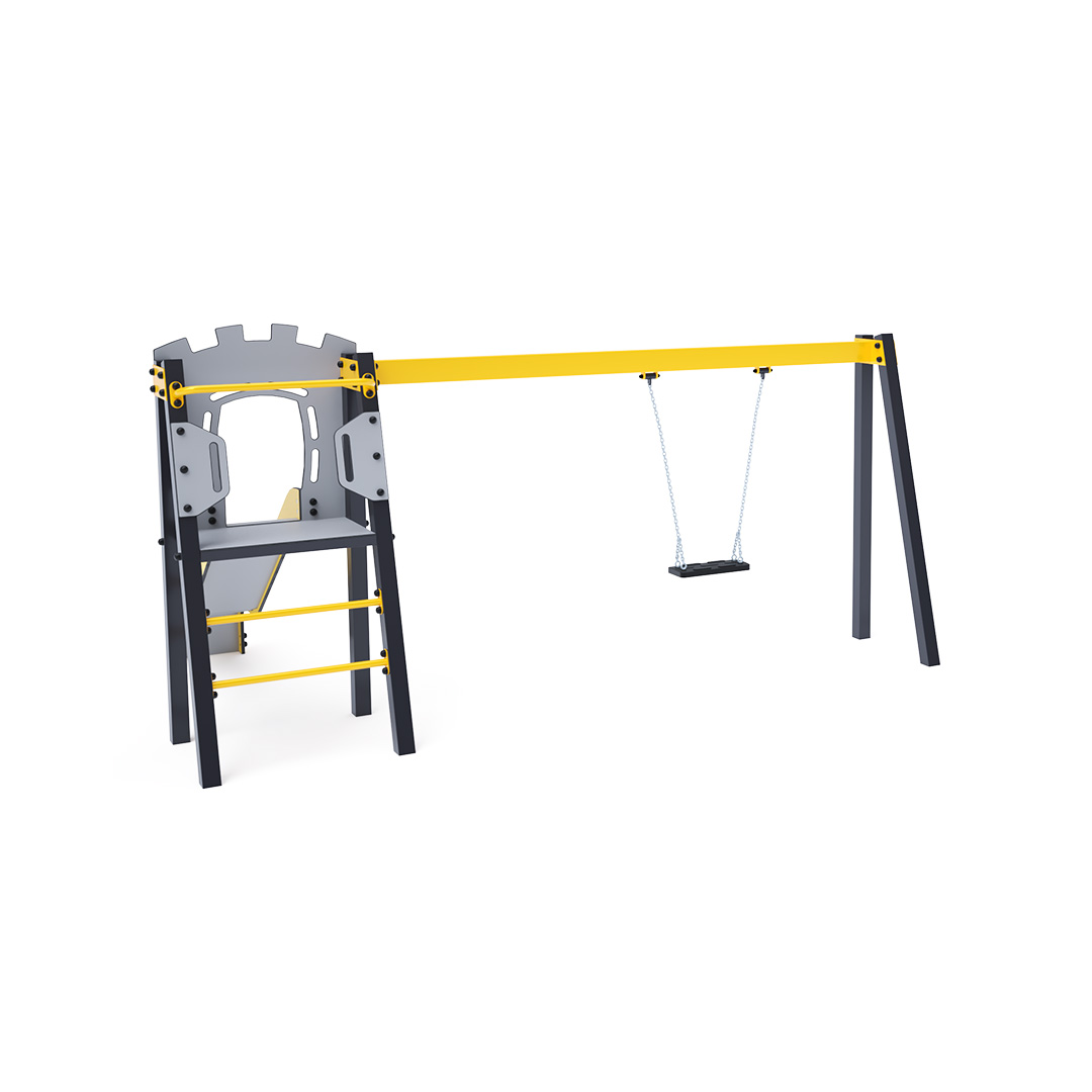 Zertifizierter, wartungsfreier A-förmiger Kletterturm mit geriffeltem Ausstieg und Rutsche, ergänzt durch eine Hängeschaukel mit klassischem Sitz. Die Stahlkonstruktion ist dank Verzinkung und langlebiger Pulverbeschichtung witterungsbeständig. Die verwendeten Materialien HPL und HDPE sind chemikalienbeständig, UV-beständig, farbecht, ungiftig, recycelbar und bruchfest. Es besteht keine Verletzungsgefahr durch scharfe Kanten oder Splitter. Alle Verbindungen sind aus Edelstahl und mit Kunststoffkappen abgedeckt, um Langlebigkeit und Sicherheit zu erhöhen.