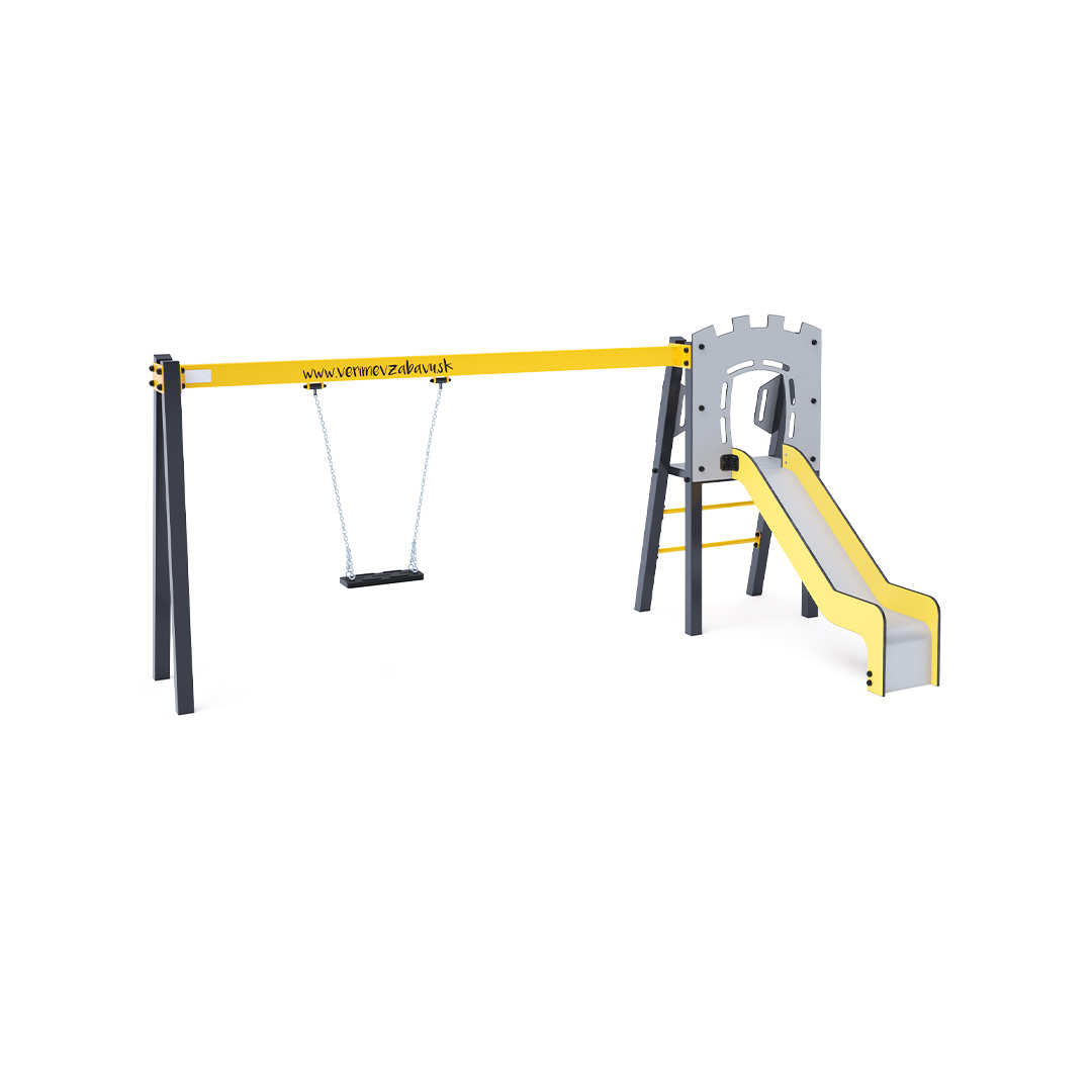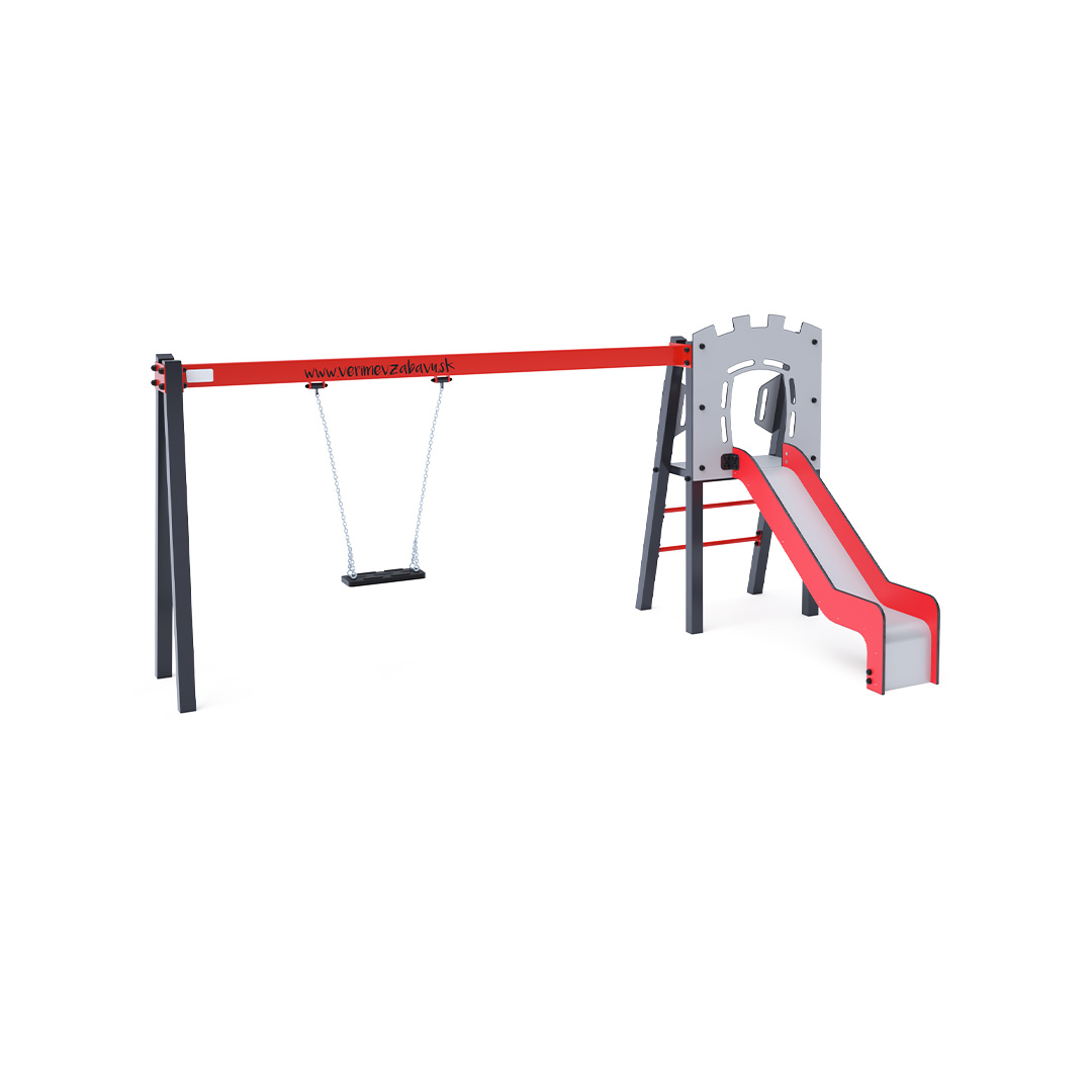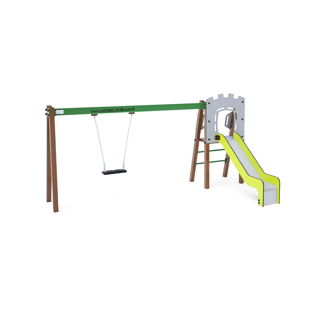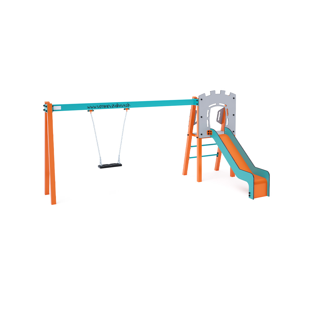 Zertifizierter, wartungsfreier A-förmiger Kletterturm mit geriffeltem Ausstieg und Rutsche, ergänzt durch eine Hängeschaukel mit klassischem Sitz. Die Stahlkonstruktion ist dank Verzinkung und langlebiger Pulverbeschichtung witterungsbeständig. Die verwendeten Materialien HPL und HDPE sind chemikalienbeständig, UV-beständig, farbecht, ungiftig, recycelbar und bruchfest. Es besteht keine Verletzungsgefahr durch scharfe Kanten oder Splitter. Alle Verbindungen sind aus Edelstahl und mit Kunststoffkappen abgedeckt, um Langlebigkeit und Sicherheit zu erhöhen.