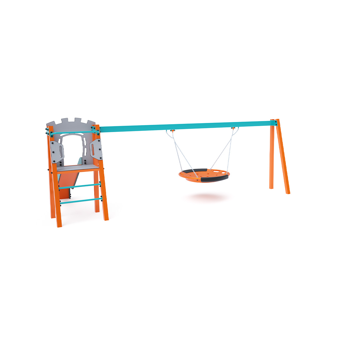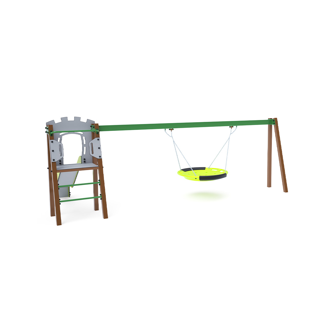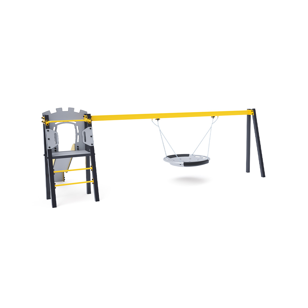 Zertifizierter, wartungsfreier A-förmiger Kletterturm mit geriffeltem Ausstieg und Rutsche, ergänzt durch eine Hängeschaukel mit Nest. Das Nest eignet sich zum gleichzeitigen Schaukeln mehrerer Kinder, auch in ungewöhnlicher, liegender Position. Es verfügt über einen Sicherheitsvorhang mit Sicherheitskette. Die Stahlkonstruktion ist dank Verzinkung und widerstandsfähiger Pulverbeschichtung witterungsbeständig. Die verwendeten Materialien HPL und HDPE sind chemikalienbeständig, UV-beständig, farbecht, ungiftig, recycelbar und bruchfest. Es besteht keine Verletzungsgefahr durch scharfe Kanten oder Splitter. Alle Verbindungen sind aus Edelstahl und mit Kunststoffkappen versehen, um Langlebigkeit und Sicherheit zu erhöhen.