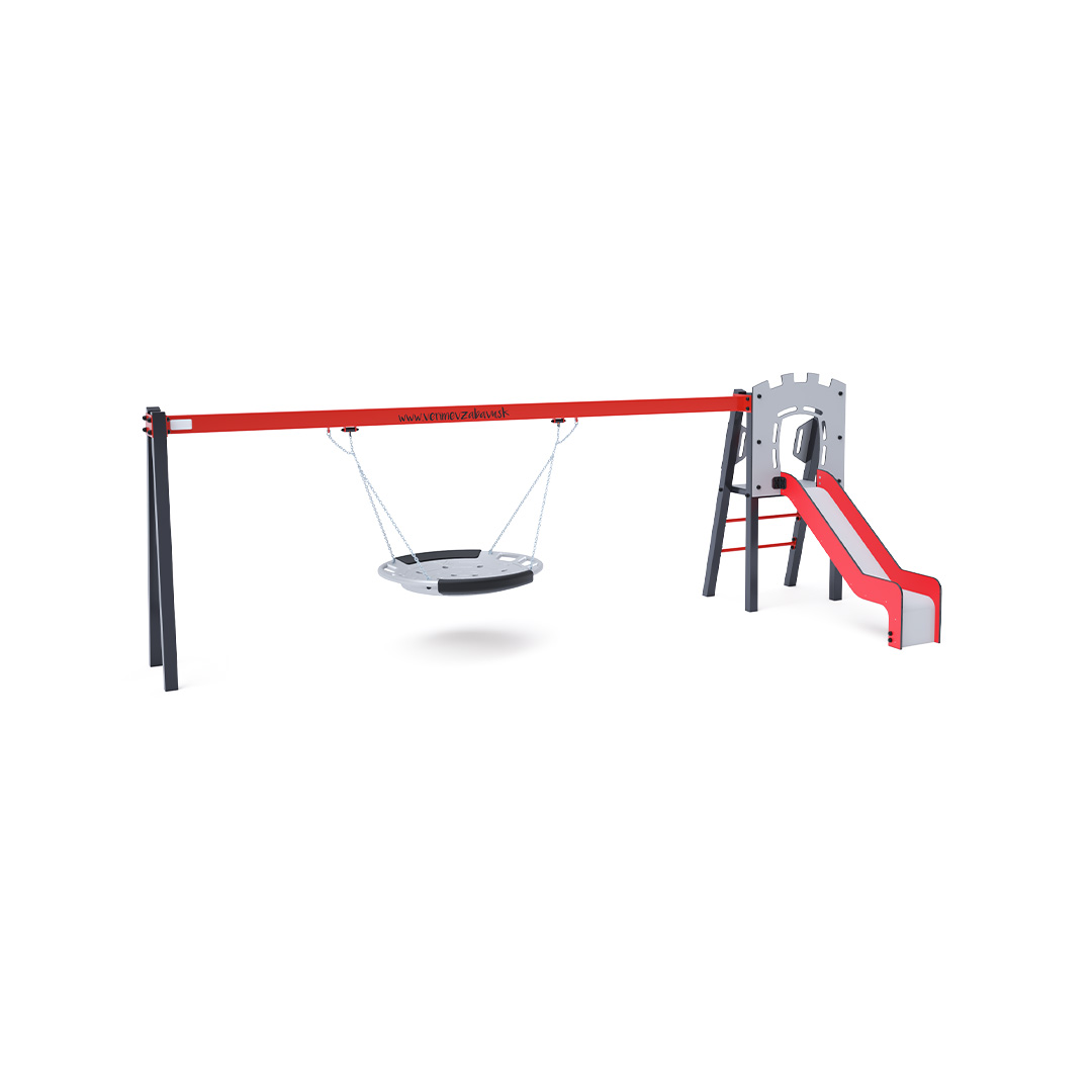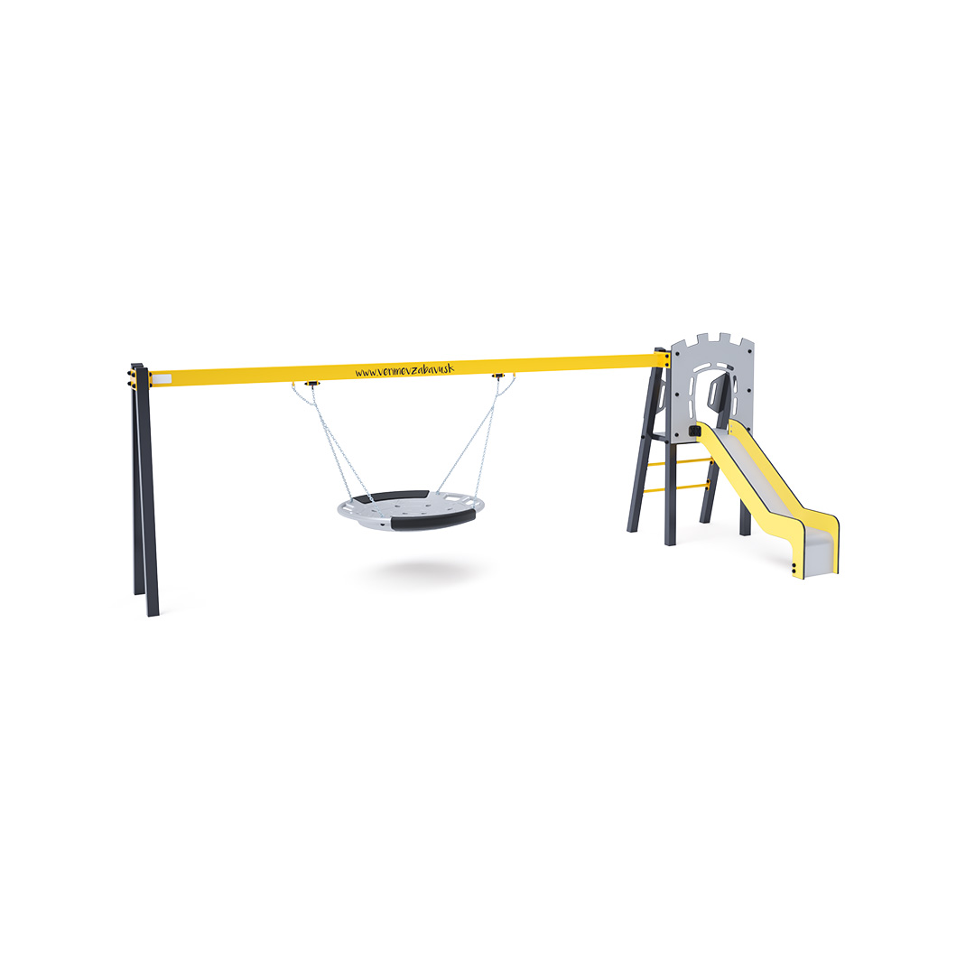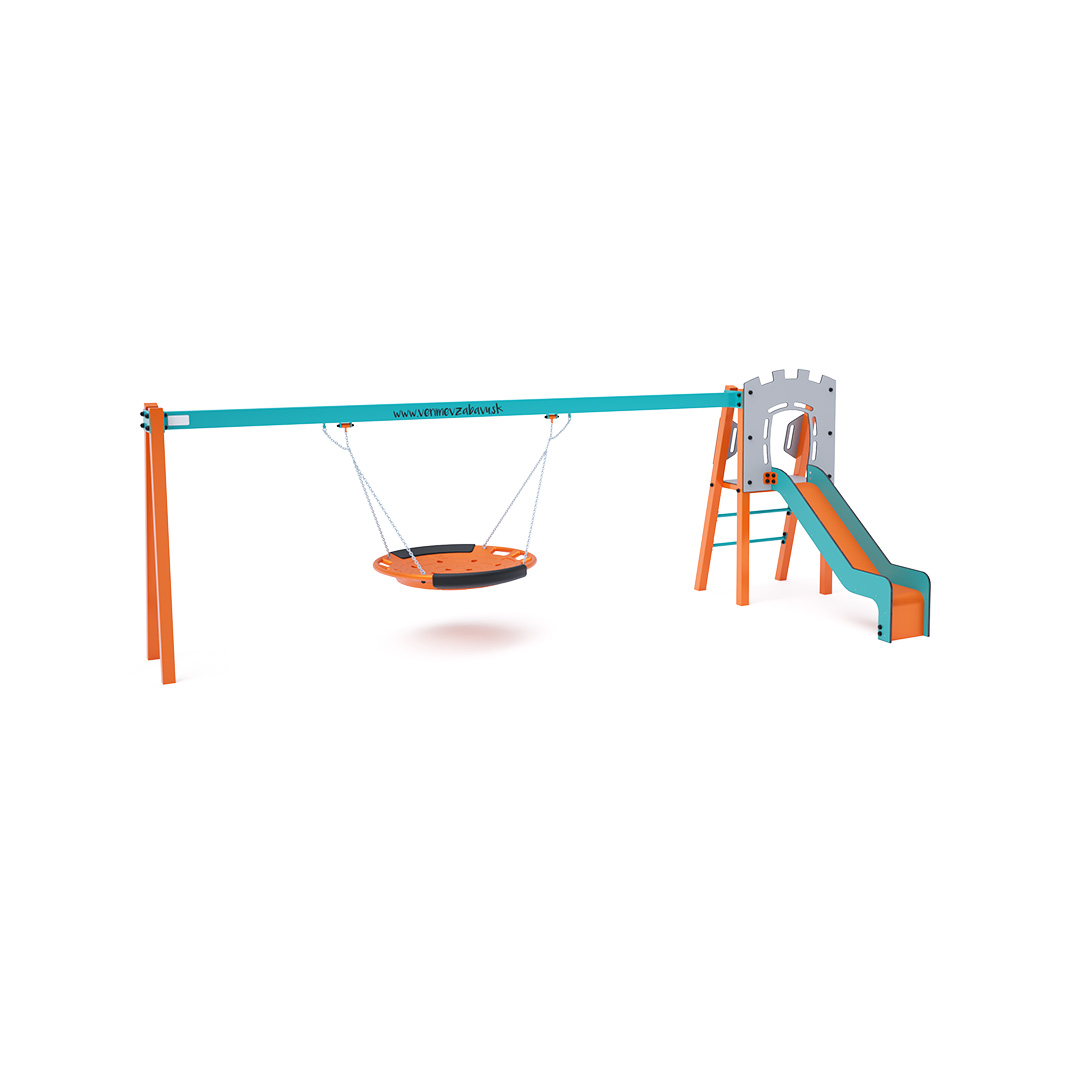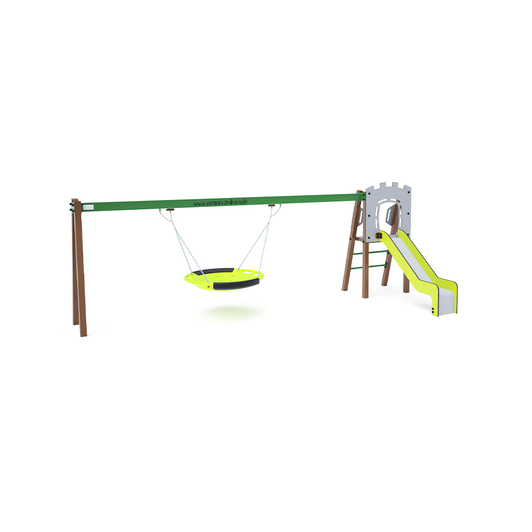 Zertifizierter, wartungsfreier A-förmiger Kletterturm mit geriffeltem Ausstieg und Rutsche, ergänzt durch eine Hängeschaukel mit Nest. Das Nest eignet sich zum gleichzeitigen Schaukeln mehrerer Kinder, auch in ungewöhnlicher, liegender Position. Es verfügt über einen Sicherheitsvorhang mit Sicherheitskette. Die Stahlkonstruktion ist dank Verzinkung und widerstandsfähiger Pulverbeschichtung witterungsbeständig. Die verwendeten Materialien HPL und HDPE sind chemikalienbeständig, UV-beständig, farbecht, ungiftig, recycelbar und bruchfest. Es besteht keine Verletzungsgefahr durch scharfe Kanten oder Splitter. Alle Verbindungen sind aus Edelstahl und mit Kunststoffkappen versehen, um Langlebigkeit und Sicherheit zu erhöhen.