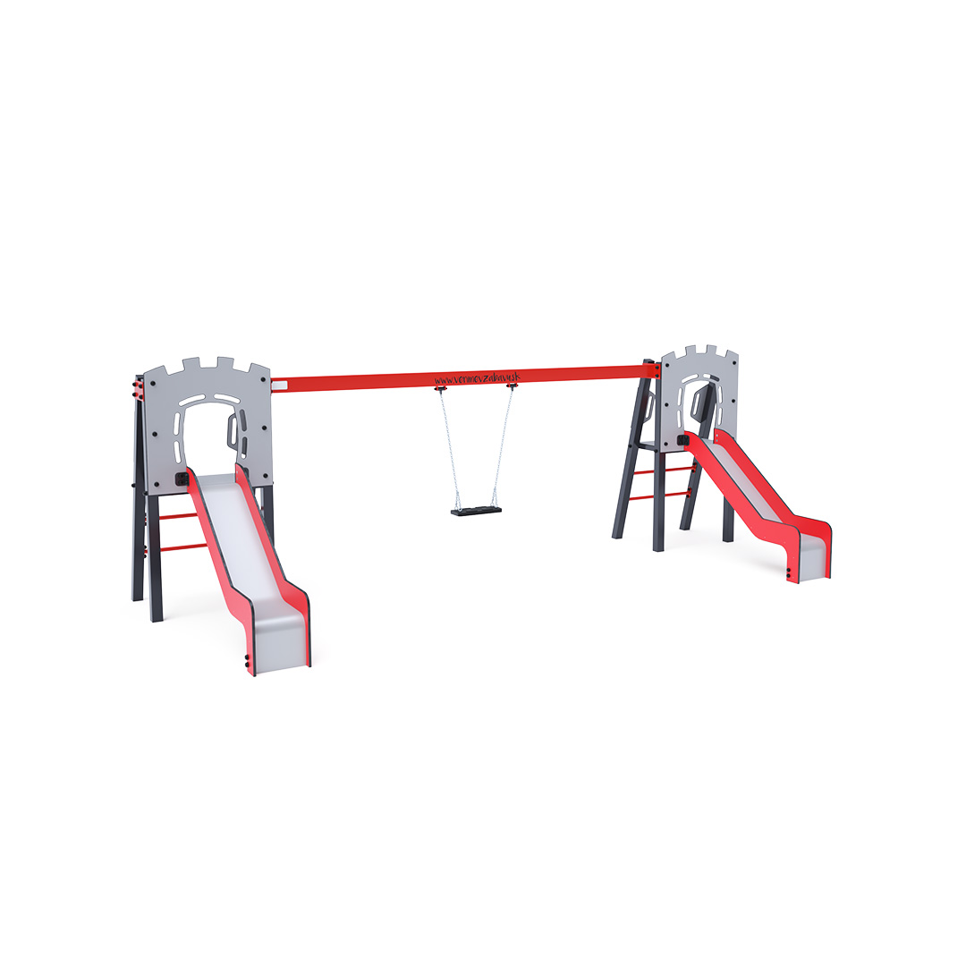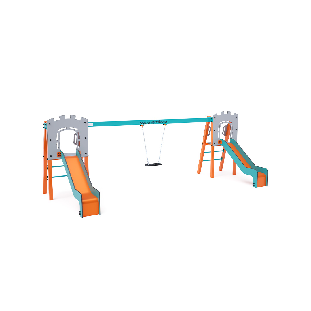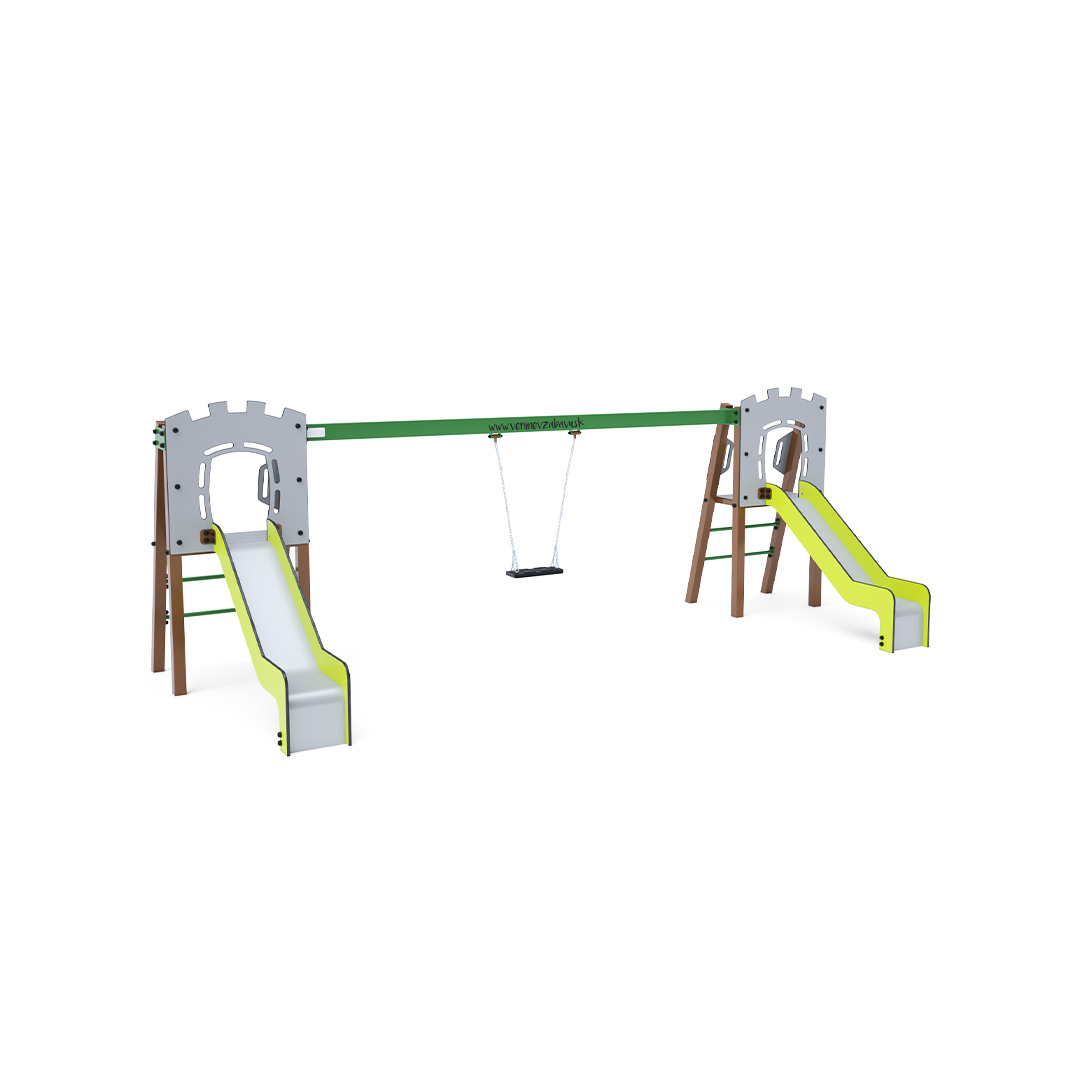 Zwei zertifizierte, wartungsfreie A-förmige Türme mit geriffeltem Ausgang und Rutsche, ergänzt durch eine Hängeschaukel. Sie haben die Wahl zwischen einem klassischen Sitz und einem Babysitz. Der Babysitz verfügt über ein Laufgitter mit einer Querstange zwischen den Beinen des Kindes, die ein Ausrutschen oder Stürzen verhindert. Gleichzeitig kann das Kind sich anlehnen. Die Stahlkonstruktion ist dank Verzinkung und widerstandsfähiger Pulverbeschichtung witterungsbeständig. Die verwendeten Materialien HPL und HDPE sind chemikalienbeständig, UV-beständig, farbecht, ungiftig, recycelbar und bruchfest. Es besteht keine Verletzungsgefahr durch scharfe Kanten oder Splitter.
