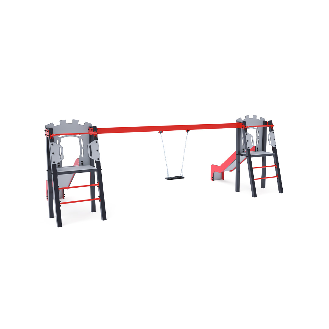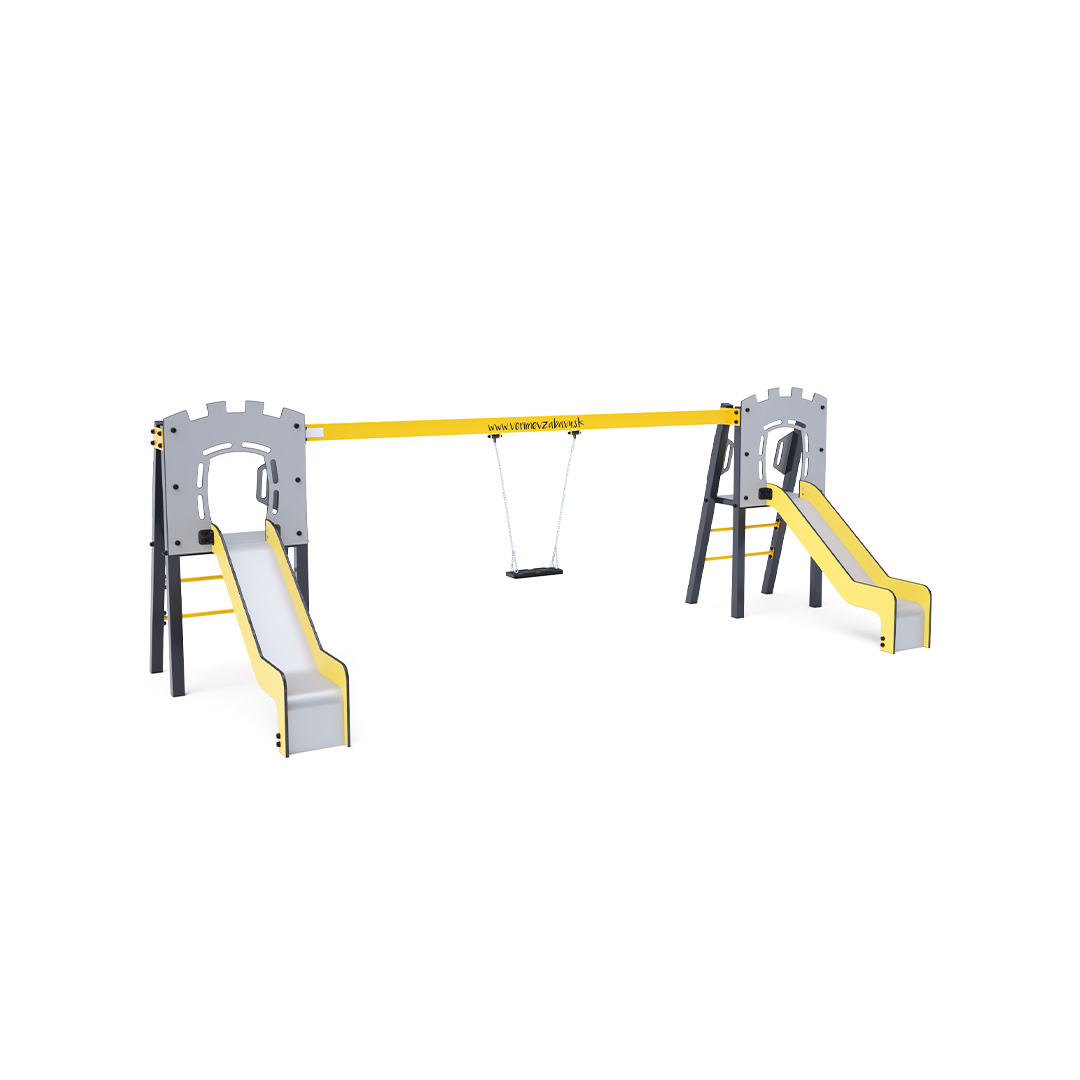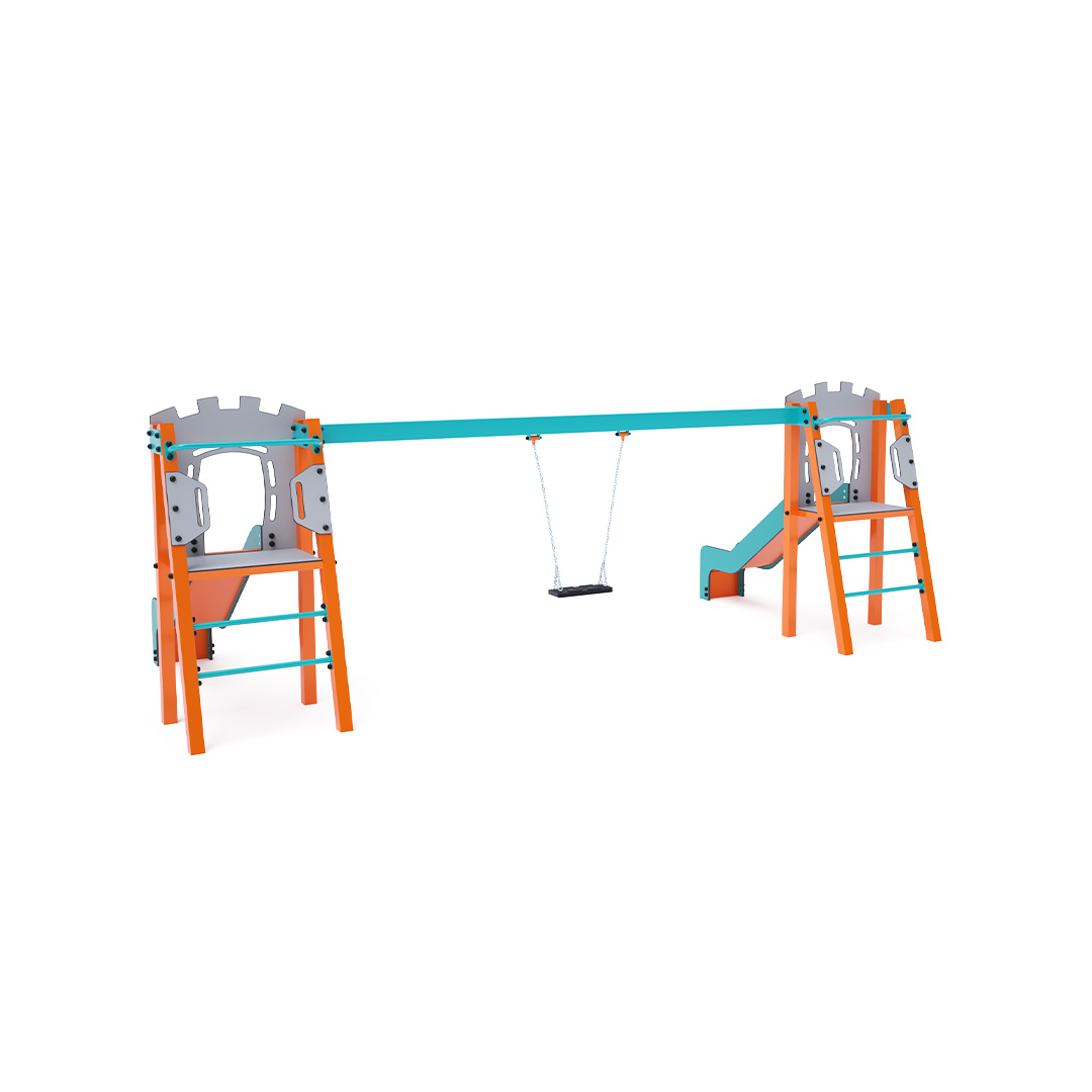 Zwei zertifizierte, wartungsfreie A-förmige Türme mit geriffeltem Ausgang und Rutsche, ergänzt durch eine Hängeschaukel. Sie haben die Wahl zwischen einem klassischen Sitz und einem Babysitz. Der Babysitz verfügt über ein Laufgitter mit einer Querstange zwischen den Beinen des Kindes, die ein Ausrutschen oder Stürzen verhindert. Gleichzeitig kann das Kind sich anlehnen. Die Stahlkonstruktion ist dank Verzinkung und widerstandsfähiger Pulverbeschichtung witterungsbeständig. Die verwendeten Materialien HPL und HDPE sind chemikalienbeständig, UV-beständig, farbecht, ungiftig, recycelbar und bruchfest. Es besteht keine Verletzungsgefahr durch scharfe Kanten oder Splitter.