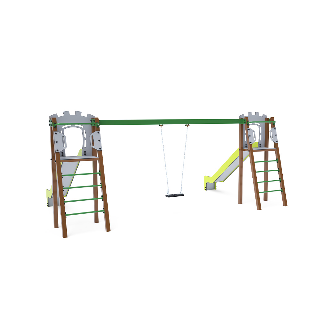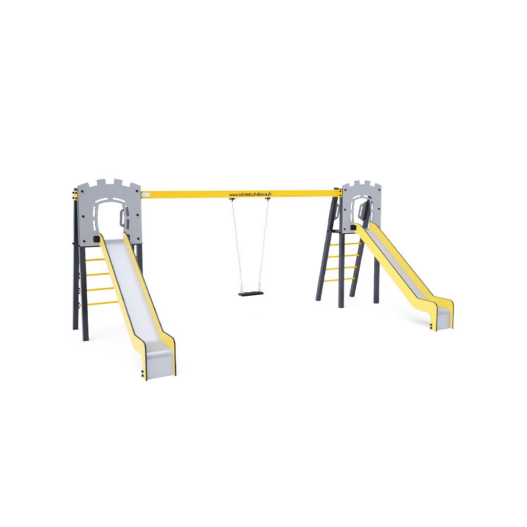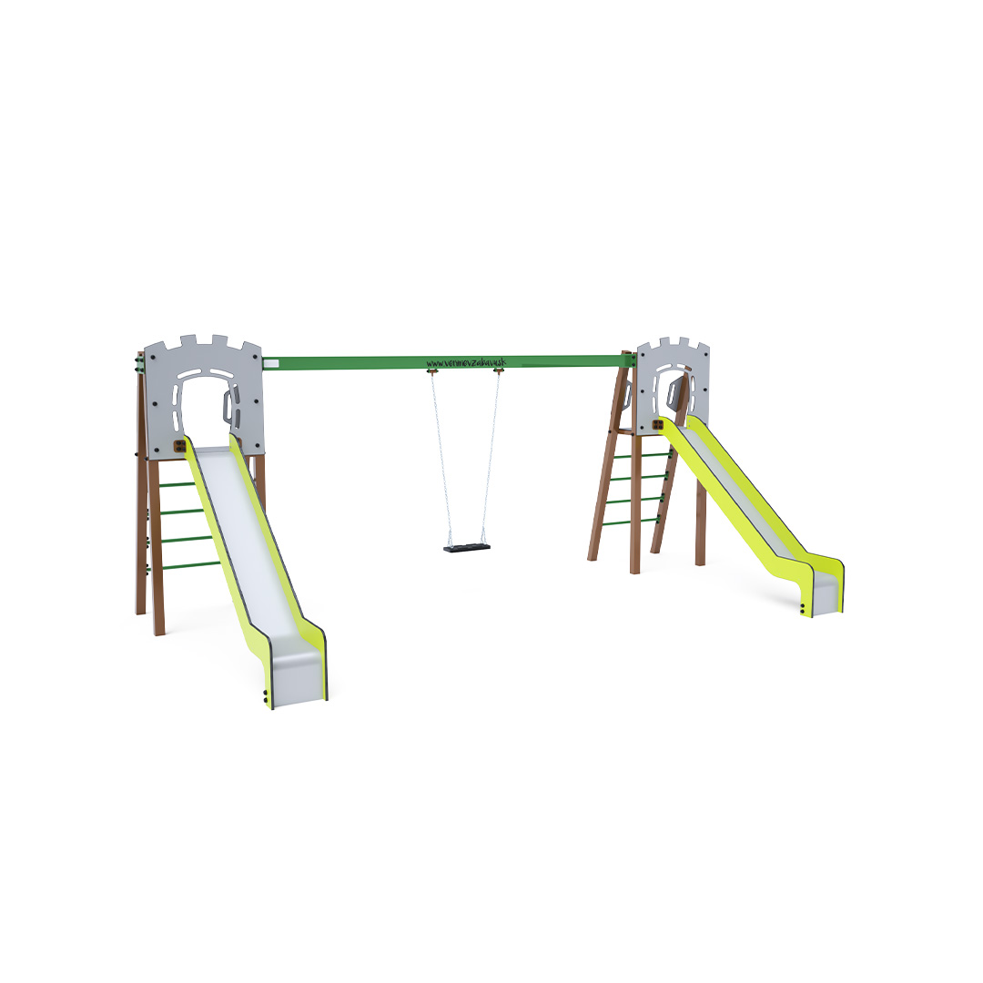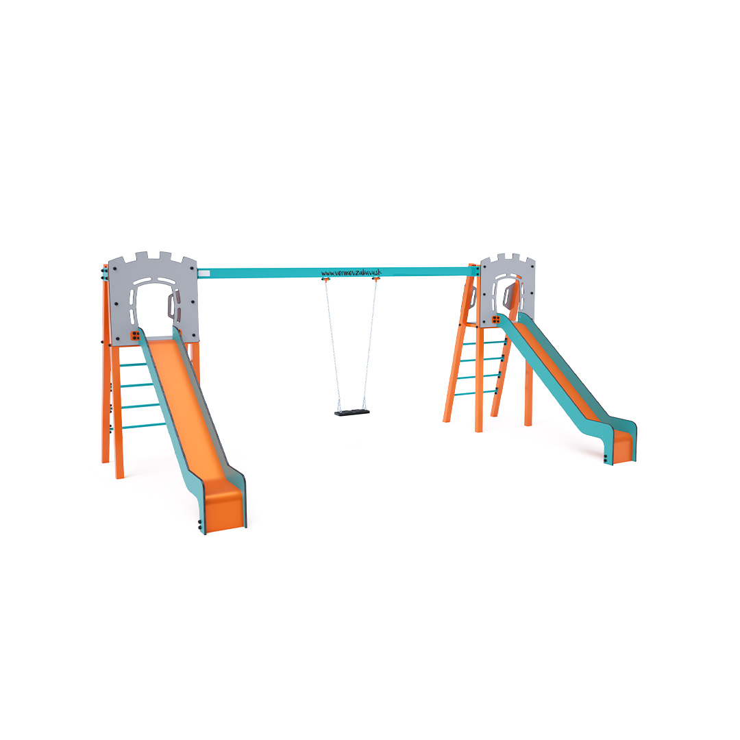 Zwei zertifizierte, wartungsfreie A-förmige Türme mit geriffeltem Ausgang und Rutsche, ergänzt durch eine Hängeschaukel. Sie haben die Wahl zwischen einem klassischen Sitz und einem Babysitz. Der Babysitz verfügt über ein Laufgitter mit einer Querstange zwischen den Beinen des Kindes, die ein Ausrutschen oder Stürzen verhindert. Gleichzeitig kann das Kind sich anlehnen. Die Stahlkonstruktion ist dank Verzinkung und widerstandsfähiger Pulverbeschichtung witterungsbeständig. Die verwendeten Materialien HPL und HDPE sind chemikalienbeständig, UV-beständig, farbecht, ungiftig, recycelbar und bruchfest. Es besteht keine Verletzungsgefahr durch scharfe Kanten oder Splitter.