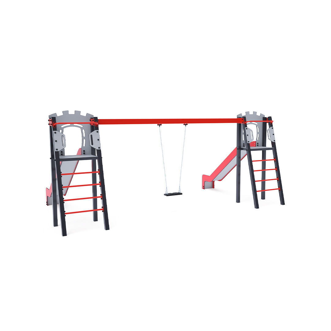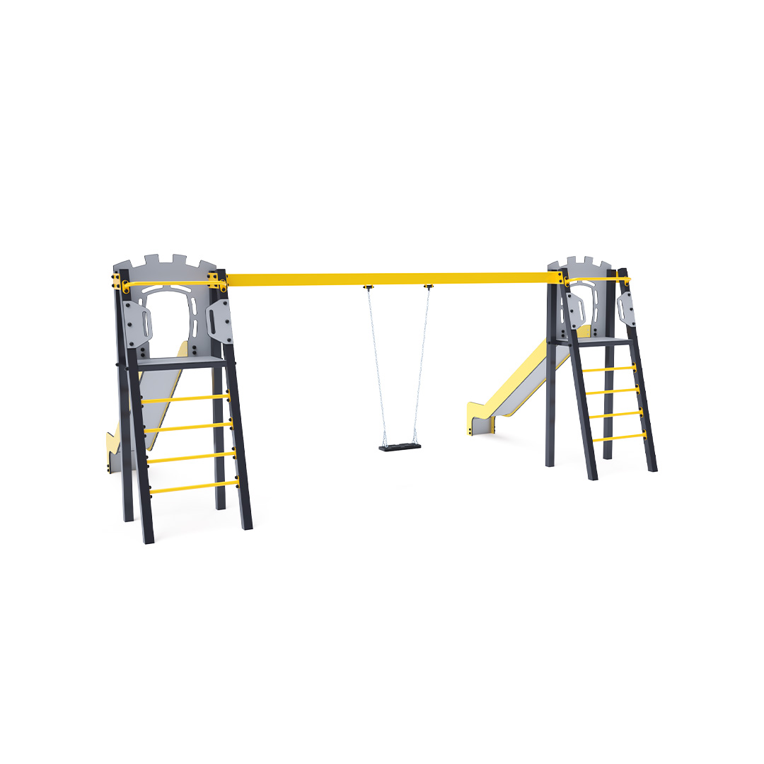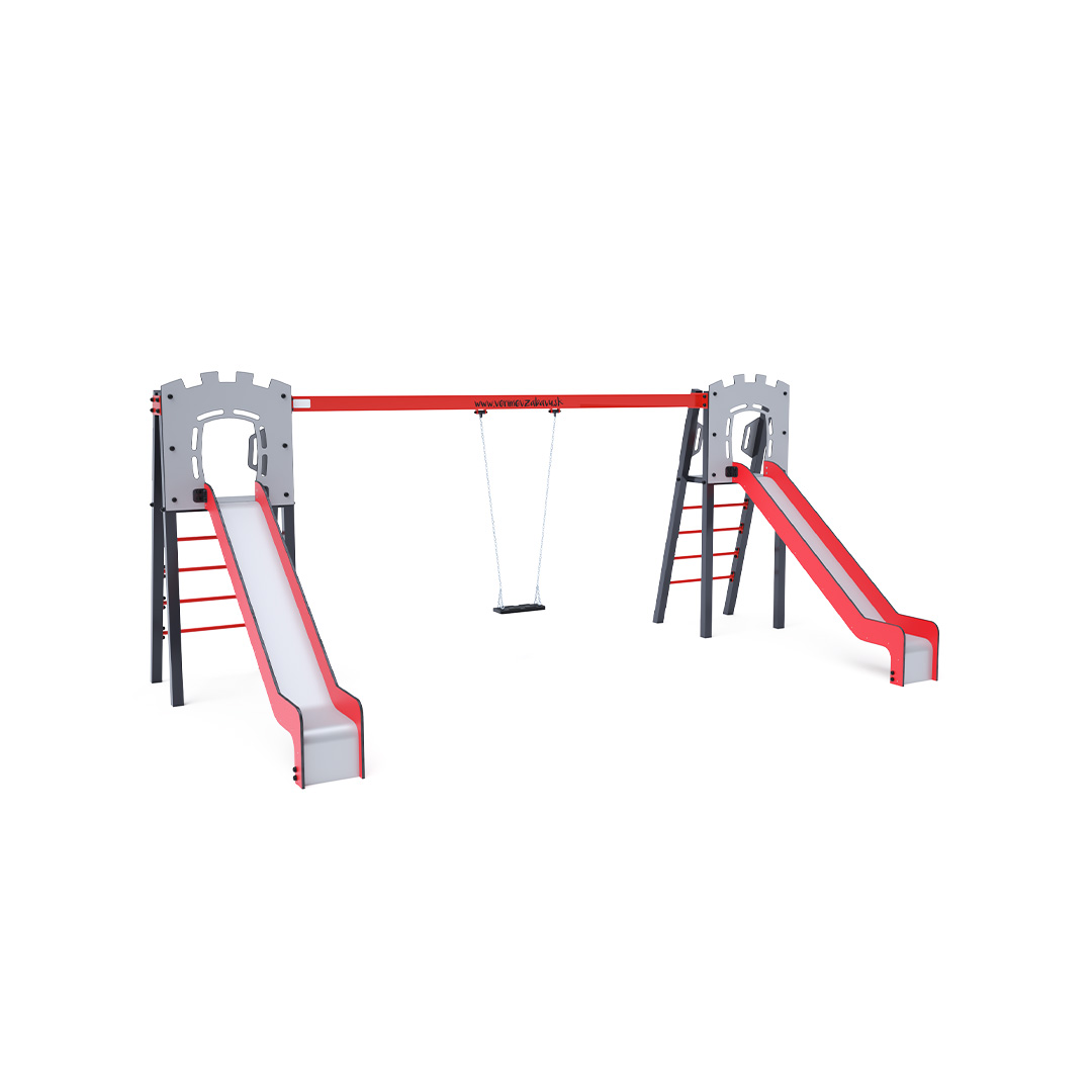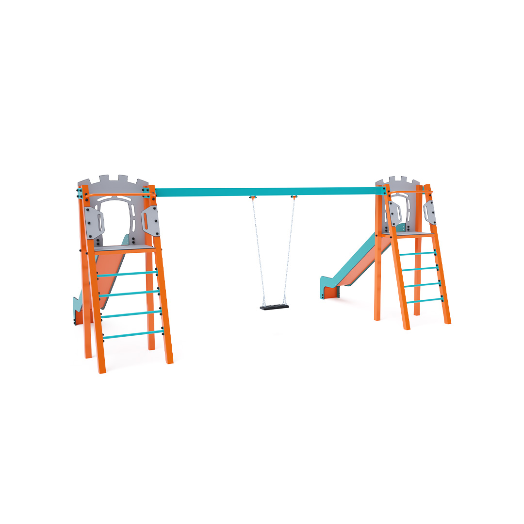 Zwei zertifizierte, wartungsfreie A-förmige Türme mit geriffeltem Ausgang und Rutsche, ergänzt durch eine Hängeschaukel. Sie haben die Wahl zwischen einem klassischen Sitz und einem Babysitz. Der Babysitz verfügt über ein Laufgitter mit einer Querstange zwischen den Beinen des Kindes, die ein Ausrutschen oder Stürzen verhindert. Gleichzeitig kann das Kind sich anlehnen. Die Stahlkonstruktion ist dank Verzinkung und widerstandsfähiger Pulverbeschichtung witterungsbeständig. Die verwendeten Materialien HPL und HDPE sind chemikalienbeständig, UV-beständig, farbecht, ungiftig, recycelbar und bruchfest. Es besteht keine Verletzungsgefahr durch scharfe Kanten oder Splitter.