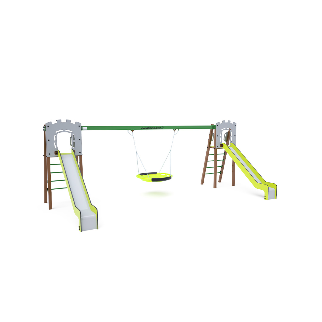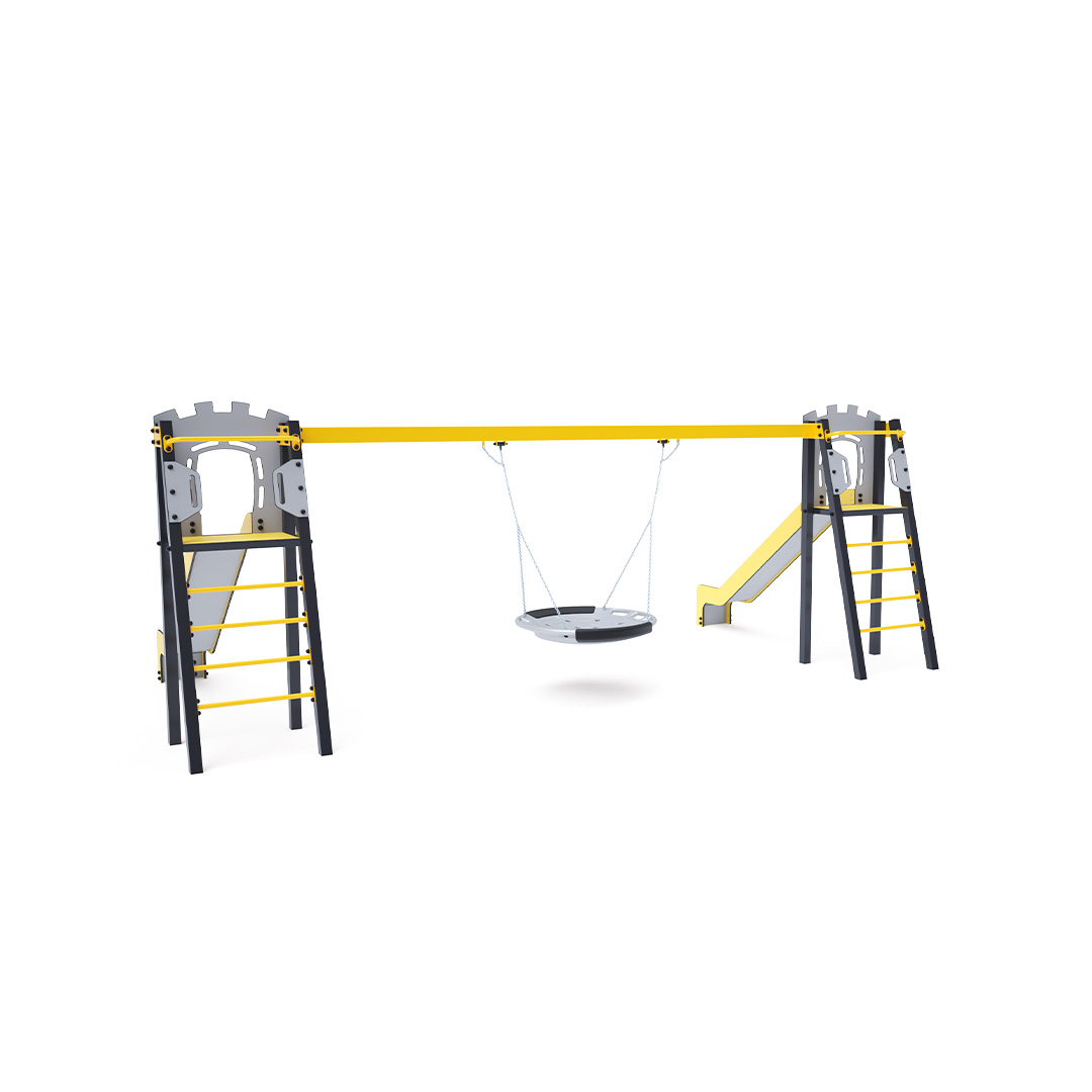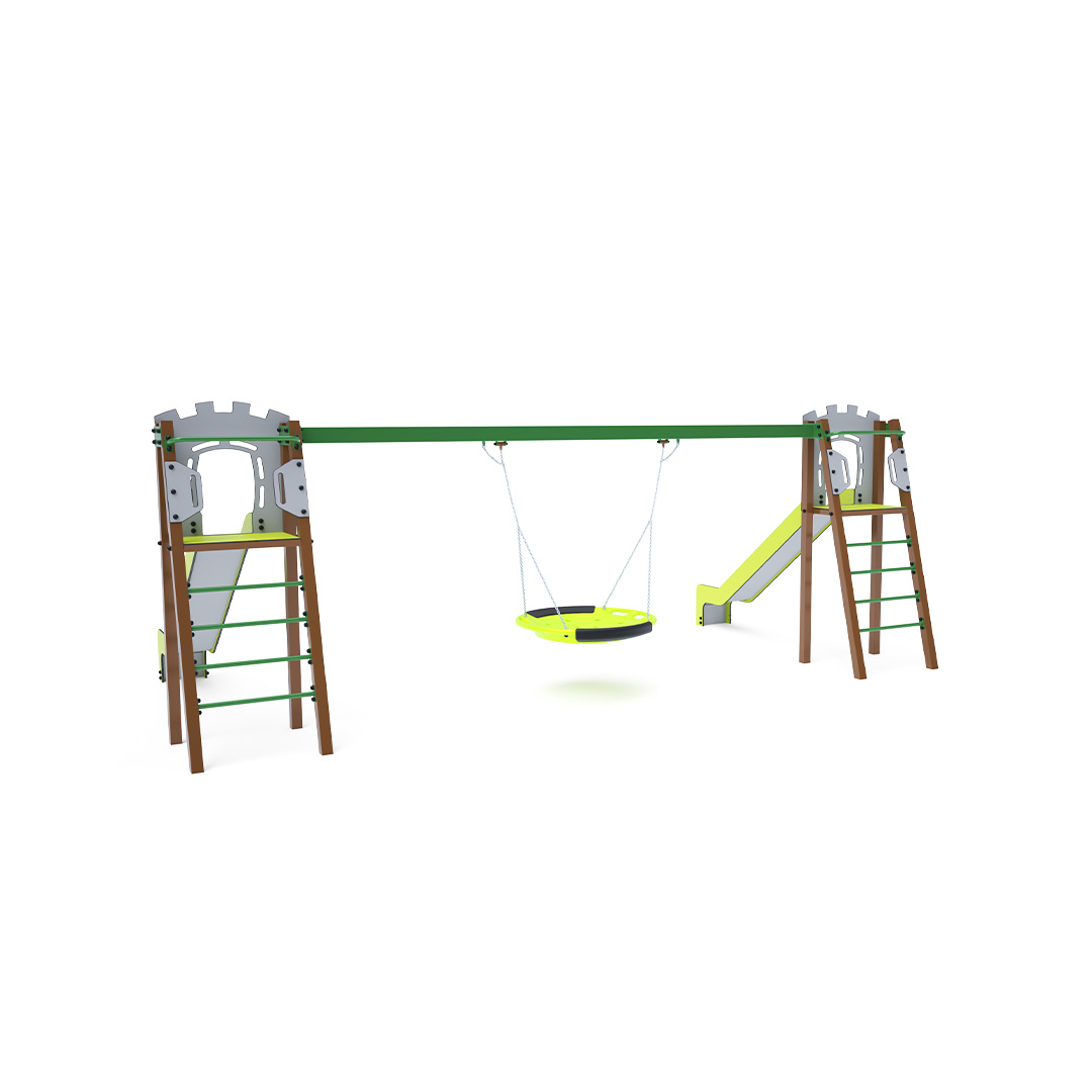 Zwei zertifizierte, wartungsfreie A-förmige Türme mit geriffeltem Ausstieg und Rutsche, komplett mit Schaukel und Schaukelnest. Das Nest bietet Platz für mehrere Kinder gleichzeitig, auch in ungewöhnlicher Liegeposition. Es verfügt über ein Sicherheitsgelenk mit Sicherheitskette. Die Stahlkonstruktion ist dank Feuerverzinkung und widerstandsfähiger Pulverbeschichtung witterungsbeständig. Die verwendeten Materialien HPL und HDPE sind chemikalienbeständig, UV-beständig, farbecht, ungiftig, recycelbar und bruchfest. Es besteht keine Verletzungsgefahr durch scharfe Kanten oder Splitter.