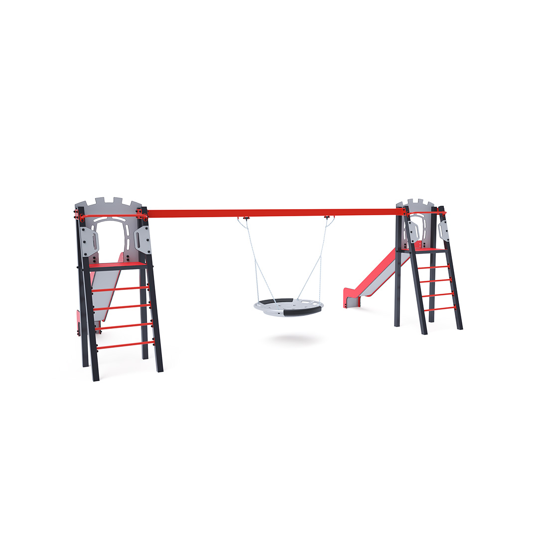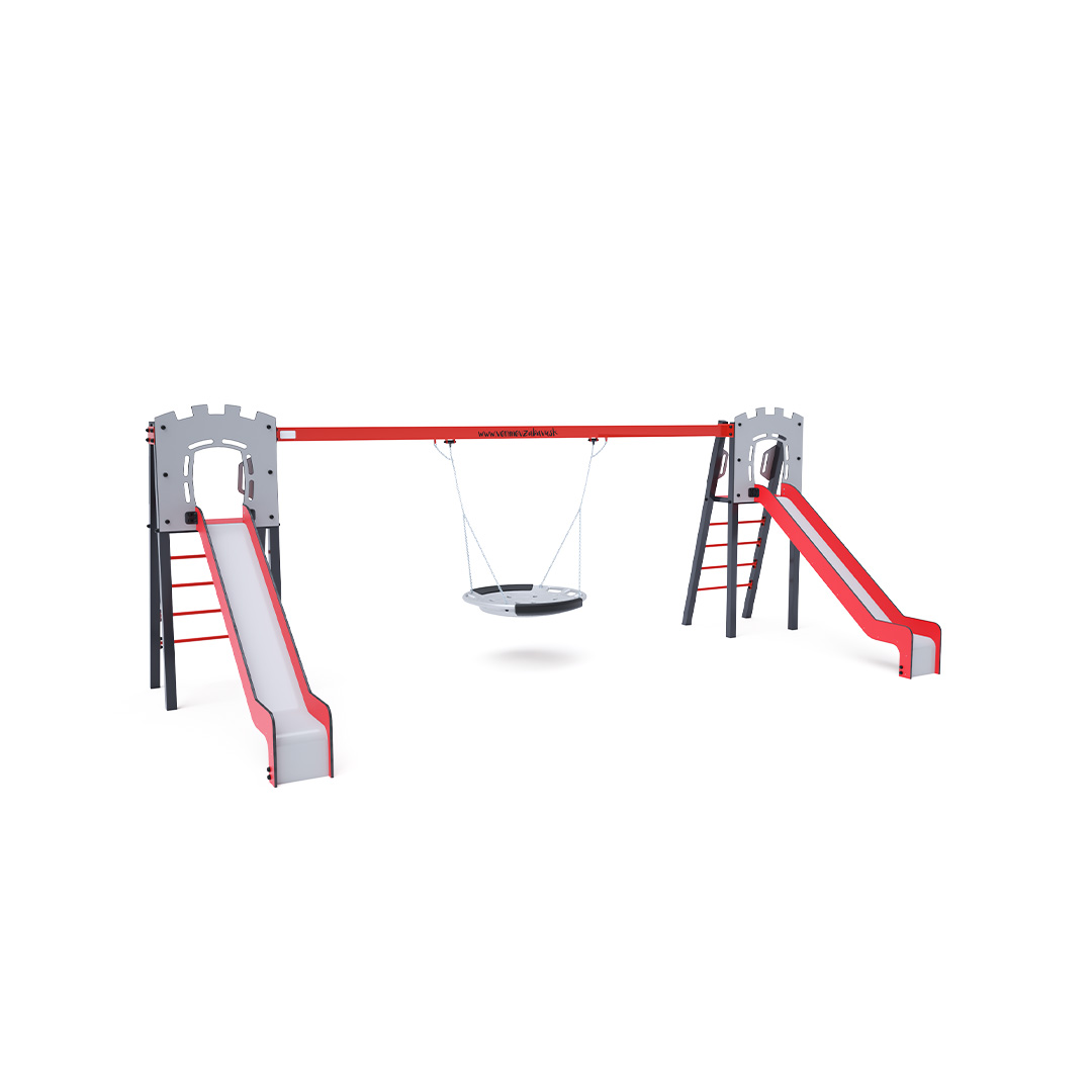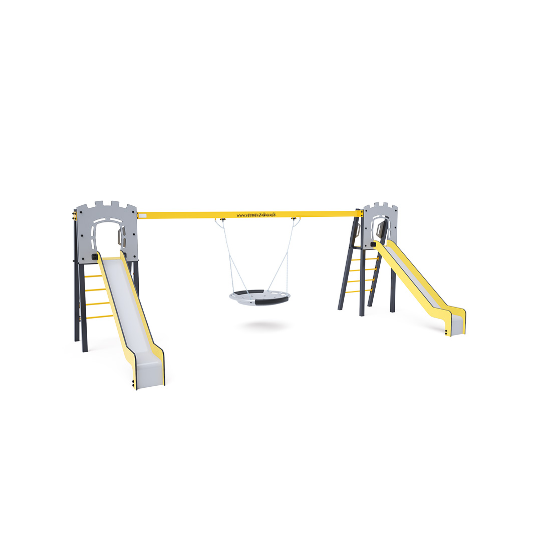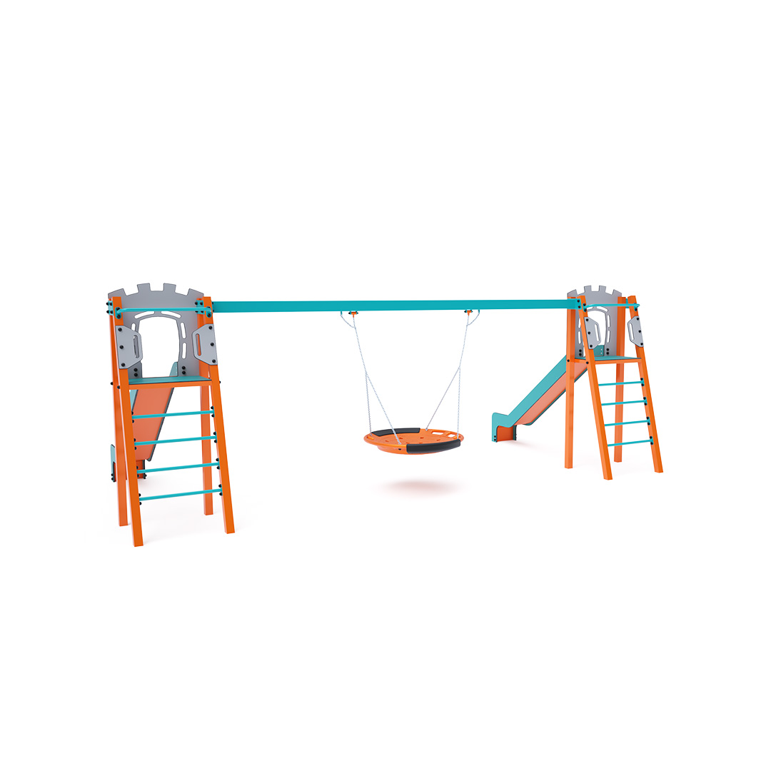 Zwei zertifizierte, wartungsfreie A-förmige Türme mit geriffeltem Ausstieg und Rutsche, komplett mit Schaukel und Schaukelnest. Das Nest bietet Platz für mehrere Kinder gleichzeitig, auch in ungewöhnlicher Liegeposition. Es verfügt über ein Sicherheitsgelenk mit Sicherheitskette. Die Stahlkonstruktion ist dank Feuerverzinkung und widerstandsfähiger Pulverbeschichtung witterungsbeständig. Die verwendeten Materialien HPL und HDPE sind chemikalienbeständig, UV-beständig, farbecht, ungiftig, recycelbar und bruchfest. Es besteht keine Verletzungsgefahr durch scharfe Kanten oder Splitter.