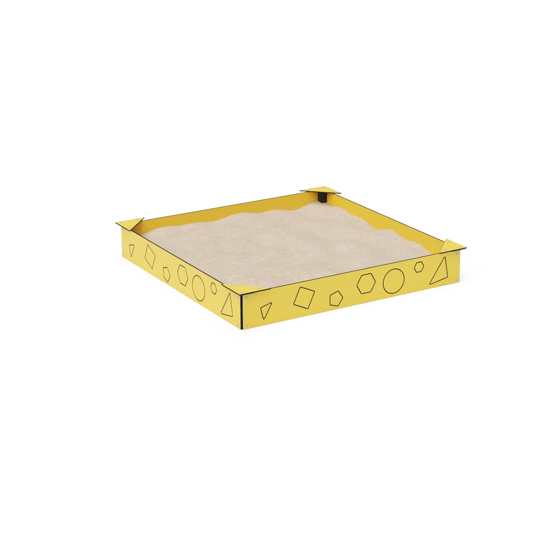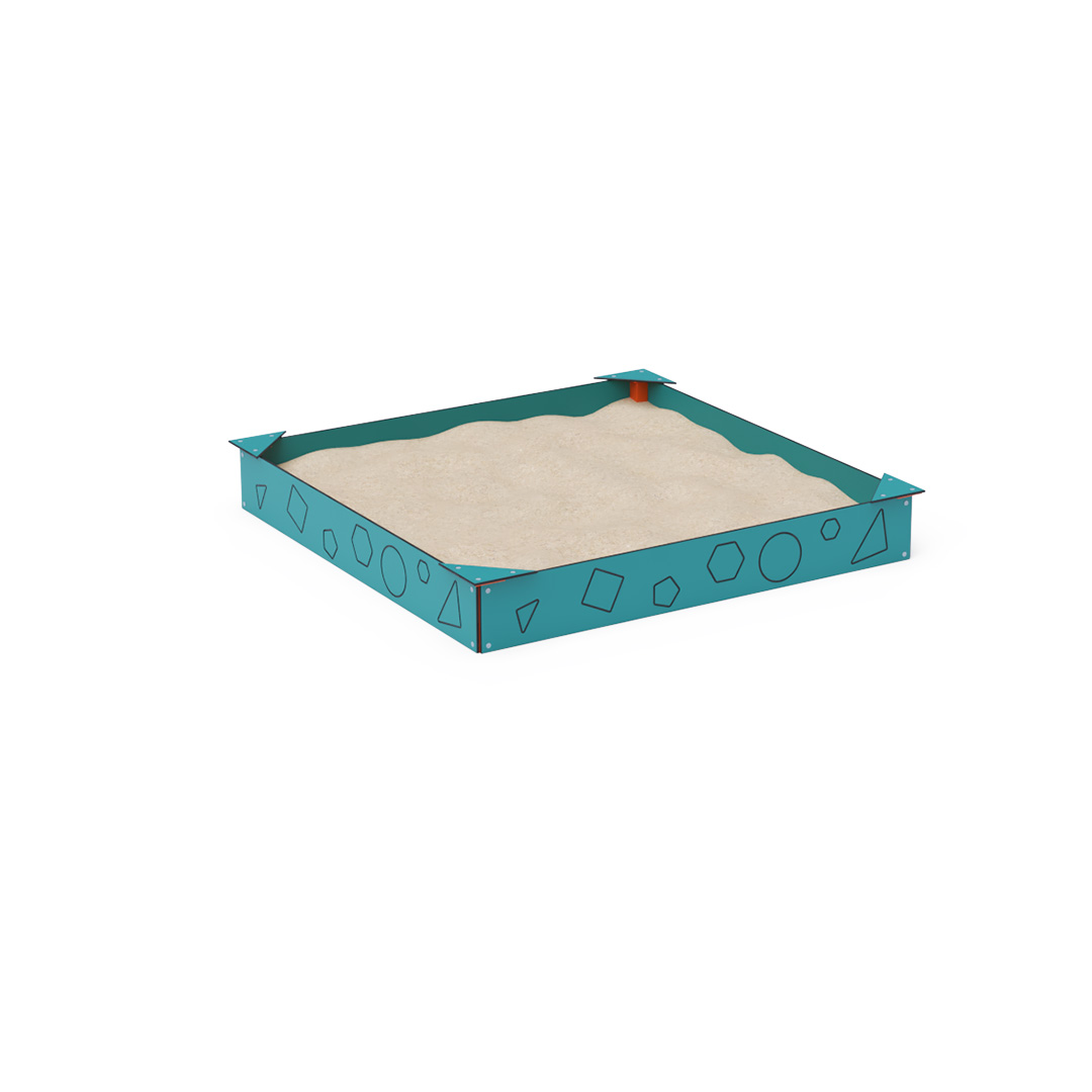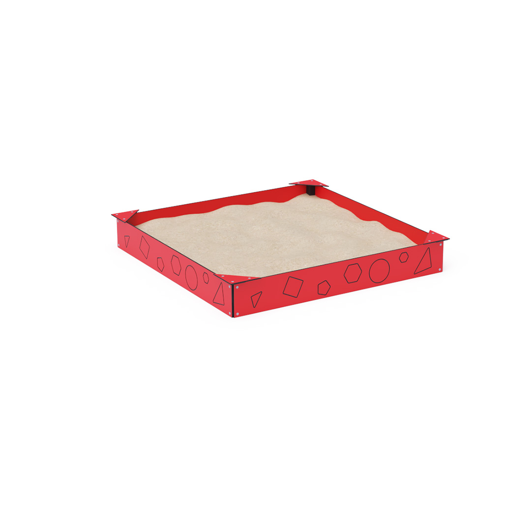 Der wartungsfreie Sandkasten mit einer Grundfläche von 2 × 2 Metern verfügt über einen 10 mm dicken HPL-Streifen am Rand, der das Herausfallen von Sand verhindert. Auf dem Streifen sind verschiedene geometrische Formen abgebildet. In den Ecken des Sandkastens befinden sich vier dreieckige Sitze, die sich für Kinder oder Eltern eignen. Die Sandkastenkonstruktion besteht aus verzinktem und pulverbeschichtetem Stahl. Sie ist auf Langlebigkeit und Sicherheit ausgelegt. Der Sandkasten wird standardmäßig ohne Sand geliefert.