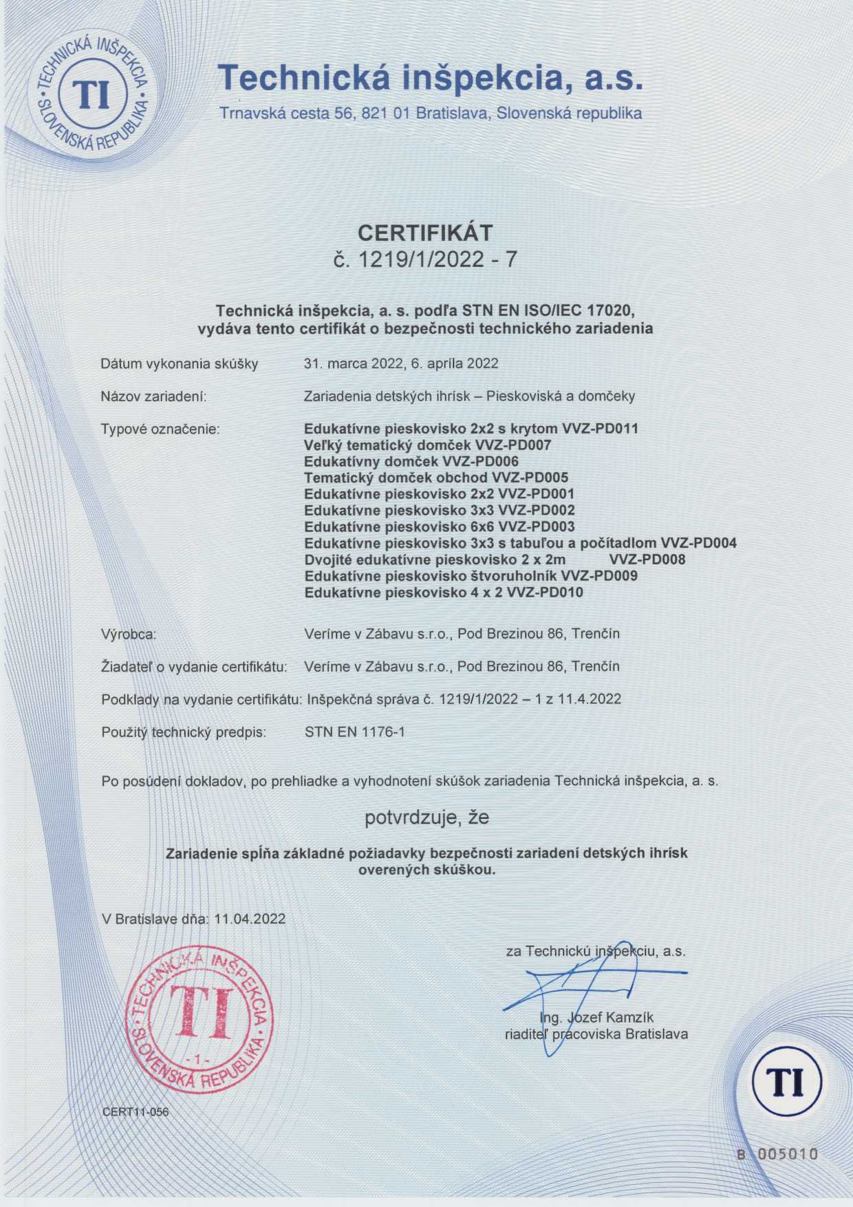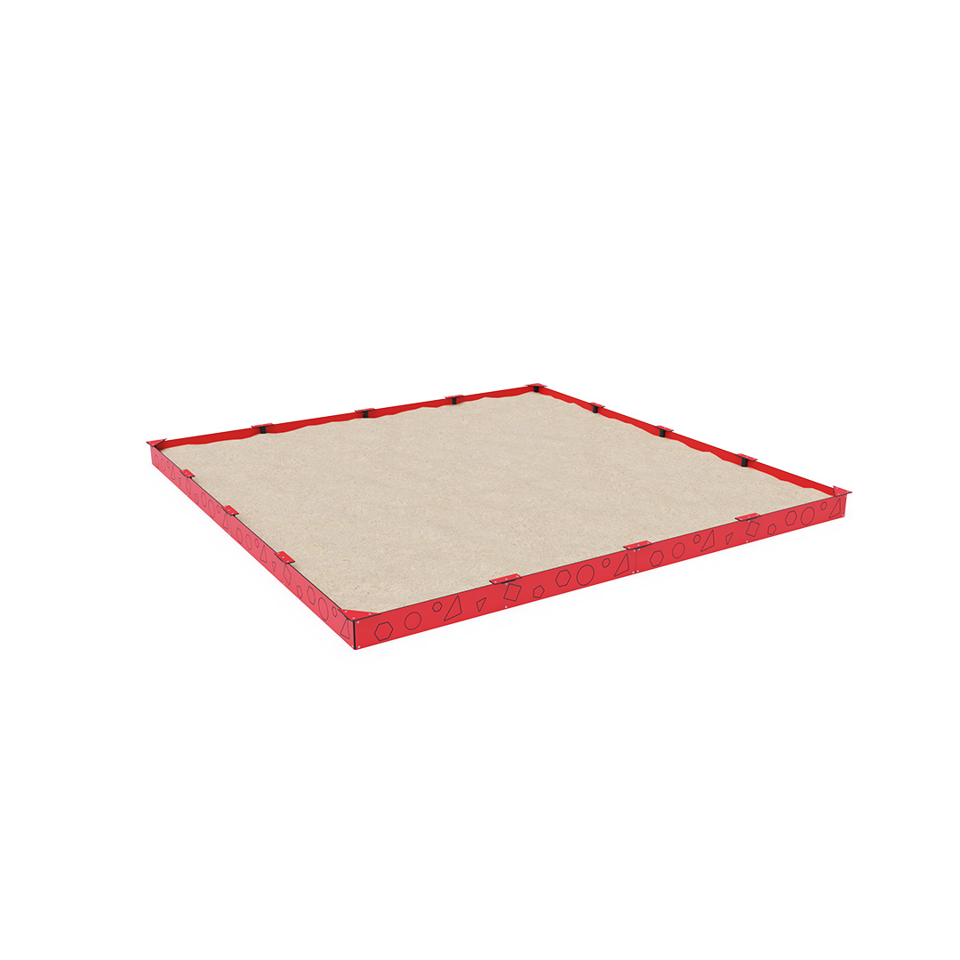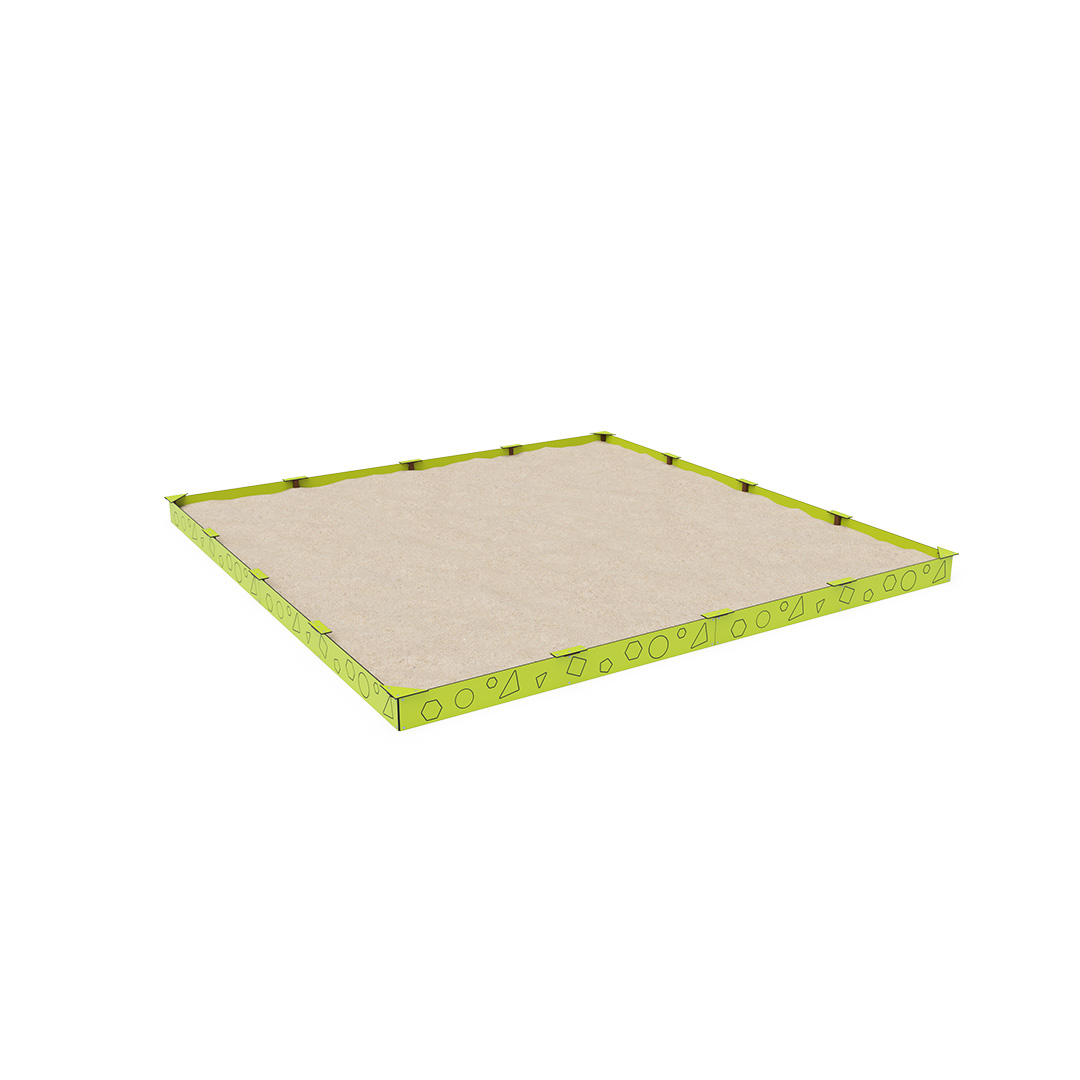 Der wartungsfreie Sandkasten mit einer Fläche von 6 × 6 Metern verfügt über einen 10 mm dicken HPL-Streifen am Rand, der das Herausfallen von Sand verhindert. Auf dem Streifen sind verschiedene geometrische Formen abgebildet. In den Ecken des Sandkastens befinden sich vier dreieckige Sitze und in der Mitte der Seitenwände ein rechteckiger Sitz, der sowohl für Kinder als auch für Eltern geeignet ist. Die Sandkastenkonstruktion besteht aus verzinktem und pulverbeschichtetem Stahl. Sie ist auf Langlebigkeit und Sicherheit ausgelegt. Die Seitenwände und Sitze sind aus HPL gefertigt, einem chemikalienbeständigen, UV-beständigen, ungiftigen, recycelbaren und bruchfesten Material. Es besteht keine Verletzungsgefahr durch scharfe Kanten oder Splitter. Der Sandkasten wird standardmäßig ohne Sand geliefert.