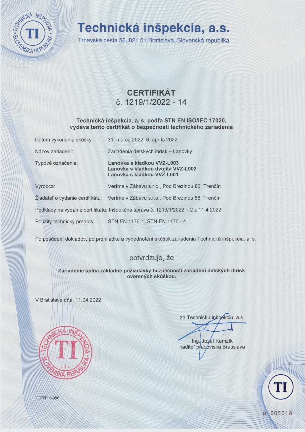 Die Seilbahn VVZ-L003 mit Seilzug ist nach der Norm STN EN 1176