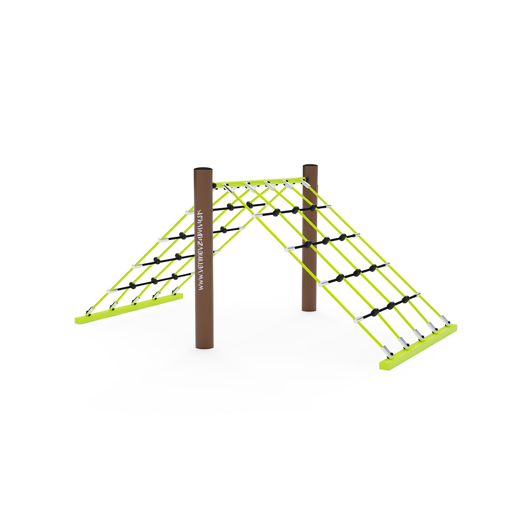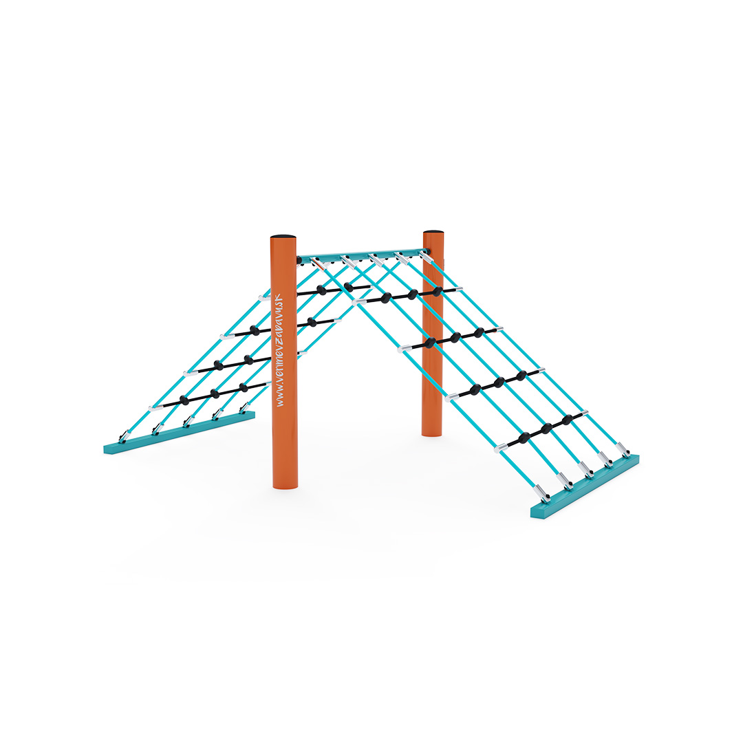 Seilspiel – ein hoher Berg, der sofort erklommen werden will. Der Fantasie der Kinder sind keine Grenzen gesetzt: Sie können in die Rollen von Kletterern, Indianern oder Stuntmen schlüpfen. Das Seilspielelement besteht aus verzinktem Stahl mit einer hochwertigen Oberflächenveredelung. Die Verbindungsstücke sind aus Edelstahl gefertigt und mit Kunststoffkappen versehen, um die Sicherheit und Langlebigkeit zu erhöhen. Die Seile bestehen aus Polyesterfasern, die um den Kern gewickelt sind. Diese Konstruktion erhöht die Festigkeit und Widerstandsfähigkeit gegen mechanische Belastung. Polyester selbst besitzt viele positive Eigenschaften: Es ist resistent gegen Mikroorganismen, witterungsbeständig, trocknet schnell nach Regen, ist farbecht und zeichnet sich durch hohe Festigkeit aus.