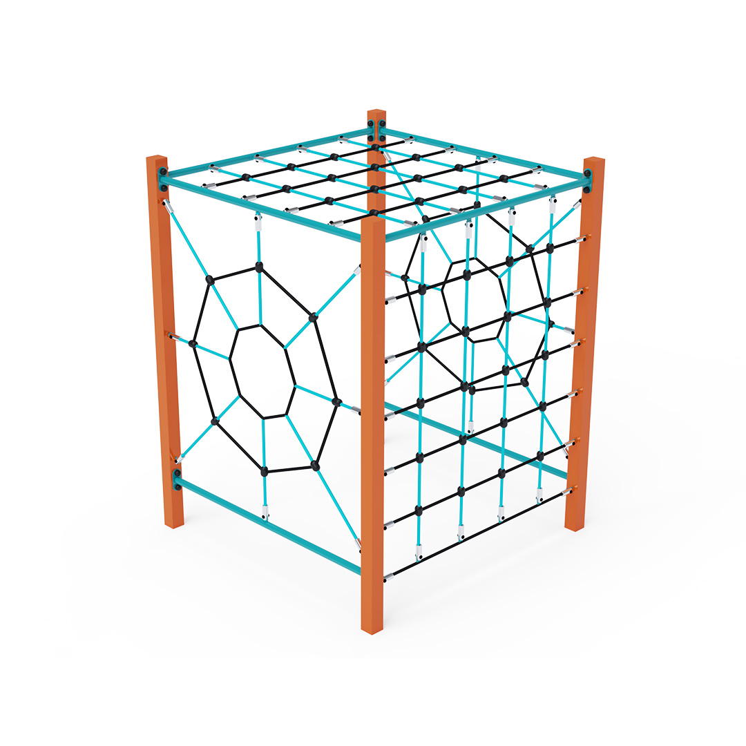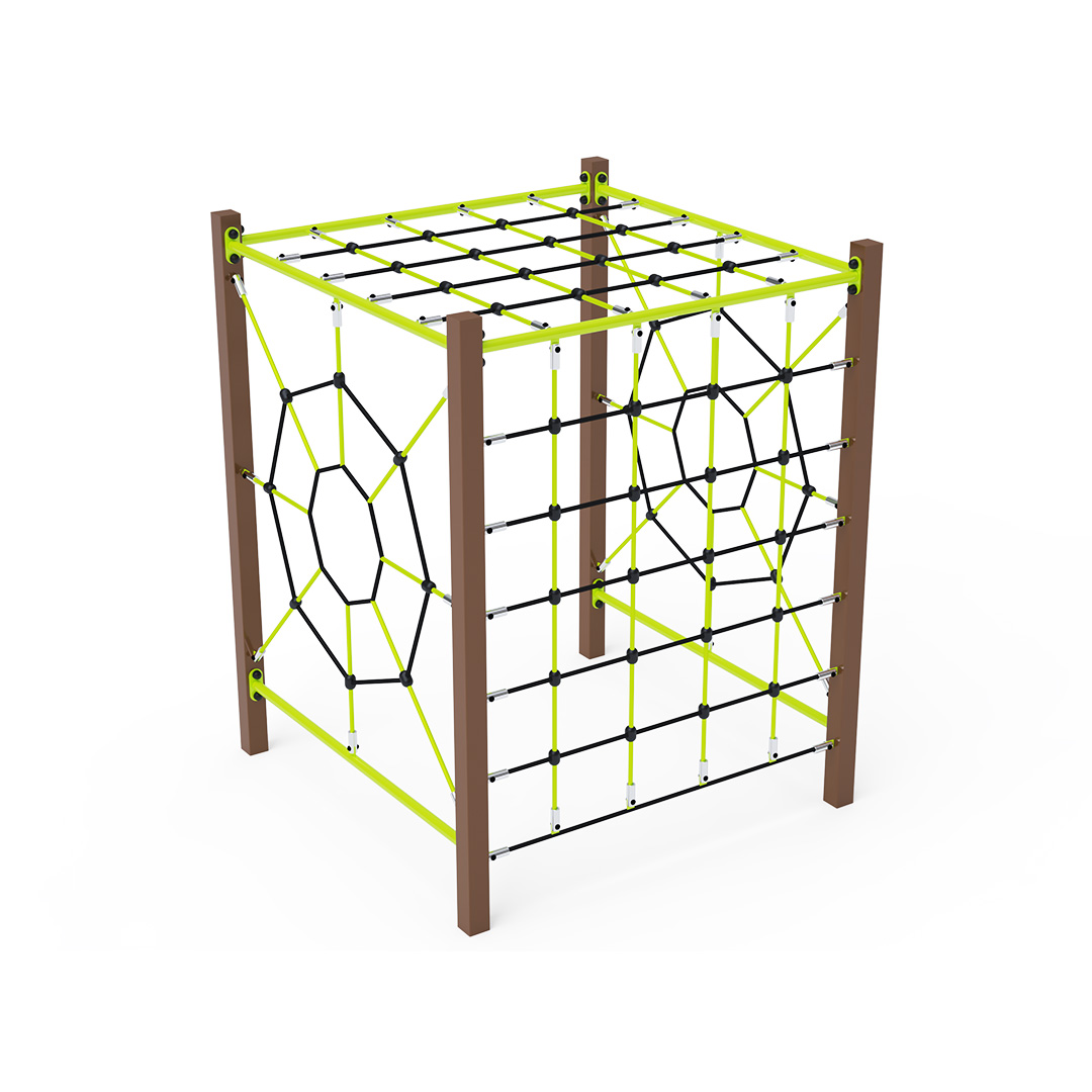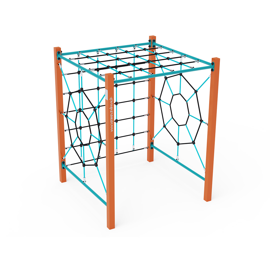 Das Seilklettergerüst besteht aus vier verschiedenen Kletterwänden, die zu einem großen Würfel verbunden sind. Zwei Spinnennetze und zwei Kletterwände bieten vielen Kindern gleichzeitig Spielspaß. Die Seilelemente sind aus feuerverzinktem Stahl mit einer hochwertigen Oberflächenveredelung gefertigt. Die Verbindungen bestehen aus Edelstahl und sind mit Kunststoffkappen versehen, um die Sicherheit und Langlebigkeit zu erhöhen. Die Seile bestehen aus Polyesterfasern, die um den Kern gewickelt sind. Diese Konstruktion erhöht die Festigkeit und Widerstandsfähigkeit gegen mechanische Belastung. Polyester selbst besitzt viele positive Eigenschaften: Es ist resistent gegen Mikroorganismen, witterungsbeständig, trocknet schnell nach Regen, ist farbecht und zeichnet sich durch hohe Festigkeit aus. Das Seilturnzentrum VVZ-GYM001 ist nach der Norm STN EN 1176 zertifiziert.