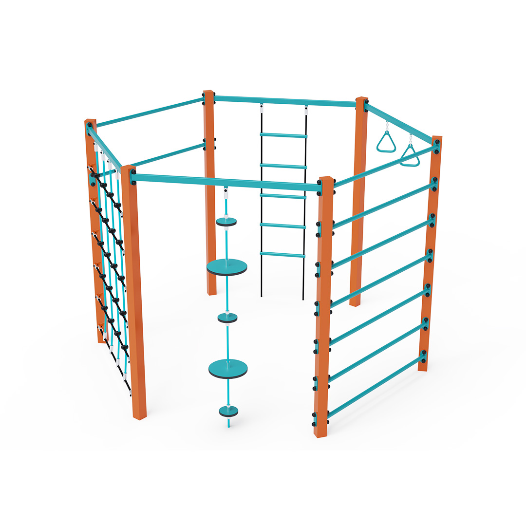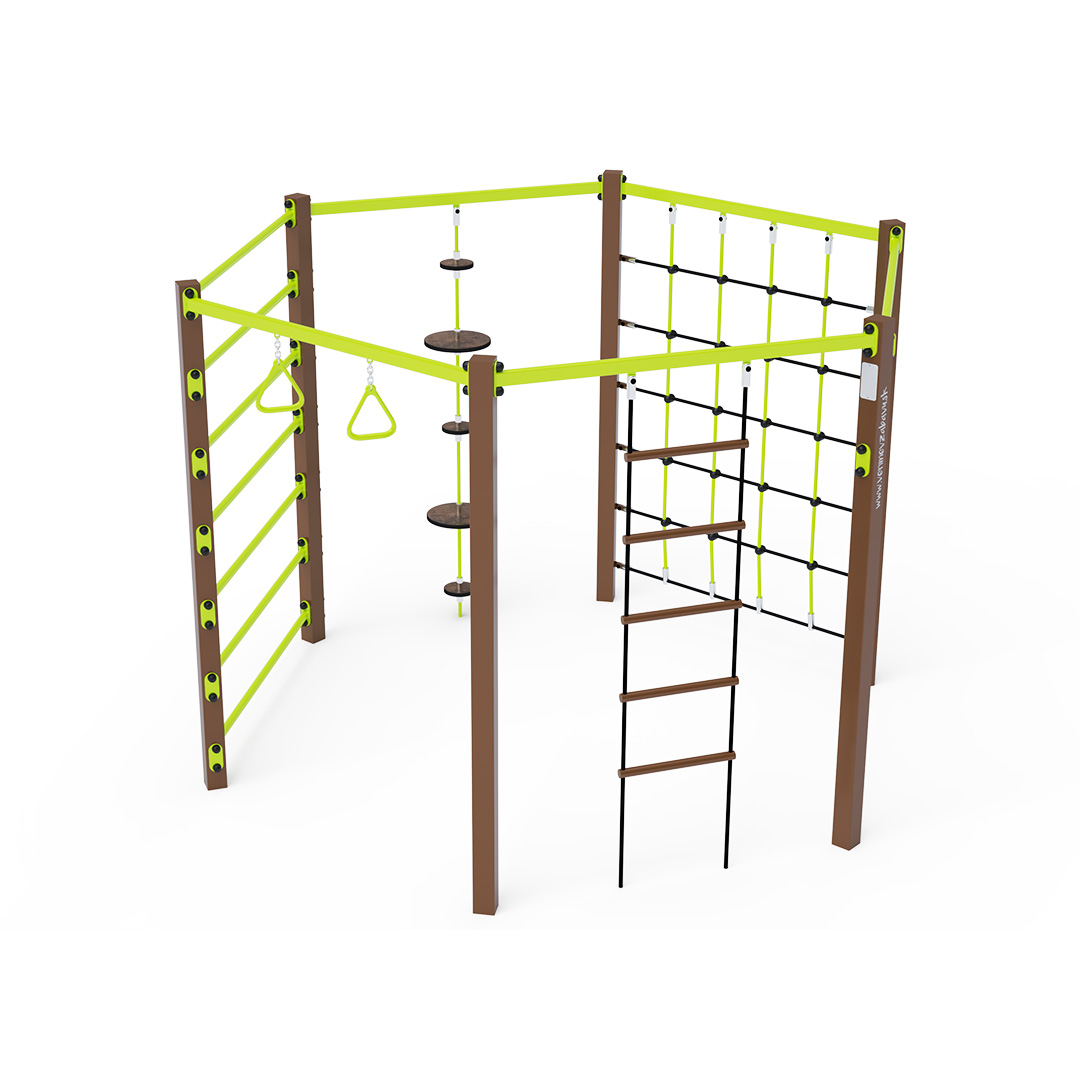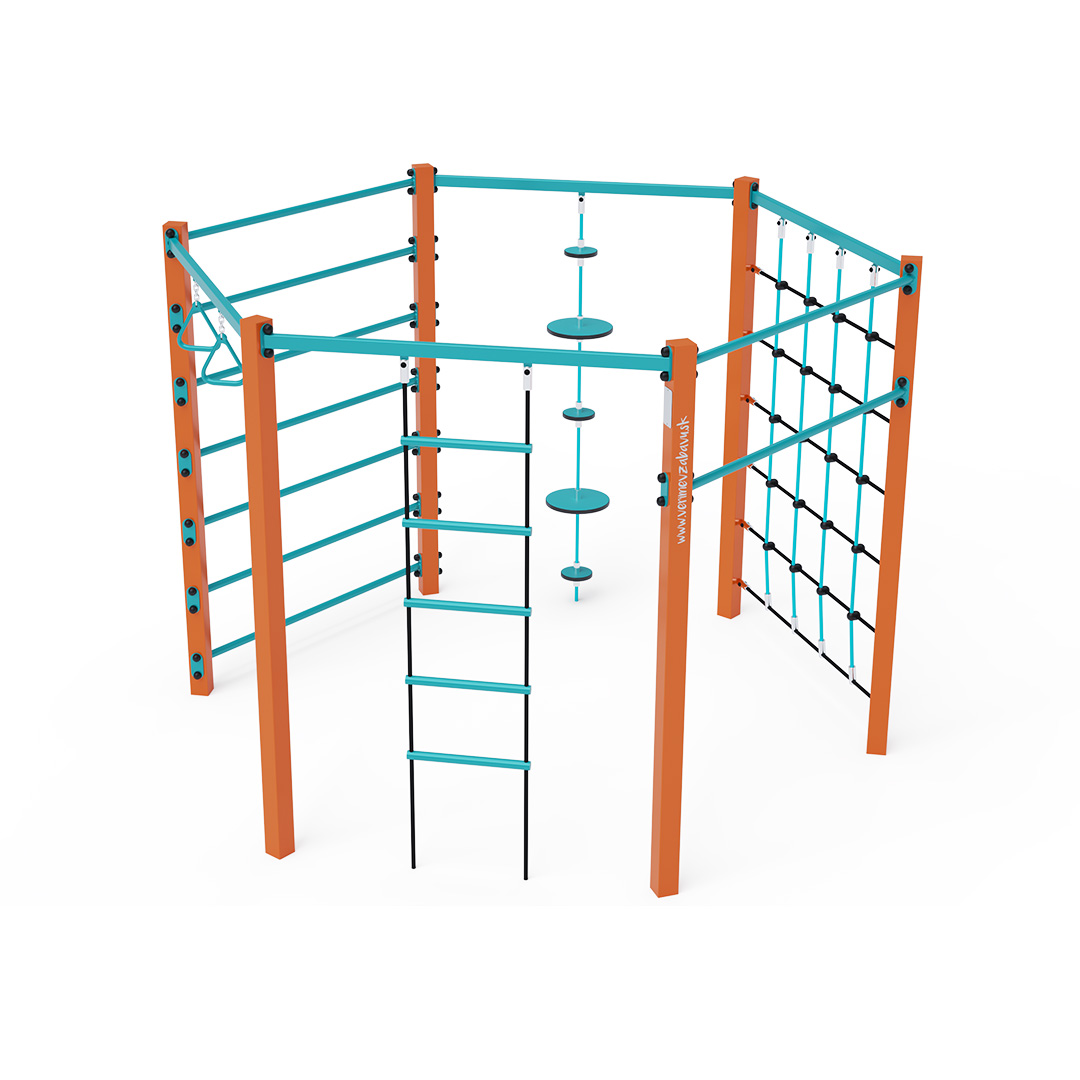 Eine Seilturnanlage ist ein Sechseck, bestehend aus einem langen Mittelteil, Turnringen, einem Seil mit Balanceplatten, einem Seilkletternetz, einer Leiter und einem Doppeltrapez. Die Spielelemente sind aus feuerverzinktem Stahl mit hochwertiger Oberflächenveredelung gefertigt. Die Verbindungen bestehen aus Edelstahl und sind mit Kunststoffkappen versehen, um die Sicherheit und Langlebigkeit zu erhöhen. Die Seile bestehen aus Polyesterfasern, die um den Mittelteil gewickelt sind. Diese Konstruktion erhöht die Festigkeit und Widerstandsfähigkeit gegen mechanische Belastungen. Polyester selbst besitzt viele positive Eigenschaften: Es ist resistent gegen Mikroorganismen und Witterungseinflüsse, trocknet schnell nach Regen, ist farbecht und zeichnet sich durch hohe Festigkeit aus. Das Seilturnzentrum VVZ-GYM003 ist nach der Norm STN EN 1176 zertifiziert.