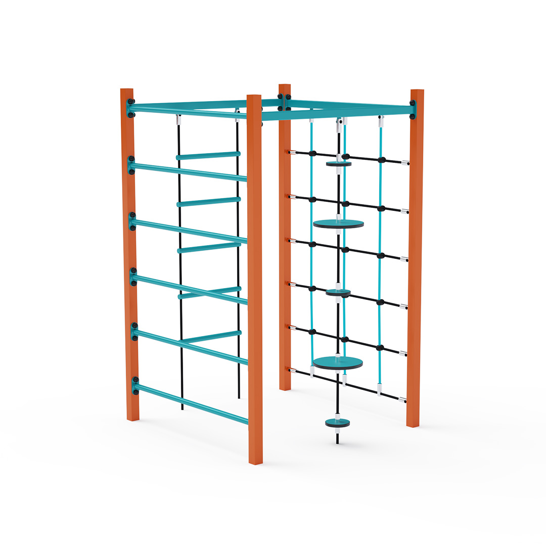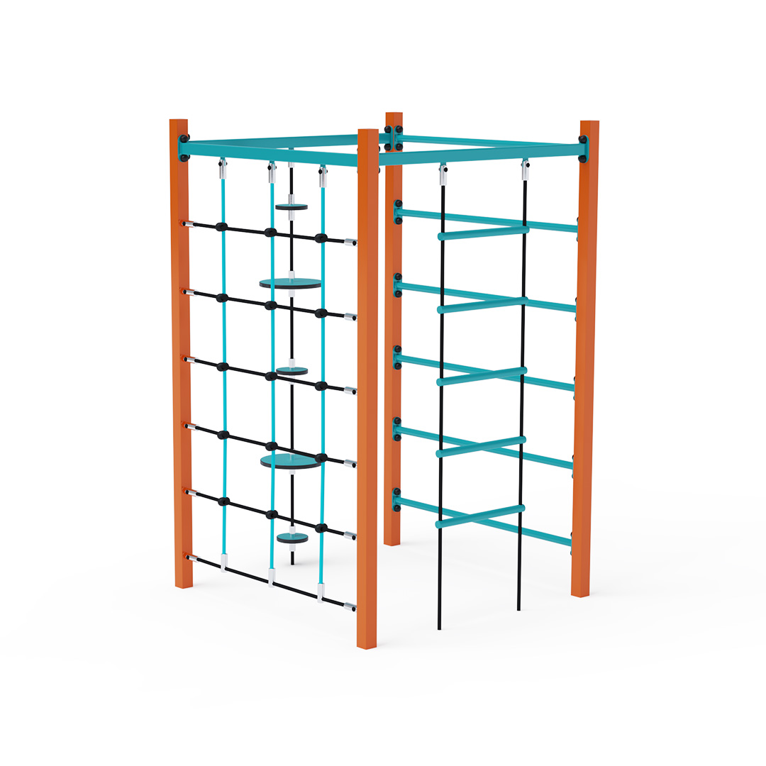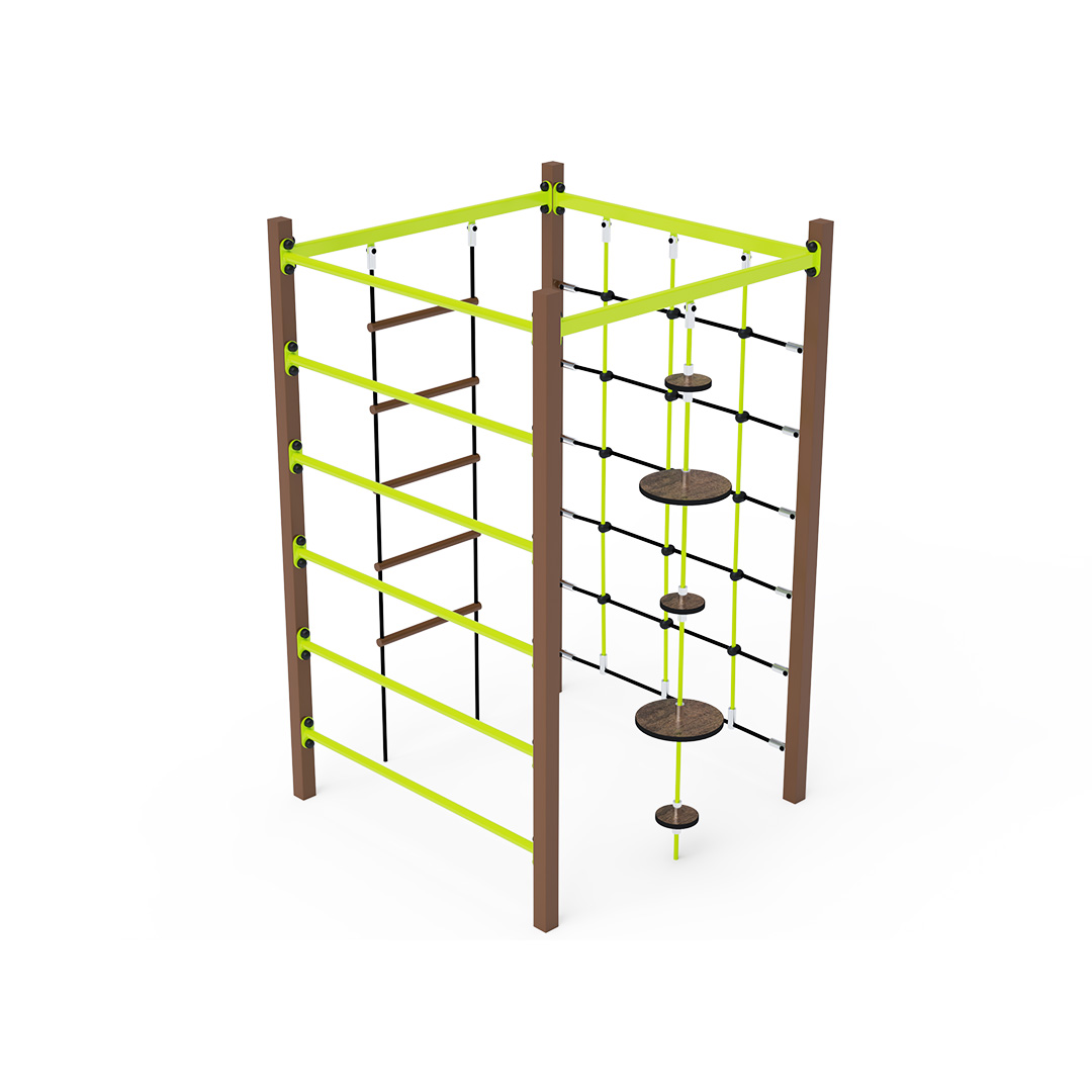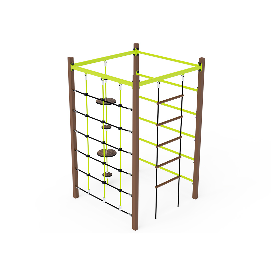 Ein Seilturngerät ist ein Würfel mit einem Seilnetz, einer Leiter, langen Streben und Seilen mit Balanceplatten. Das Spielelement besteht aus feuerverzinktem Stahl mit einer hochwertigen Oberflächenveredelung. Die Verbindungen sind aus Edelstahl und mit Kunststoffkappen versehen, um die Sicherheit und Langlebigkeit zu erhöhen. Die Seile bestehen aus Polyesterfasern, die um den Kern gewickelt sind. Diese Konstruktion erhöht die Festigkeit und Widerstandsfähigkeit gegen mechanische Belastung. Polyester selbst besitzt viele positive Eigenschaften: Es ist resistent gegen Mikroorganismen und Witterungseinflüsse, trocknet schnell nach Regen, ist farbecht und zeichnet sich durch hohe Festigkeit aus. Das Seilturnzentrum VVZ-GYM002-1 ist nach der Norm STN EN 1176 zertifiziert.