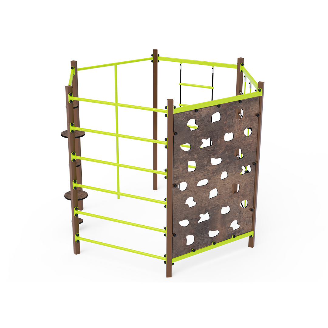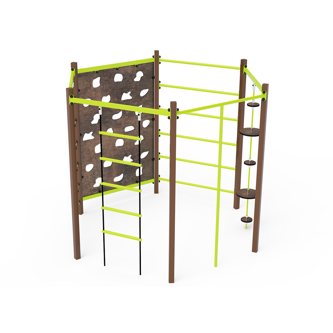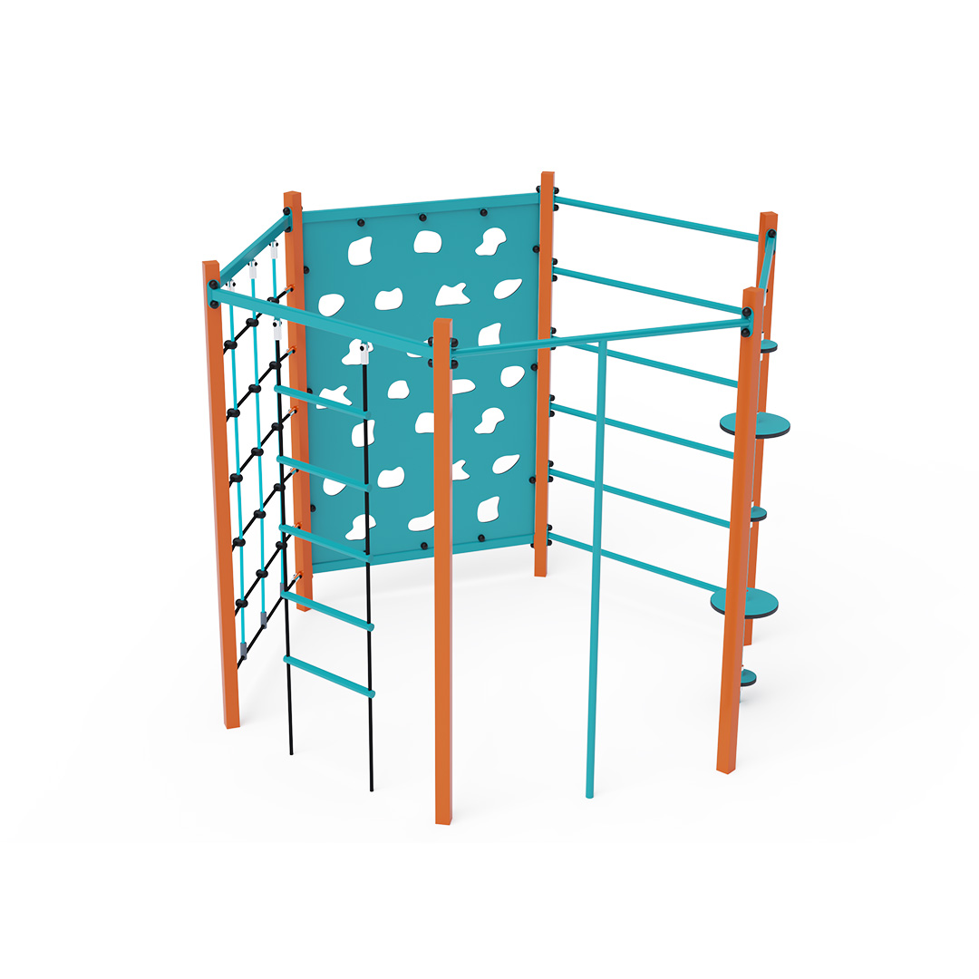 Ein Seilklettergerüst ist ein Sechseck, bestehend aus einer langen Strebe, einer Kletterstange, einem Seil mit Balancescheiben, einer Kletterwand mit Griffen, einer Leiter und einem Kletternetz. Die Spielelemente sind aus feuerverzinktem Stahl mit hochwertiger Oberflächenveredelung gefertigt. Die Verbindungen bestehen aus Edelstahl und sind mit Kunststoffkappen versehen, um die Sicherheit und Langlebigkeit zu erhöhen. Die Seile bestehen aus Polyesterfasern, die um die Mitte gewickelt sind. Diese Konstruktion erhöht die Festigkeit und Widerstandsfähigkeit gegen mechanische Belastung. Polyester selbst besitzt viele positive Eigenschaften: Es ist resistent gegen Mikroorganismen und Witterungseinflüsse, trocknet schnell nach Regen, ist farbecht und zeichnet sich durch hohe Festigkeit aus. Das Seilturnzentrum VVZ-GYM003-1 ist nach der Norm STN EN 1176 zertifiziert.