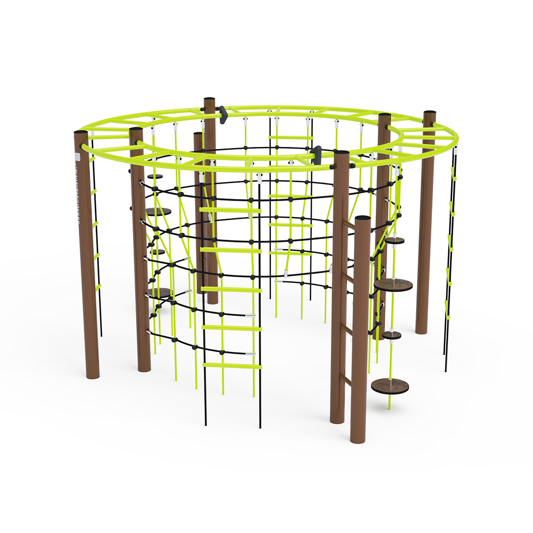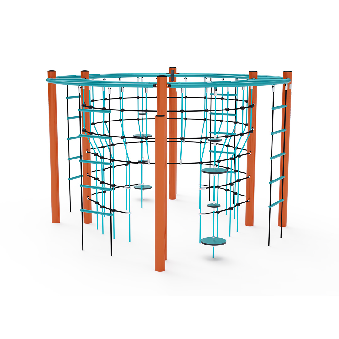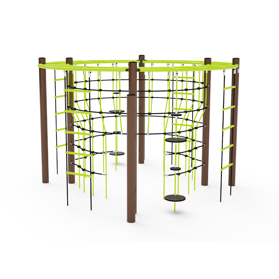 Seilklettergerüst mit kreisförmigem Seilausgang, vier Leitern und Hängescheiben. Das Spielgerät ist aus verzinktem Stahl mit hochwertiger Oberflächenbehandlung gefertigt. Die Verbindungen bestehen aus Edelstahl und sind mit Kunststoffkappen versehen, um die Sicherheit und Langlebigkeit zu erhöhen. Die Seile sind aus Polyesterfasern gefertigt, die um den Kern gewickelt sind. Diese Konstruktion erhöht die Festigkeit und Widerstandsfähigkeit gegen mechanische Belastung. Polyester selbst besitzt viele positive Eigenschaften: Es ist resistent gegen Mikroorganismen und Witterungseinflüsse, trocknet schnell nach Regen, ist farbecht und zeichnet sich durch hohe Festigkeit aus.