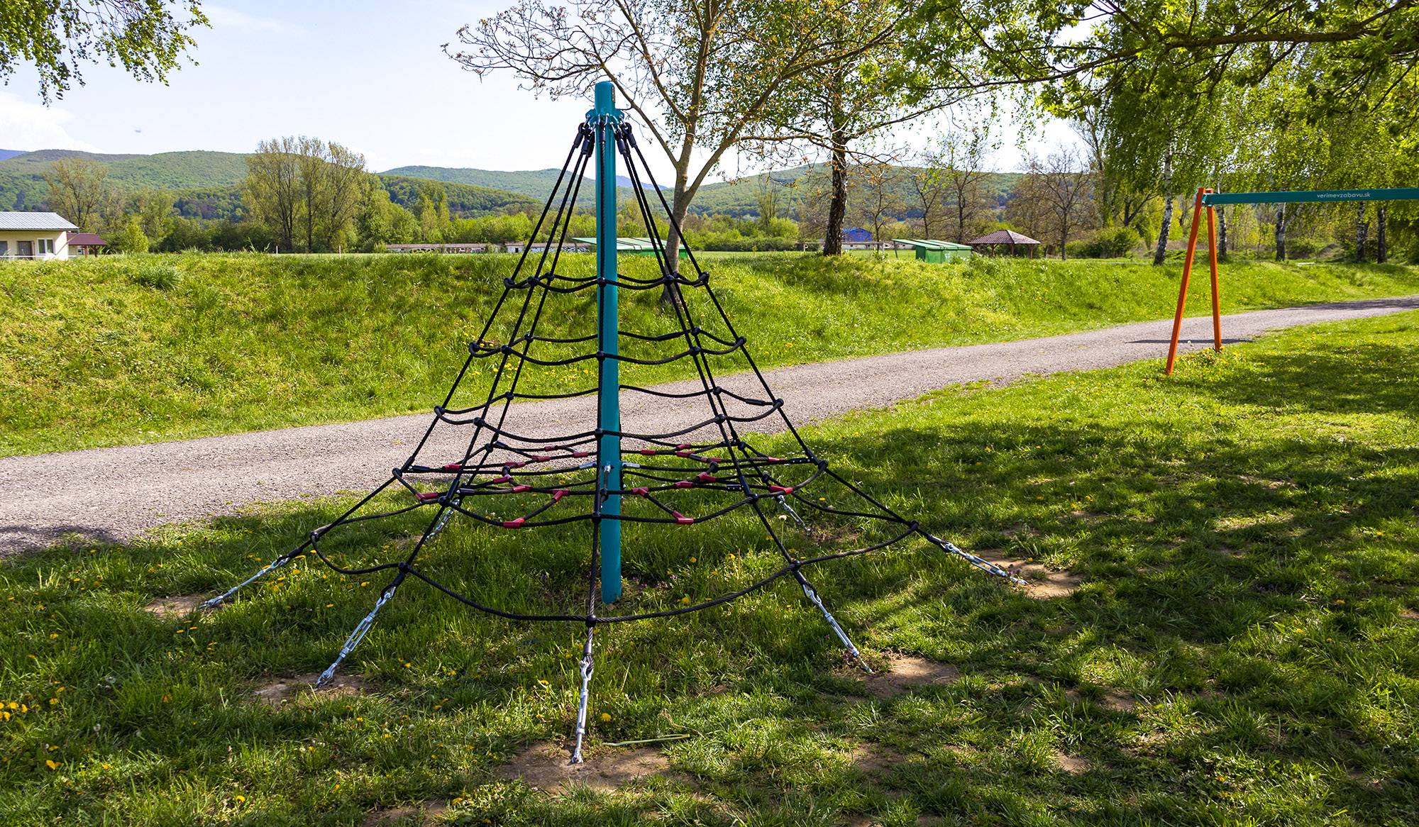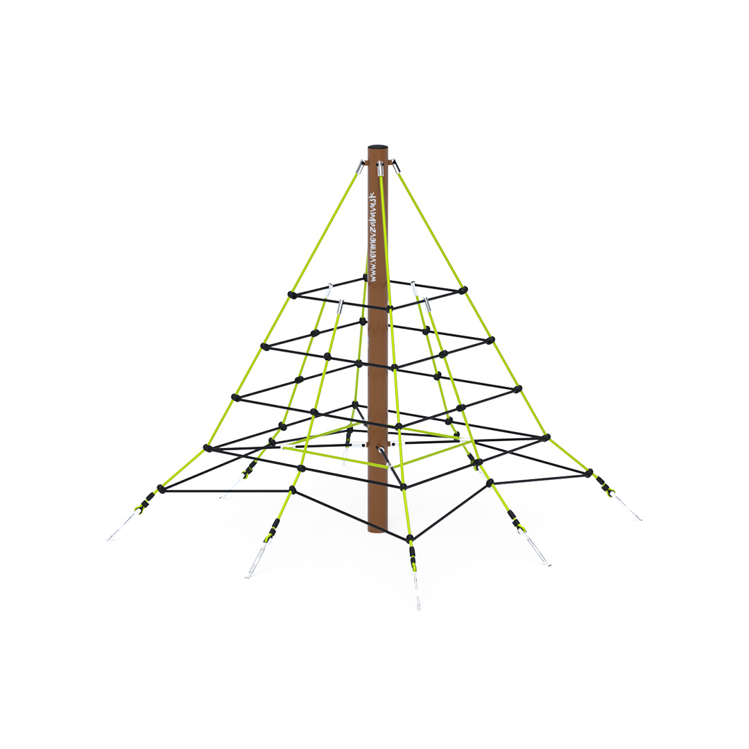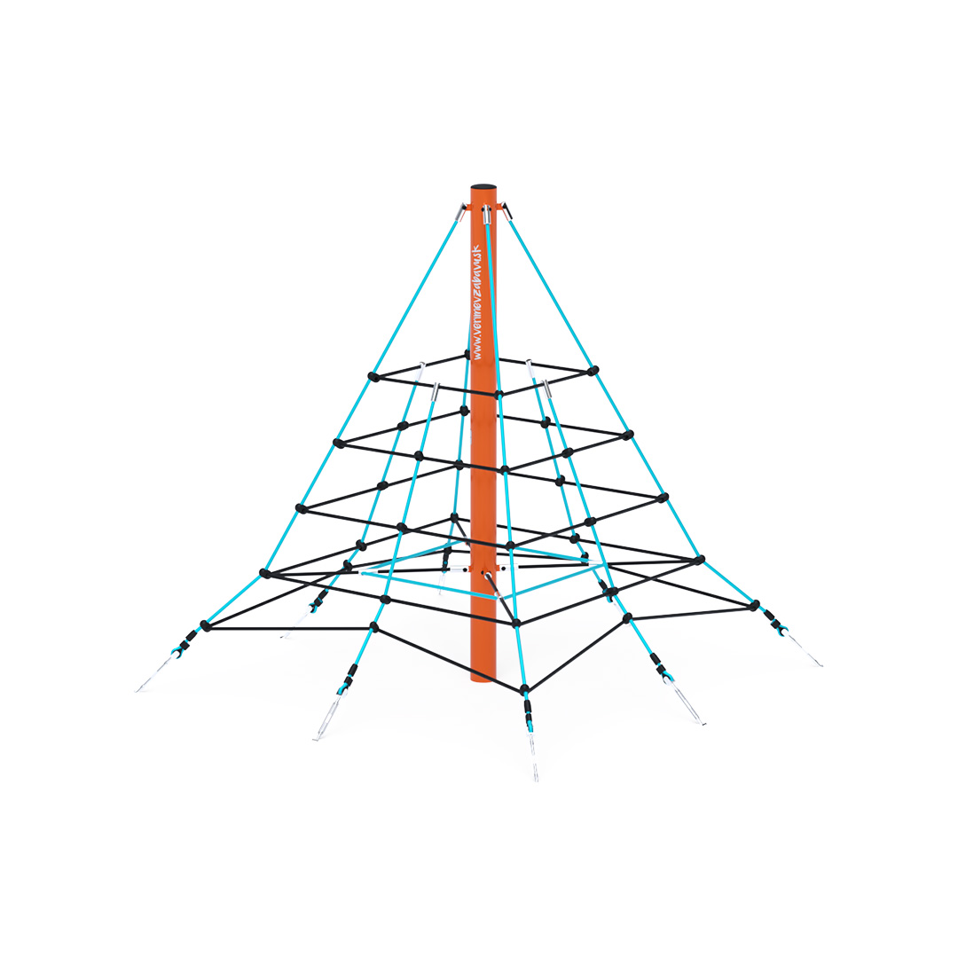 Die zwei Meter hohe Seilpyramide eignet sich auch für kleinere Kinder, die sicher den Mut haben werden, bis ganz nach oben zu klettern. Das Spielgerät besteht aus verzinktem Stahl mit einer hochwertigen Oberflächenbehandlung. Die Verbindungsstücke sind aus Edelstahl und mit Kunststoffkappen versehen, um die Sicherheit und Langlebigkeit zu erhöhen. Die Seile bestehen aus Polyesterfasern, die um die Mitte gewickelt sind. Diese Konstruktion erhöht die Festigkeit und Widerstandsfähigkeit des Seils gegen mechanische Belastung. Polyester selbst besitzt viele positive Eigenschaften: Es ist resistent gegen Mikroorganismen und Witterungseinflüsse, trocknet schnell nach Regen, ist farbecht und zeichnet sich durch hohe Festigkeit aus. Die Seilpyramide VVZ-PYR020 ist nach STN EN 1176 zertifiziert. Als Landefläche kann eine Rasenfläche genutzt werden, wir empfehlen jedoch die Verwendung einer Rasenmatte.