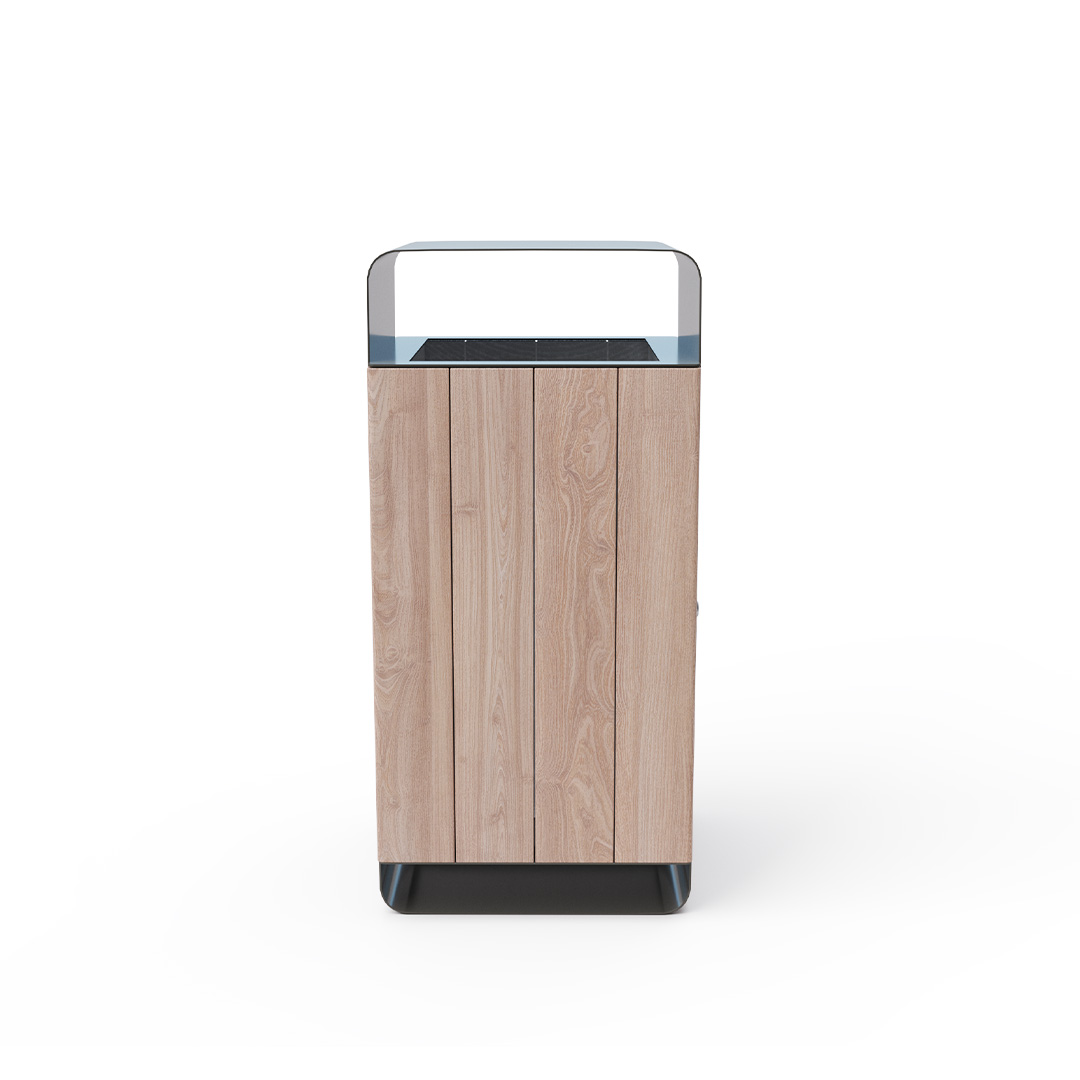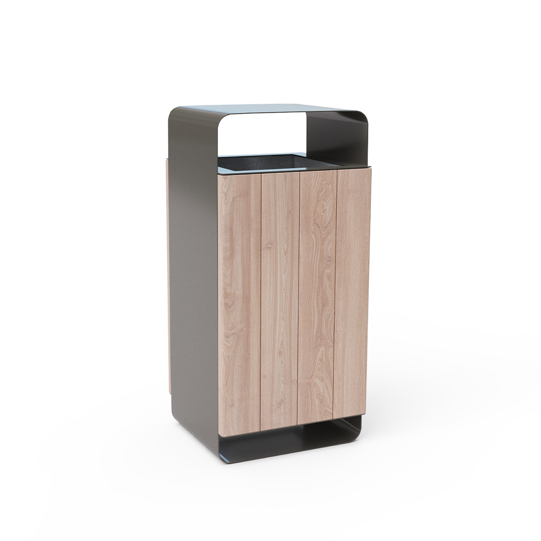 Design-Abfallbehälter mit Deckel und einem Volumen von 60 l, geeignet für den Außenbereich (Parks, Spielplätze) sowie für den Innenbereich (Einkaufszentren, Flughafenhallen, Eingangshallen etc.).