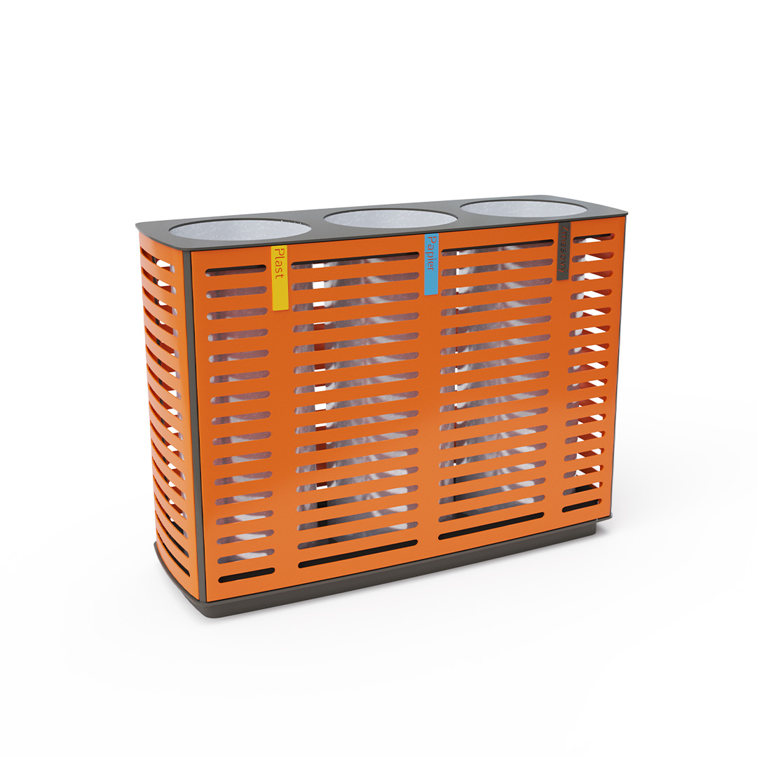 Design-Abfallbehälter mit einem Volumen von 3 x 50 l, geeignet für Außenbereiche wie Parks und Spielplätze sowie für Innenräume wie Einkaufszentren, Flughafenhallen, Eingangshallen usw.