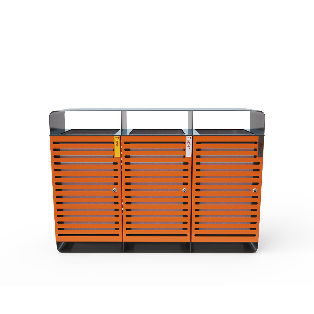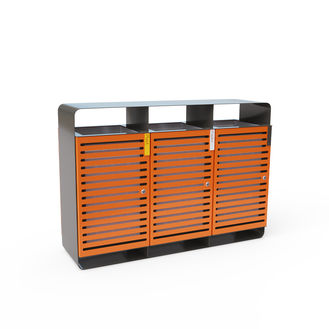 Design-Abfallbehälter mit Deckel und einem Volumen von 3 x 60 l, geeignet für den Außenbereich (Parks, Spielplätze) sowie für Innenräume (Einkaufszentren, Flughafenhallen, Eingangshallen etc.).