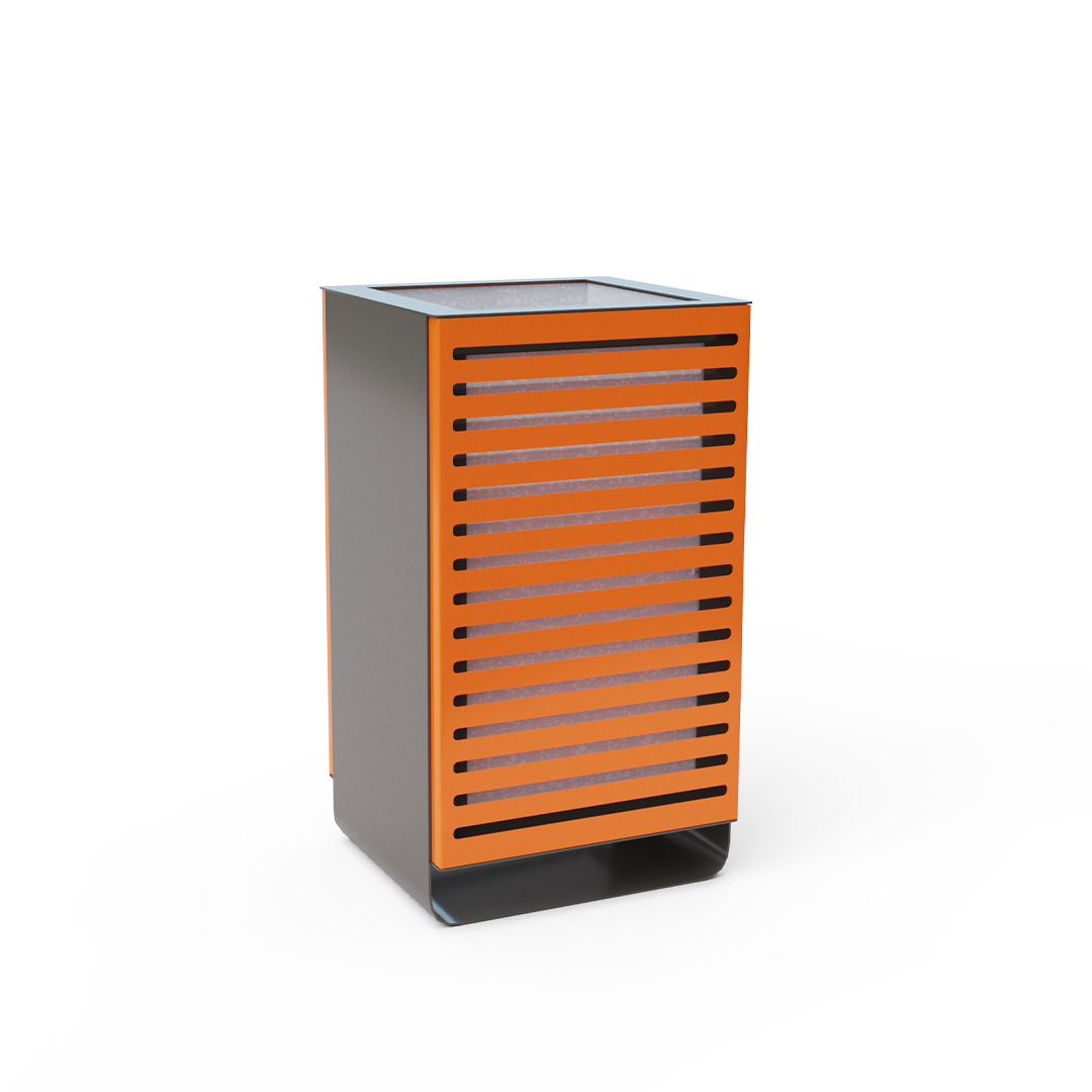 Design-Mülleimer mit 60 l Volumen, geeignet für den Außenbereich (Parks, Spielplätze) sowie für den Innenbereich (Einkaufszentren, Flughafenhallen, Eingangshallen etc.).