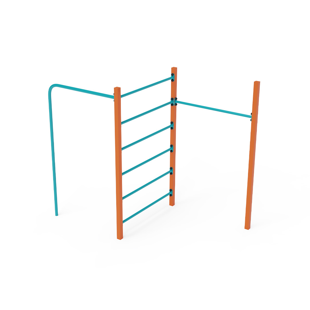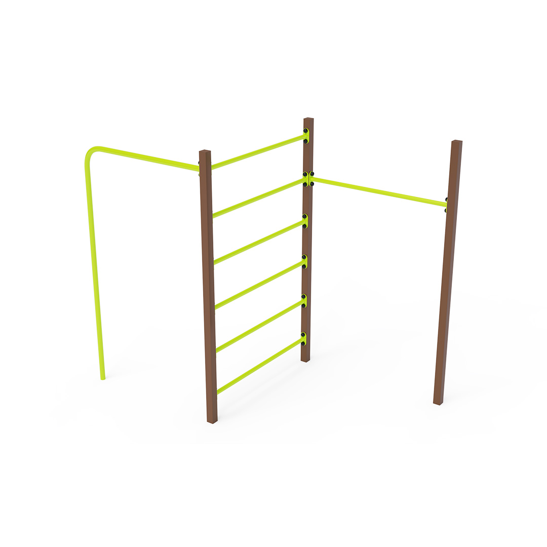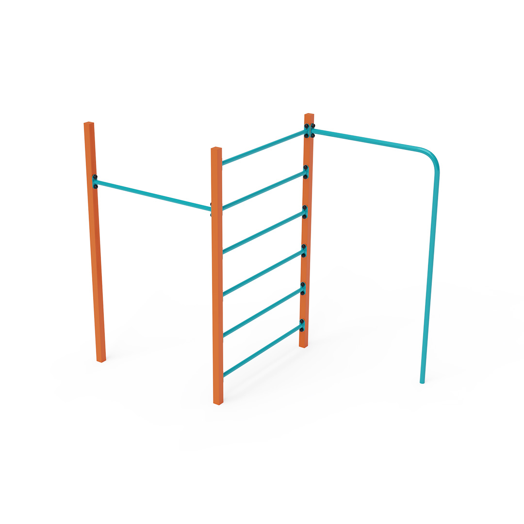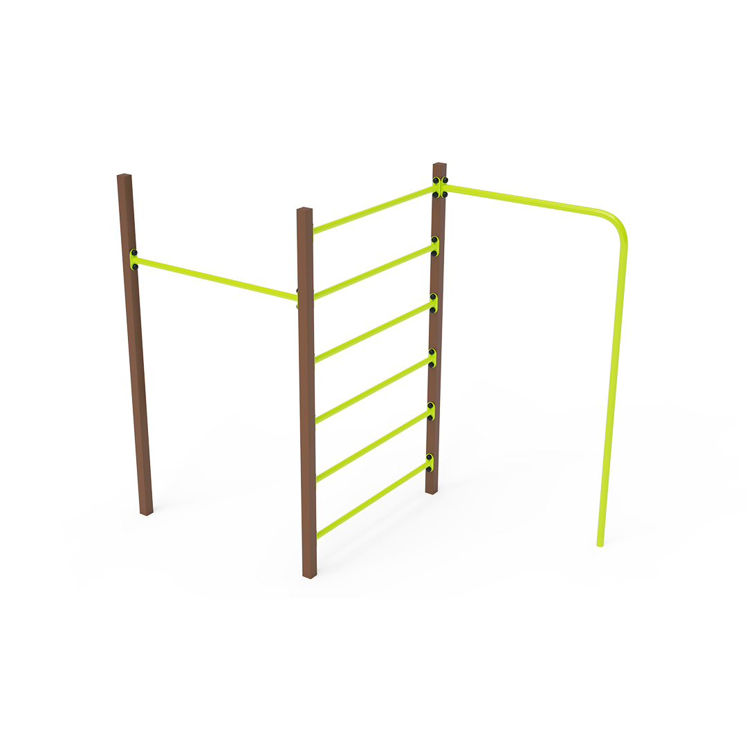 Die Stahl-Turnbank besteht aus drei Elementen: einer Reckstange, einer Querstange und einer Kletterstange. Die Spielelemente sind aus feuerverzinktem Stahl mit hochwertiger Oberflächenveredelung gefertigt. Die Verbindungen bestehen aus Edelstahl und sind mit Kunststoffkappen versehen, um die Sicherheit und Langlebigkeit zu erhöhen. Die Stahl-Turnbank VVZ-GYM005-1 ist nach der Norm STN EN 1176 zertifiziert. Das Spielgerät ist durch Einbetonieren der Konstruktion in 50 x 50 x 50 cm große Betonfundamente fest im Boden verankert.