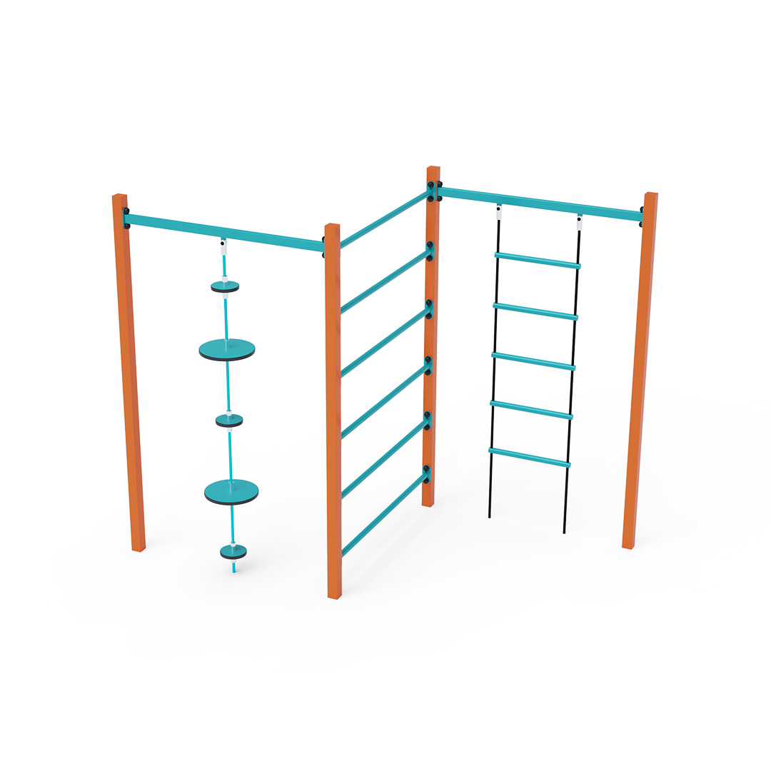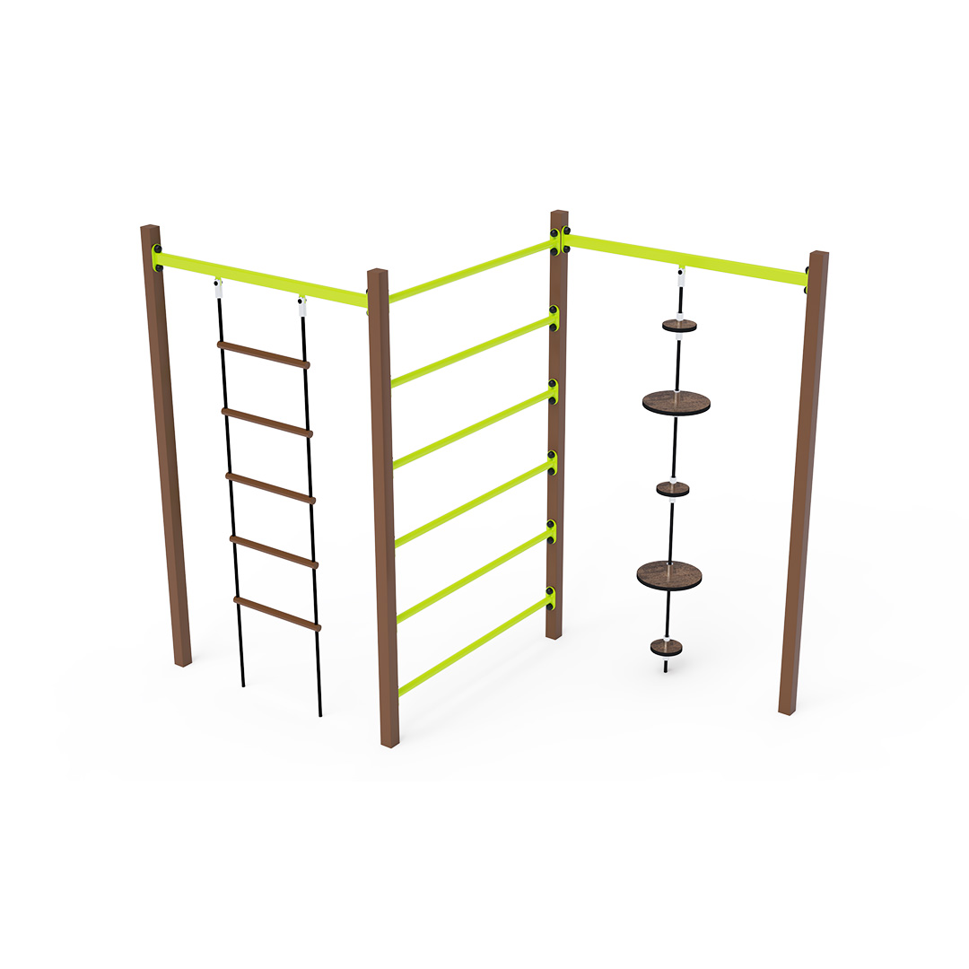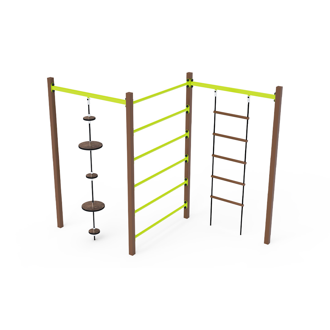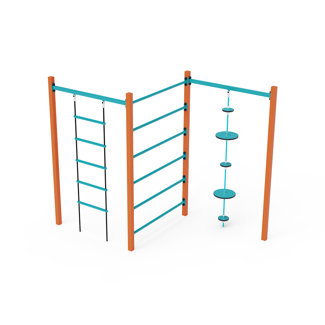 Die Stahl-Turnbank besteht aus drei verschiedenen Elementen: Leiter, Rippen und Seil mit Balanceplatten. Das Spielelement ist aus feuerverzinktem Stahl mit hochwertiger Oberflächenveredelung gefertigt. Die Verbindungen bestehen aus Edelstahl und sind mit Kunststoffkappen versehen, um die Sicherheit und Langlebigkeit zu erhöhen. Die Seile sind aus Polyesterfasern gefertigt und um den Kern gewickelt. Diese Konstruktion erhöht die Festigkeit und Widerstandsfähigkeit gegen mechanische Belastungen. Polyester besitzt viele positive Eigenschaften: Es ist resistent gegen Mikroorganismen und Witterungseinflüsse, trocknet schnell nach Regen, ist farbecht und zeichnet sich durch hohe Festigkeit aus. Die Stahl-Turnbank VVZ-GYM005-2 ist nach der Norm STN EN 1176 zertifiziert. Das Spielgerät ist durch Einbetonieren der Konstruktion in 50 x 50 x 50 cm große Betonfundamente fest im Boden verankert.
