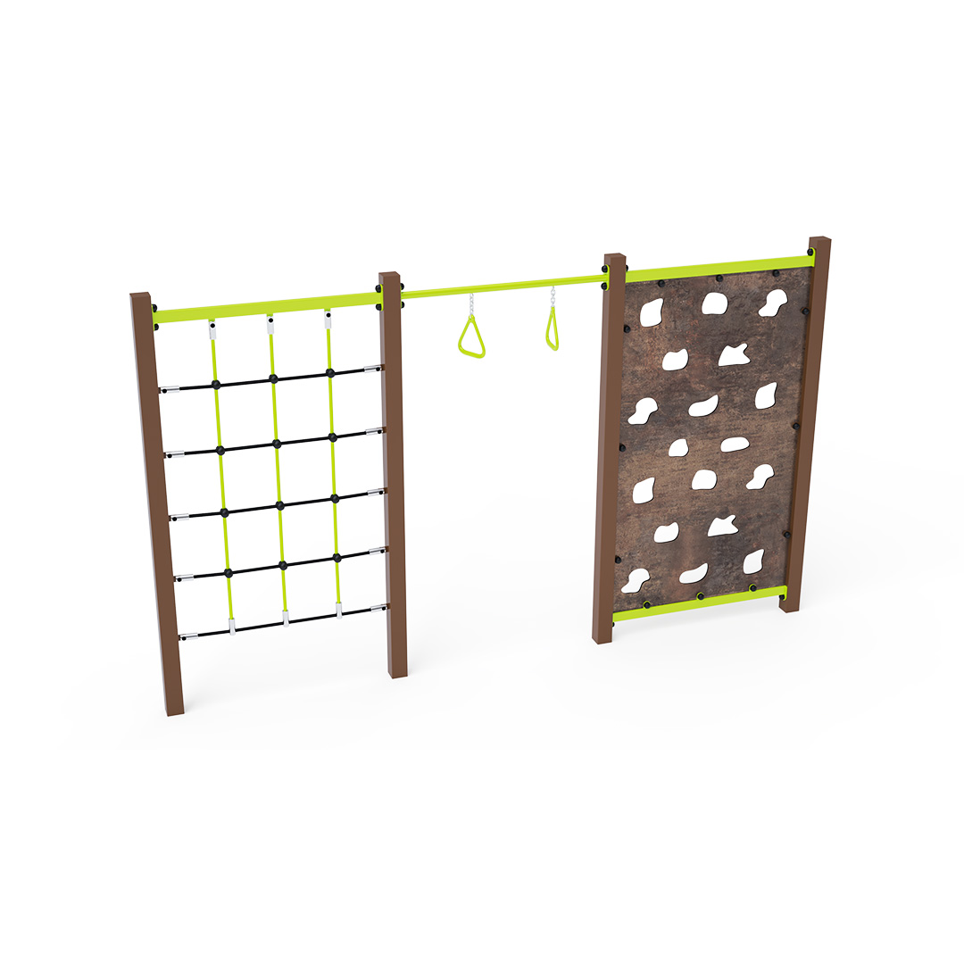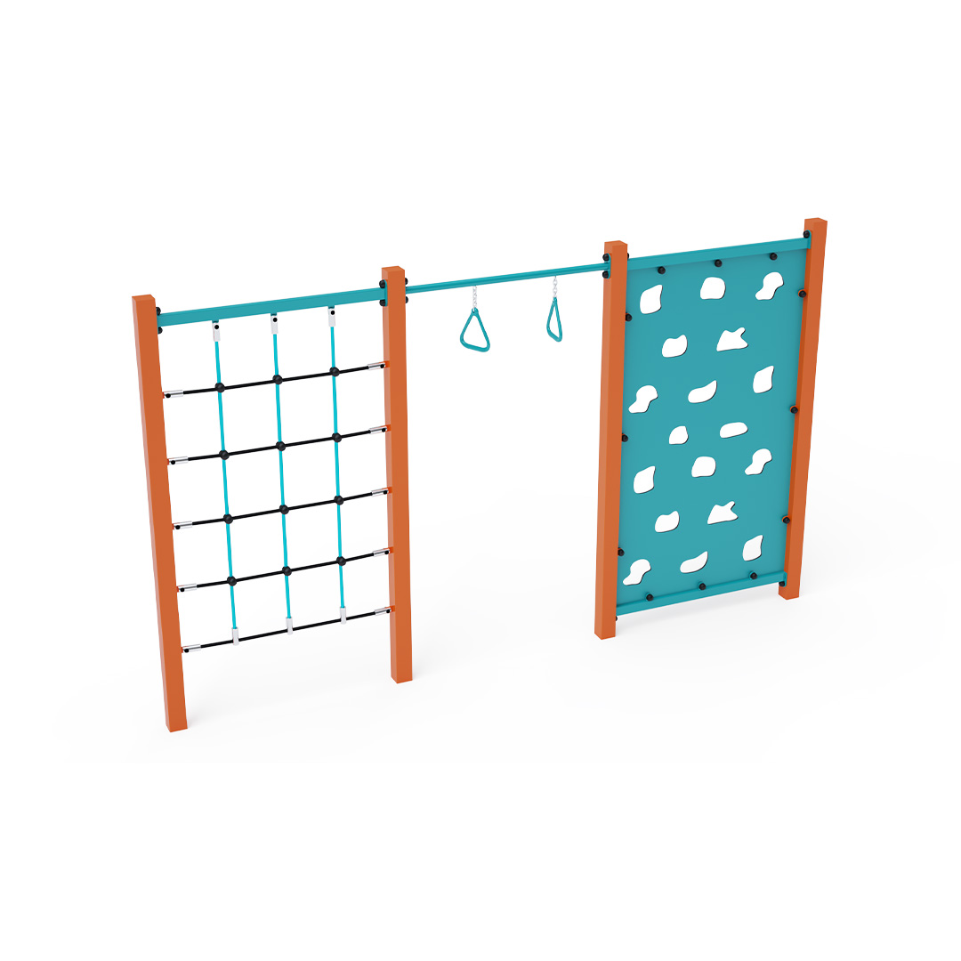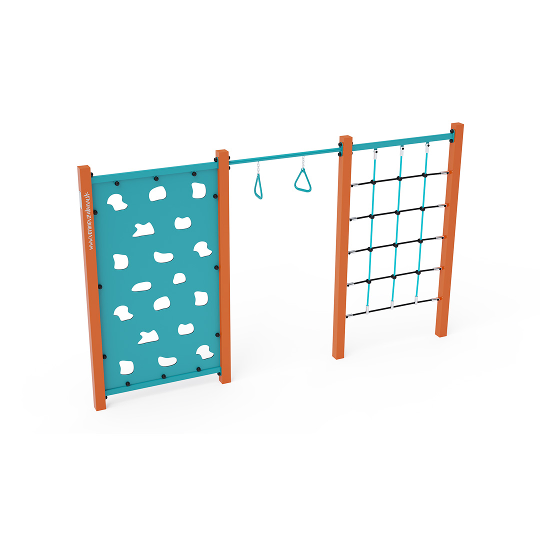 Ein Stahl-Klettergerüst, bestehend aus drei Elementen: einem Kletterseilnetz, Griffringen und einer Kletterwand mit Klettergriffen. Das Spielelement ist aus feuerverzinktem Stahl mit hochwertiger Oberflächenveredelung gefertigt. Die Verbindungen bestehen aus Edelstahl und sind mit Kunststoffkappen versehen, um die Sicherheit und Langlebigkeit zu erhöhen. Die Seile sind aus Polyesterfasern gefertigt und um den Kern gewickelt. Diese Konstruktion erhöht die Festigkeit und Widerstandsfähigkeit gegen mechanische Belastungen. Polyester besitzt viele positive Eigenschaften: Es ist resistent gegen Mikroorganismen und Witterungseinflüsse, trocknet schnell nach Regen, ist farbecht und zeichnet sich durch hohe Festigkeit aus. Das Seil-Klettergerüst VVZ-GYM005-4 ist nach der Norm STN EN 1176 zertifiziert. Das Spielgerät ist durch Einbetonieren der Konstruktion in 50 x 50 x 50 cm große Betonfundamente fest im Boden verankert.