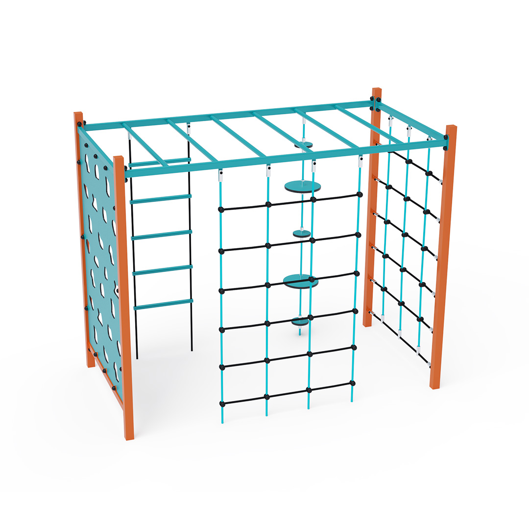 Die Stahl-Turnanlage besteht aus sechs verschiedenen Elementen: Leiter, Seil mit Balancescheiben, Seilnetz, Kletternetz und horizontaler Leiter. Die Spielelemente sind aus feuerverzinktem Stahl mit hochwertiger Oberflächenveredelung gefertigt. Die Verbindungen bestehen aus Edelstahl und sind mit Kunststoffkappen versehen, um die Sicherheit und Langlebigkeit zu erhöhen. Die Seile sind aus Polyesterfasern gefertigt und um den Kern gewickelt. Diese Konstruktion erhöht die Festigkeit und Widerstandsfähigkeit gegen mechanische Belastungen. Polyester besitzt viele positive Eigenschaften: Es ist resistent gegen Mikroorganismen und Witterungseinflüsse, trocknet schnell nach Regen, ist farbecht und zeichnet sich durch hohe Festigkeit aus. Die Stahl-Turnanlage VVZ-GYM006-1 ist nach der Norm STN EN 1176 zertifiziert. Das Spielgerät ist durch Einbetonieren der Konstruktion in 50 x 50 x 50 cm große Betonfundamente fest im Boden verankert.