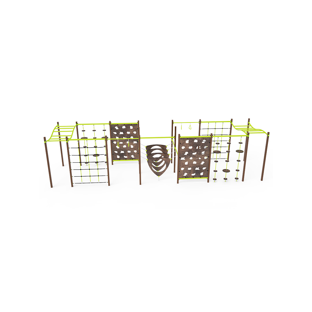 Stahl-Klettergerüst – ein Set bestehend aus 2 Kletterwänden, 2 Kletternetzen, 2 langen Rippen, 2 Dreifachseilen mit Scheiben und einer zentralen Vierfach-Kletterklappe aus HPL-Material. Die Spielelemente sind aus verzinktem Stahl mit hochwertiger Oberflächenveredelung gefertigt. Die Verbindungen bestehen aus Edelstahl und sind mit Kunststoffkappen versehen, um die Sicherheit und Langlebigkeit zu erhöhen. Die Seile bestehen aus Polyesterfasern, die um den Kern gewickelt sind. Diese Konstruktion erhöht die Festigkeit und Widerstandsfähigkeit gegen mechanische Belastungen. Polyester selbst besitzt viele positive Eigenschaften: Es ist resistent gegen Mikroorganismen und Witterungseinflüsse, trocknet schnell nach Regen, ist farbecht und zeichnet sich durch hohe Festigkeit aus. Das Seilturnzentrum VVZ-GYM008 ist nach der Norm STN EN 1176 zertifiziert.