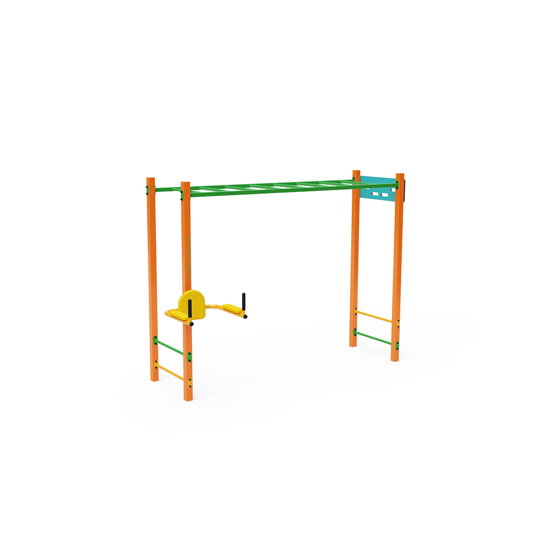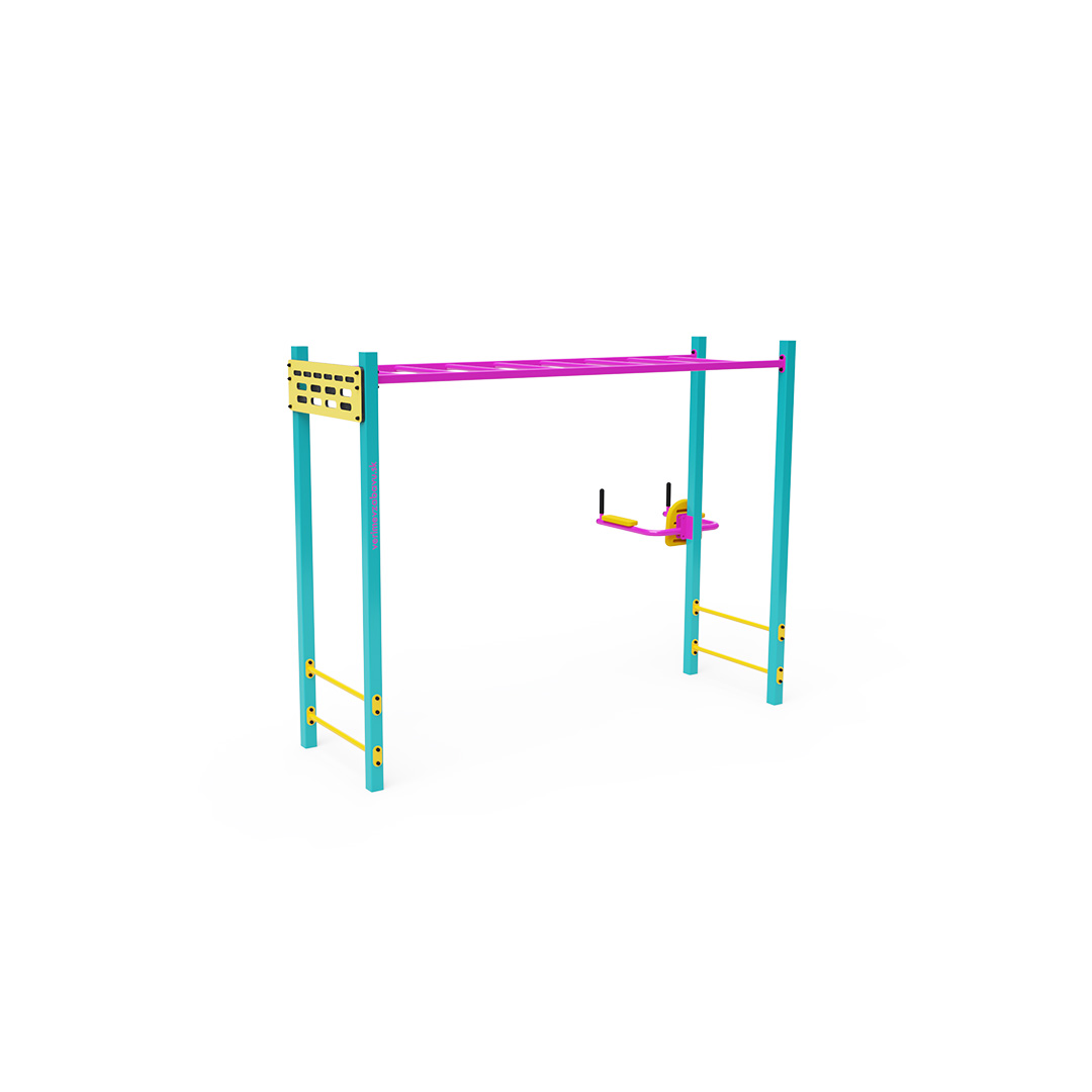 Workout ist eine immer beliebtere Form der Bewegung im Freien, bei der hauptsächlich mit dem eigenen Körpergewicht trainiert wird. Die Vielfalt der Übungen, die durch Trainingsgeräte und -aufbauten ermöglicht werden, in Kombination mit der frischen Luft macht das Training abwechslungsreich und motivierend. Dies fördert nicht nur die körperliche Gesundheit, sondern trägt auch zum mentalen Wohlbefinden bei. Das Set beinhaltet eine horizontale Leiter für Klimmzüge, Traversierungen und andere Übungen, ergänzt durch niedrige Stangen, ein Hangboard und einen Bauchmuskeltrainer.
