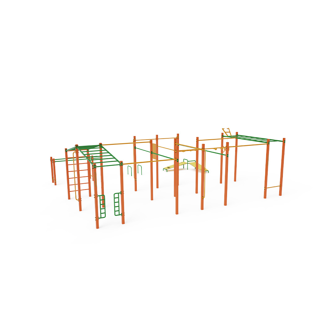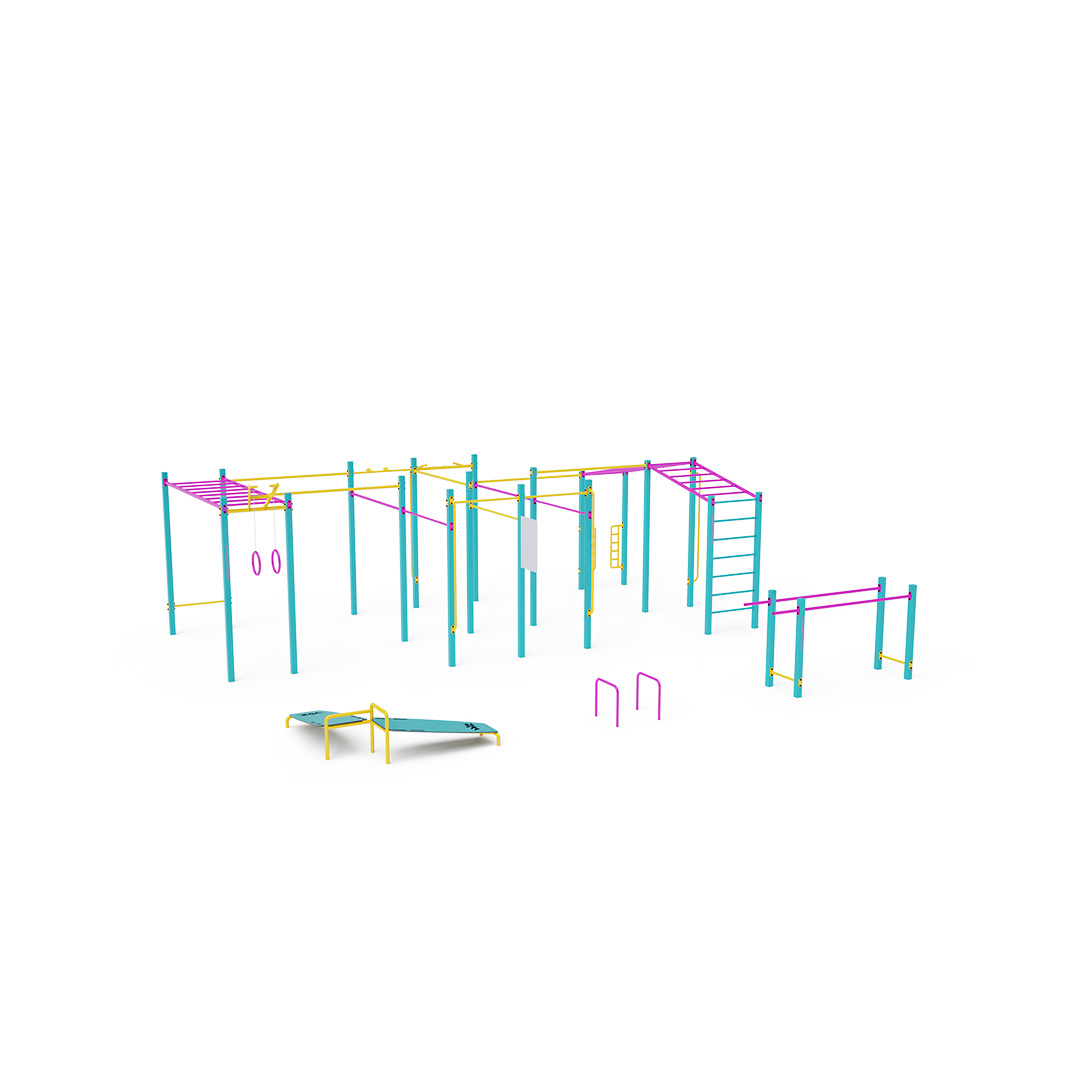Street-Workout ist eine immer beliebtere Art, sich im Freien zu bewegen und dabei hauptsächlich mit dem eigenen Körpergewicht zu trainieren. Dank der frischen Luft und der vielfältigen Übungen, die Workout-Elemente und -Sets ermöglichen, ist das Training abwechslungsreich. Es fördert nicht nur das körperliche, sondern auch das seelische Wohlbefinden. Ein mittelgroßes Set mit mehreren Stangen, Leitern und Ringen in verschiedenen Höhen wird durch zwei freistehende und zwei Reckstangen ergänzt – insgesamt sieben.