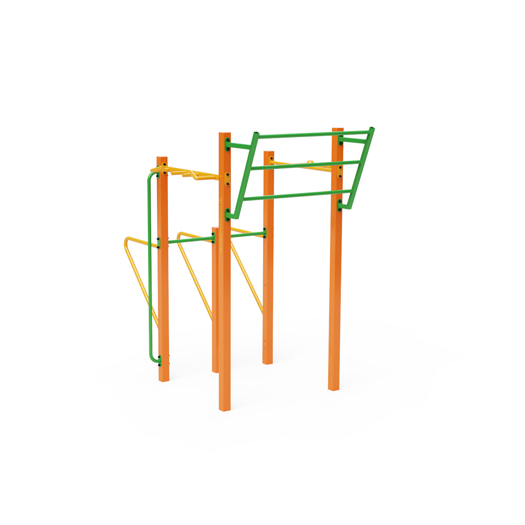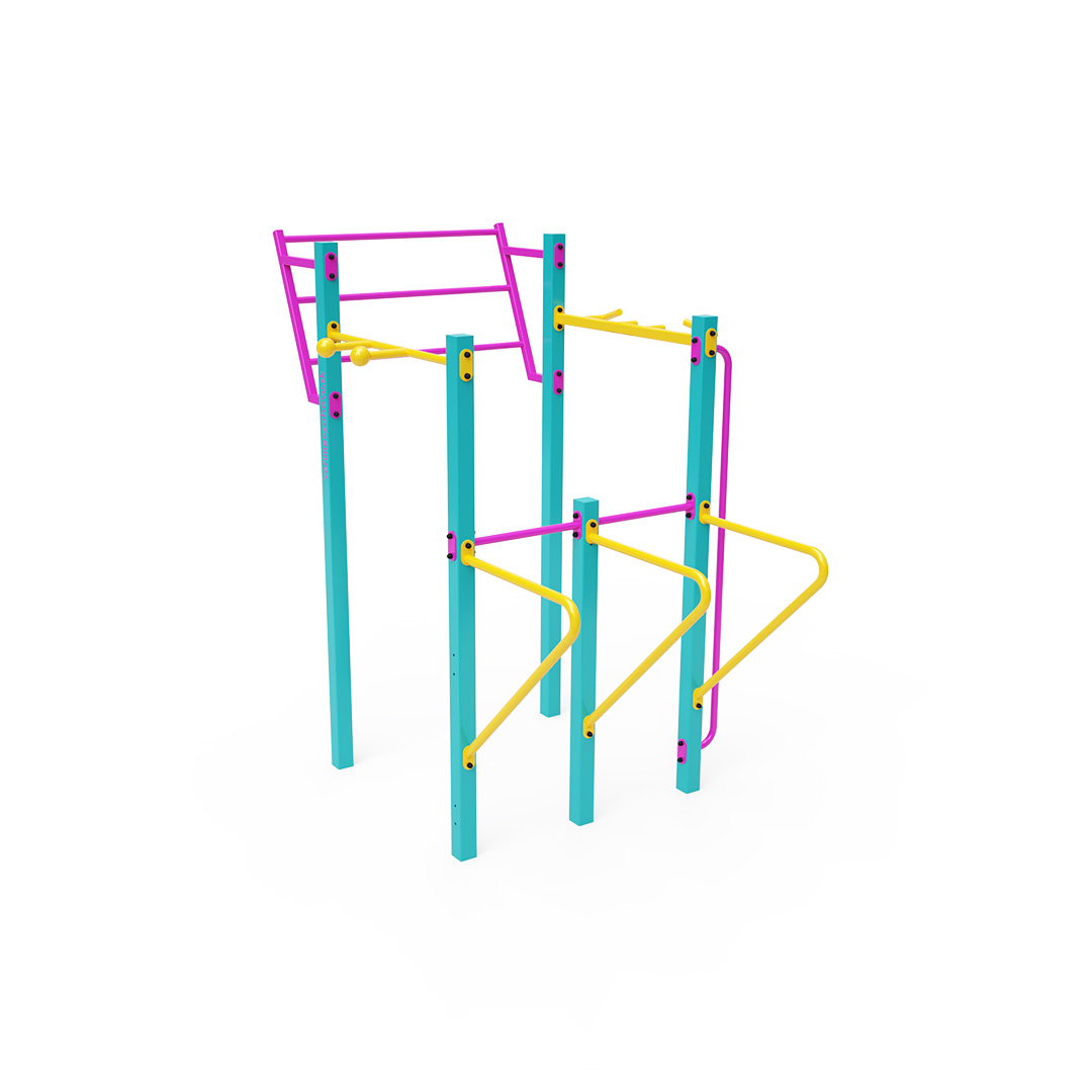 Workout ist eine immer beliebtere Form der Bewegung im Freien, bei der hauptsächlich mit dem eigenen Körpergewicht trainiert wird. Die Vielfalt der Übungen, die durch Trainingsgeräte und -aufbauten ermöglicht werden, in Kombination mit der frischen Luft macht das Training abwechslungsreich und motivierend. Dies fördert nicht nur die körperliche Gesundheit, sondern trägt auch zum mentalen Wohlbefinden bei. Dieses kleinere Set beinhaltet eine Sprossenwand, Reckstangen und eine Schrägwand-Sprossenwand, ergänzt durch einen Doppel-Parallelbarren.