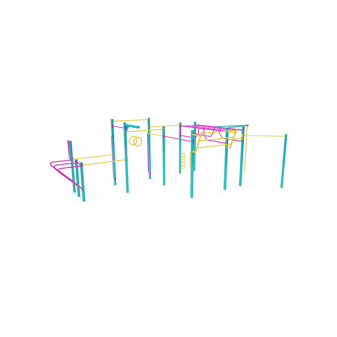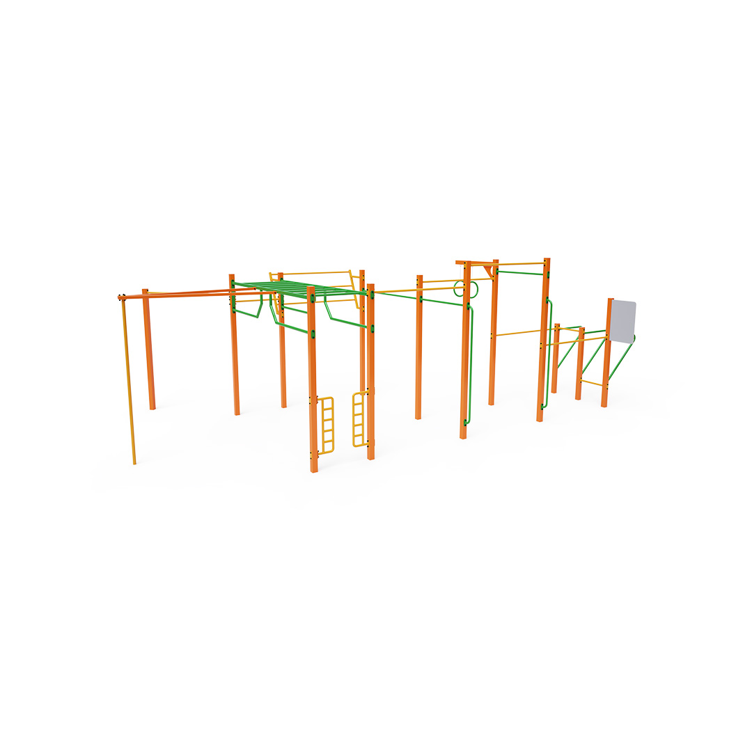 Street-Workout ist eine immer beliebtere Art, sich im Freien zu bewegen und dabei hauptsächlich mit dem eigenen Körpergewicht zu trainieren. Dank der frischen Luft und der vielfältigen Übungen, die Workout-Elemente und -Sets ermöglichen, ist das Training abwechslungsreich. Es fördert nicht nur das körperliche, sondern auch das seelische Wohlbefinden. Ein mittelgroßes Set mit mehreren Reckstangen unterschiedlicher Höhe, vertikalen Stangen, einer Schrägstange, einem Doppelparallelbarren, einer horizontalen und vertikalen Leiter, Ringen, einer Stange für Pole Dance und einer vertikalen Liegestützstange.