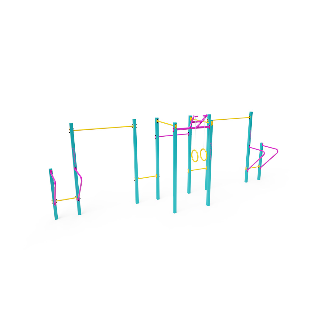 Workout ist eine immer beliebtere Form der Bewegung im Freien, bei der hauptsächlich mit dem eigenen Körpergewicht trainiert wird. Die Vielfalt der Übungen, die durch Trainingsgeräte und -aufbauten ermöglicht werden, in Kombination mit der frischen Luft macht das Training abwechslungsreich und motivierend. Dies fördert nicht nur die körperliche Gesundheit, sondern trägt auch zum mentalen Wohlbefinden bei. Dieses mittelgroße Set umfasst mehrere Reckstangen unterschiedlicher Höhe, Parallelbarren und Ringe.
