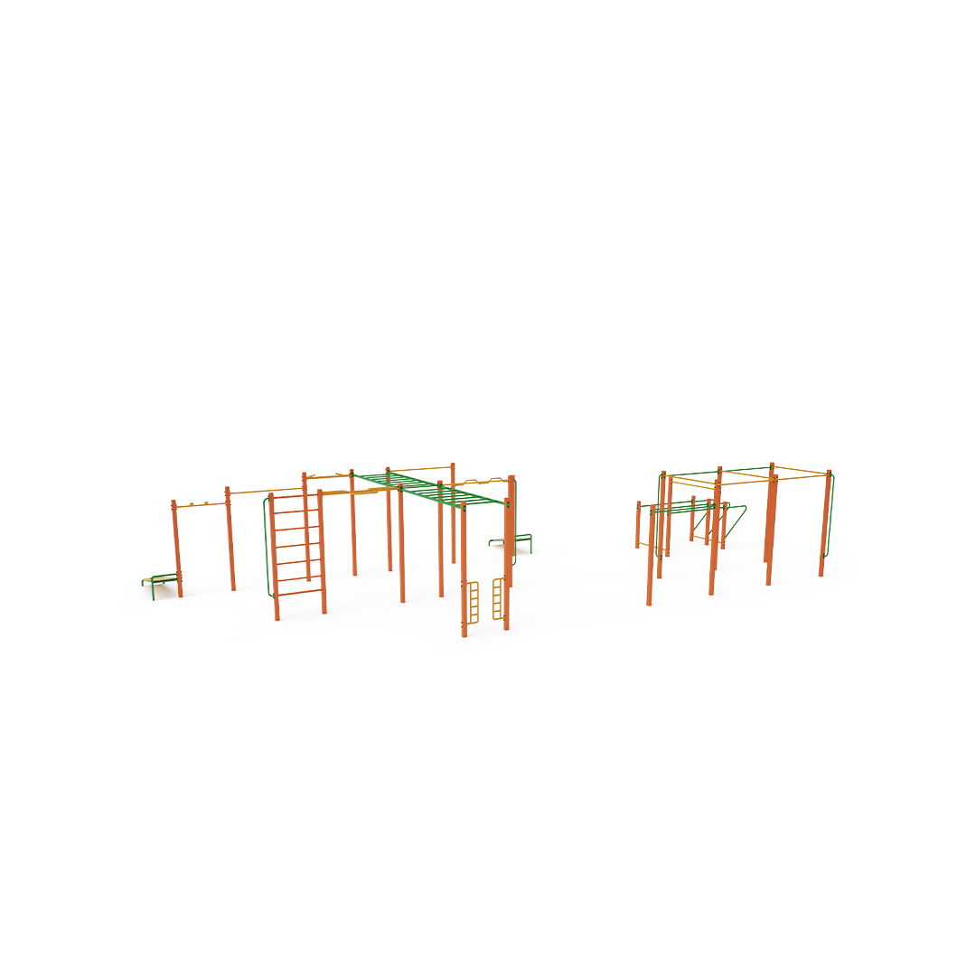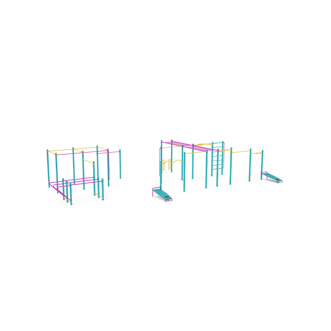 Street Workout wird immer beliebter, um sich im Freien fit zu halten und dabei vorwiegend mit dem eigenen Körpergewicht zu trainieren. Dank der frischen Luft und der vielfältigen Übungsmöglichkeiten, die die verschiedenen Elemente und Setups bieten, ist das Training abwechslungsreich. Es fördert sowohl das körperliche als auch das mentale Wohlbefinden. Das große Setup umfasst horizontale Stangen in verschiedenen Höhen, vertikale Stangen, Dip-Barren sowie horizontale und vertikale Leitern. Es wird ergänzt durch eine Stange mit Halbkreisen und zwei Sit-up-Bänke.