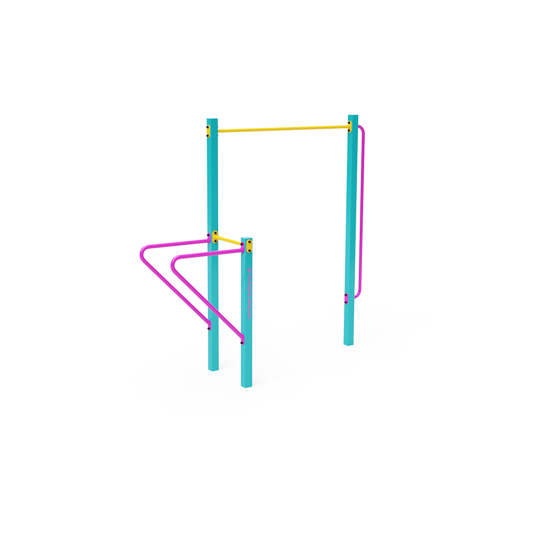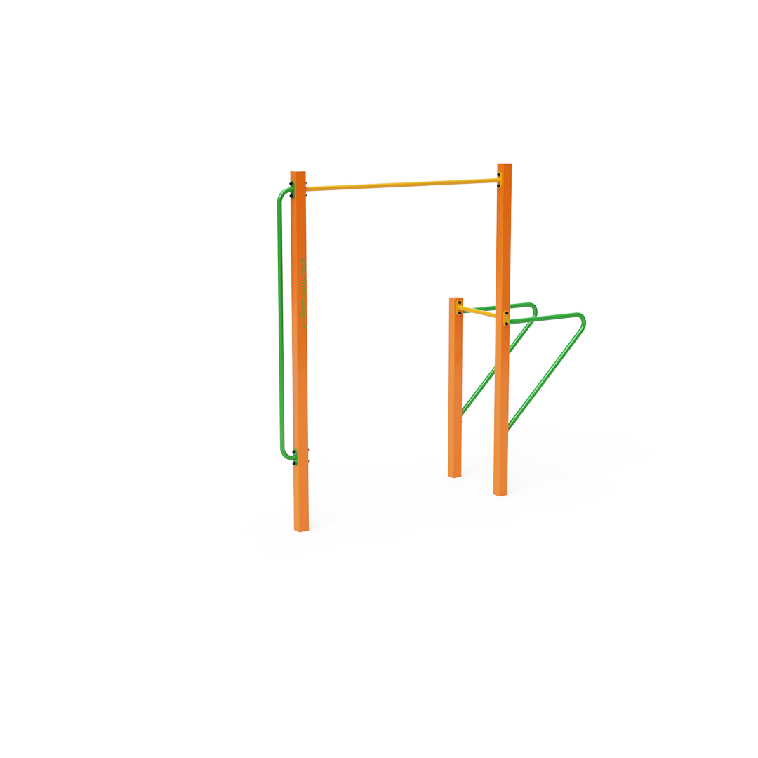 Street Workout ist eine immer beliebtere Form der Bewegung im Freien, bei der hauptsächlich mit dem eigenen Körpergewicht trainiert wird. Die Vielfalt der Übungen, die durch die verschiedenen Elemente und Setups ermöglicht werden, sorgt zusammen mit der frischen Luft für ein abwechslungsreiches und angenehmes Trainingserlebnis. Es fördert sowohl das körperliche als auch das geistige Wohlbefinden. Aufbau: Reckstange, Dip-Barren, Vertikalstange – Human Flag