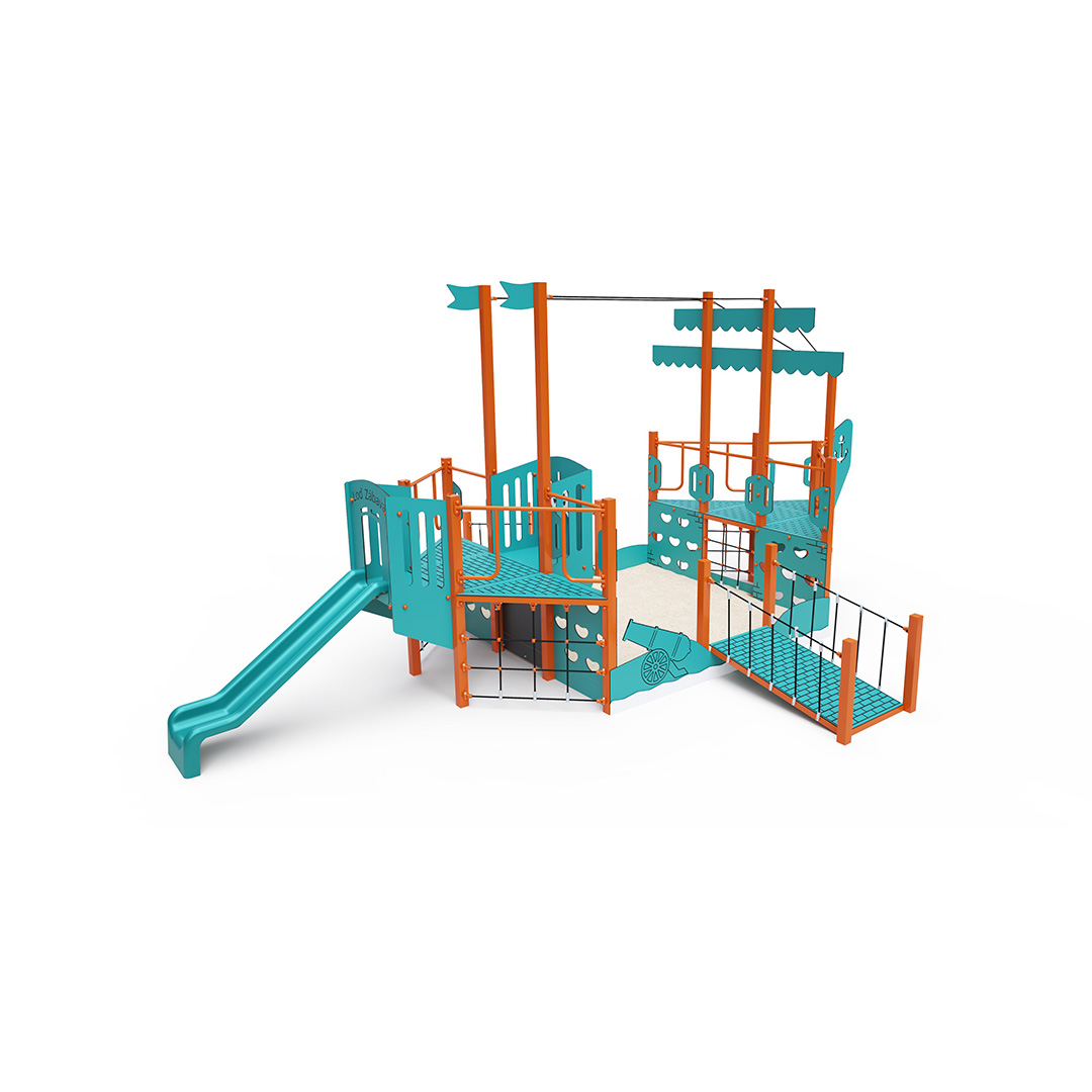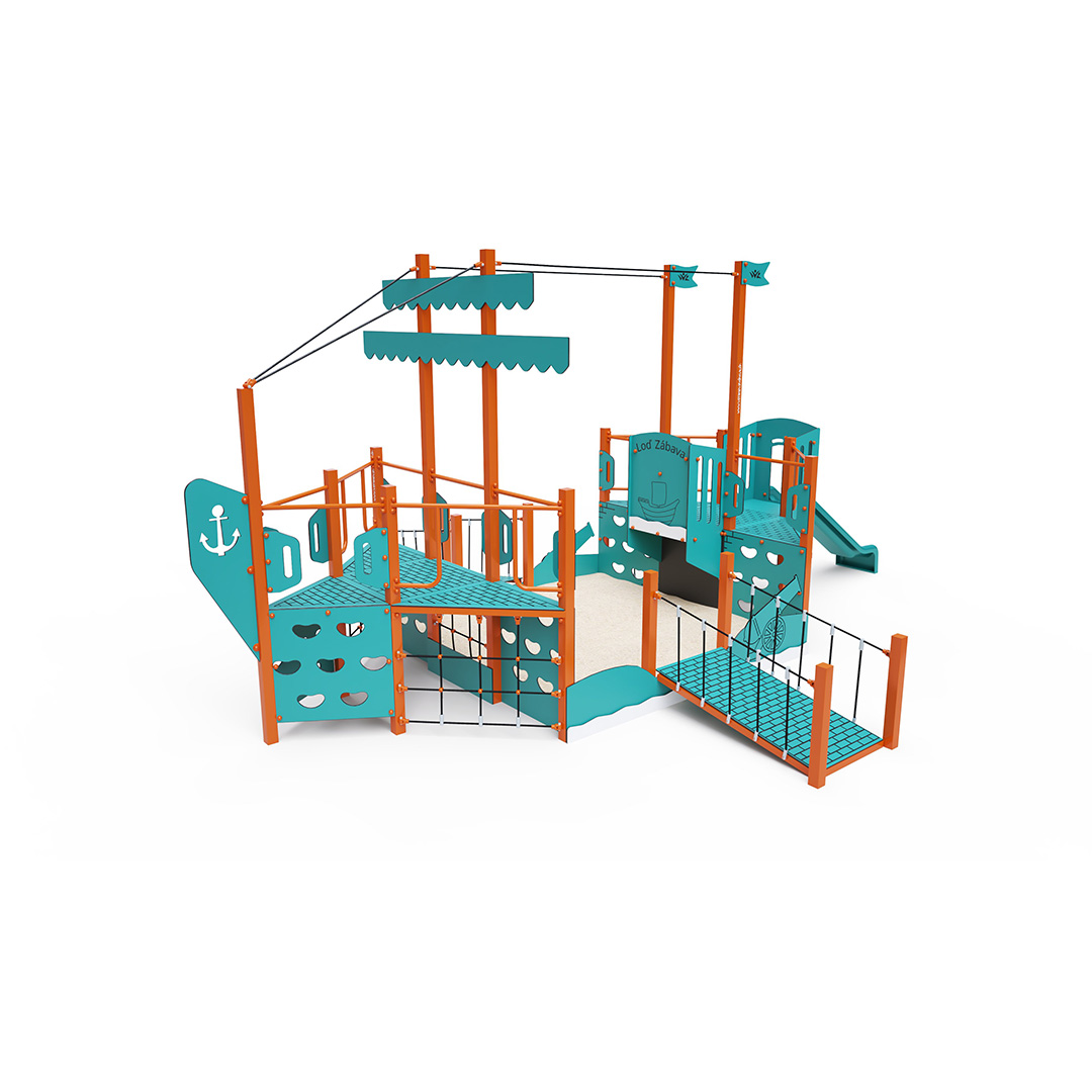 und zum gemeinsamen Spielen zu animieren. Kinder können an den Kletterwänden oder Seilen hochklettern und die Rutsche hinuntersausen. In der Mitte befindet sich ein 3 x 3 m großer Sandkasten, der dank Plattformen an beiden Wänden leicht zugänglich ist. Ergänzt wird das Set durch einen Mast mit Segeln und Flaggen, eine Kapitänsbrücke mit Ruder, ein Zeichenbrett und einen Bug mit Anker.