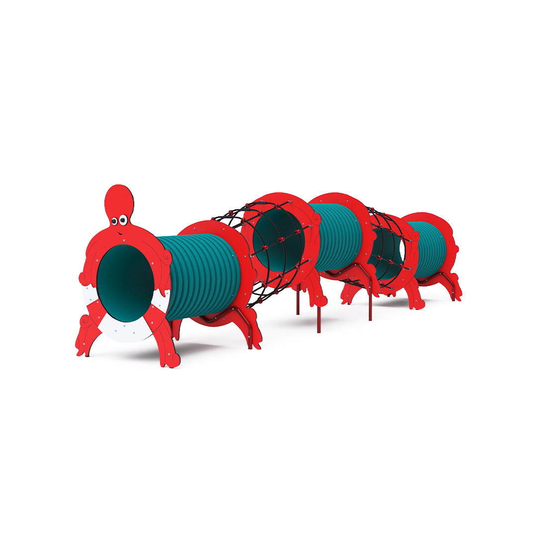 Das Spielelement im Design eines Oktopus mit Kunststofftunnel ist unsere große Version dieser Spielelementserie. Das Set besteht aus drei Tunneln in zwei Höhen, die durch zwei Seiltunnel verbunden sind. Das thematische Design regt die Fantasie der Kinder an. Die Vorder- und Rückseite sind aus HPL-Material gefertigt, das Langlebigkeit, Farbechtheit und Sicherheit garantiert. HPL ist umweltfreundlich, chemikalienbeständig, UV-beständig, ungiftig, recycelbar und bruchfest. Es besteht keine Verletzungsgefahr durch scharfe Kanten oder Splitter. Die Seile bestehen aus Polyesterfasern, die um den Kern gewickelt sind. Diese Konstruktion erhöht die Festigkeit und Widerstandsfähigkeit der Seile gegen mechanische Belastung. Polyester selbst besitzt viele positive Eigenschaften. Es ist resistent gegen Mikroorganismen und Witterungseinflüsse, trocknet schnell nach Regen, ist farbecht und zeichnet sich durch hohe Festigkeit aus. Die Verbindungselemente sind aus Edelstahl.