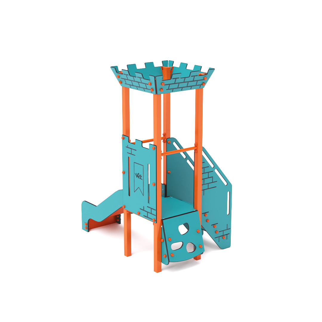Mini-Turm-Kombinationsset: Ein Turm mit Zinnen, den Kinder über eine schräge Kletterwand oder Treppe erklimmen und anschließend eine Rutsche hinuntersausen können. Das türkis-orange Design zieht schon von Weitem die Blicke auf sich. Die Stahlkonstruktion ist dank Feuerverzinkung und strapazierfähiger Pulverbeschichtung witterungsbeständig. Das verwendete HPL-Material ist chemikalienbeständig, UV-beständig, farbecht, ungiftig, recycelbar und bruchsicher. Es besteht keine Verletzungsgefahr durch scharfe Kanten oder Splitter. Alle Verbindungen sind aus Edelstahl und mit Kunststoffkappen versehen, um Haltbarkeit und Sicherheit zu erhöhen.