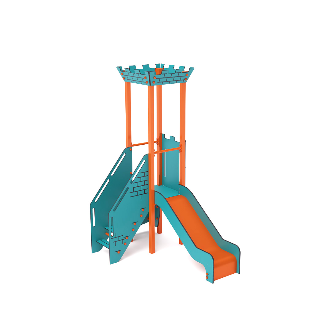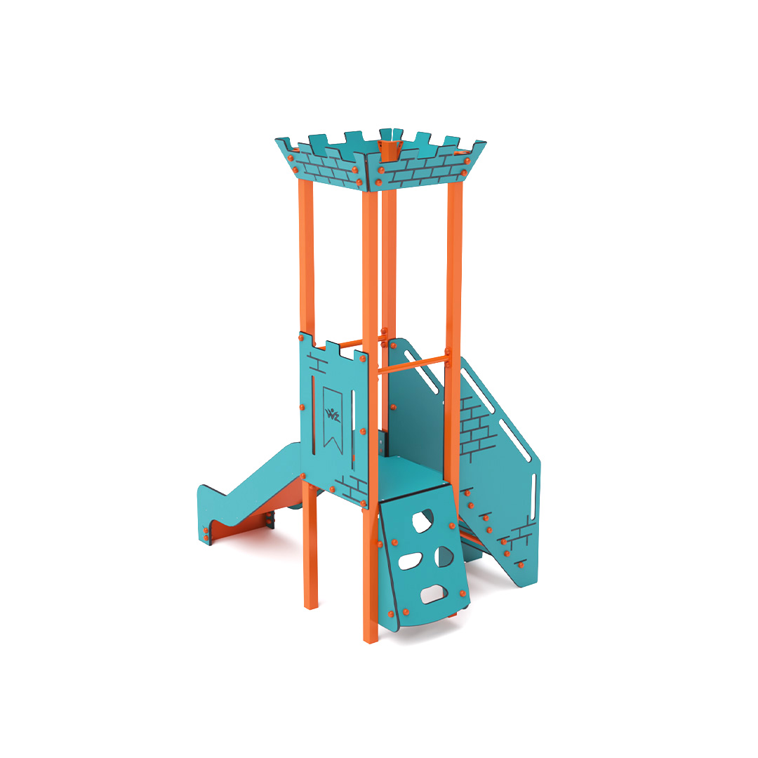 Mini-Turm-Kombinationsset: Ein Turm mit Zinnen, den Kinder über eine schräge Kletterwand oder Treppe erklimmen und anschließend eine Rutsche hinuntersausen können. Das türkis-orange Design lockt Kinder schon von Weitem zum Spielen an. Die Stahlkonstruktion ist dank Feuerverzinkung und strapazierfähiger Pulverbeschichtung witterungsbeständig. Das verwendete HPL-Material ist chemikalienbeständig, UV-beständig, farbecht, ungiftig, recycelbar und bruchsicher. Es besteht keine Verletzungsgefahr durch scharfe Kanten oder Splitter. Alle Verbindungen sind aus Edelstahl und mit Kunststoffkappen versehen, um Haltbarkeit und Sicherheit zu erhöhen.