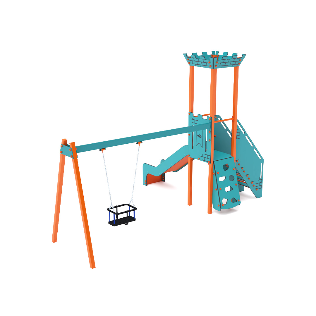 Mini-Turm-Kombinationsset: Ein Turm mit Zinnen, an dem Kinder eine schräge Kletterwand oder Treppe hinaufklettern und eine Rutsche hinuntersausen können. Ergänzt wird der Turm durch eine Hängeschaukel. Das türkis-orange Design lädt Kinder schon von Weitem zum Spielen ein. Die Stahlkonstruktion ist dank Feuerverzinkung und strapazierfähiger Pulverbeschichtung witterungsbeständig. Das verwendete HPL-Material ist chemikalienbeständig, UV-beständig, farbecht, ungiftig, recycelbar und bruchfest. Es besteht keine Verletzungsgefahr durch scharfe Kanten oder Splitter. Alle Verbindungen sind aus Edelstahl und mit Kunststoffkappen versehen, um Langlebigkeit und Sicherheit zu erhöhen.