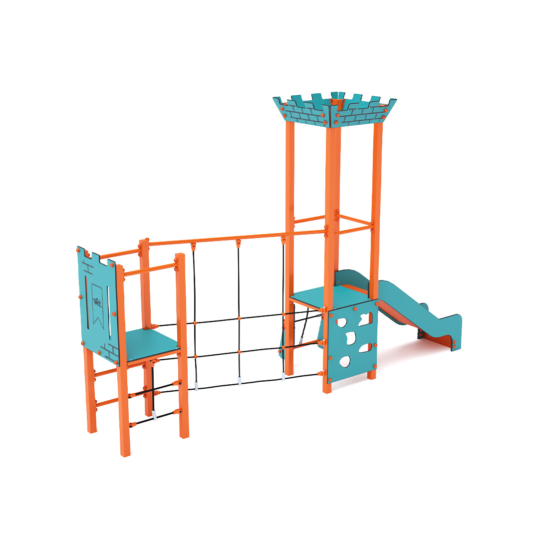 Dieses Mini-Turmset besteht aus zwei kombinierten Türmen. Die Türme sind durch eine diagonale Seilbrücke verbunden. Kinder können das Set über ein vertikales Seil, eine vertikale Rippenkletterei, eine vertikale Kletterwand, ein schräges Seil und eine Treppe erklimmen und anschließend die Rutsche hinuntersausen. Das türkis-orange Design lockt Kinder schon von Weitem zum Spielen an. Die Stahlkonstruktion ist dank Feuerverzinkung und robuster Pulverbeschichtung witterungsbeständig. Das verwendete HPL-Material ist chemikalienbeständig, UV-beständig, farbecht, ungiftig, recycelbar und bruchsicher. Es besteht keine Verletzungsgefahr durch scharfe Kanten oder Splitter. Alle Verbindungen sind aus Edelstahl und mit Kunststoffkappen versehen, um Haltbarkeit und Sicherheit zu erhöhen.