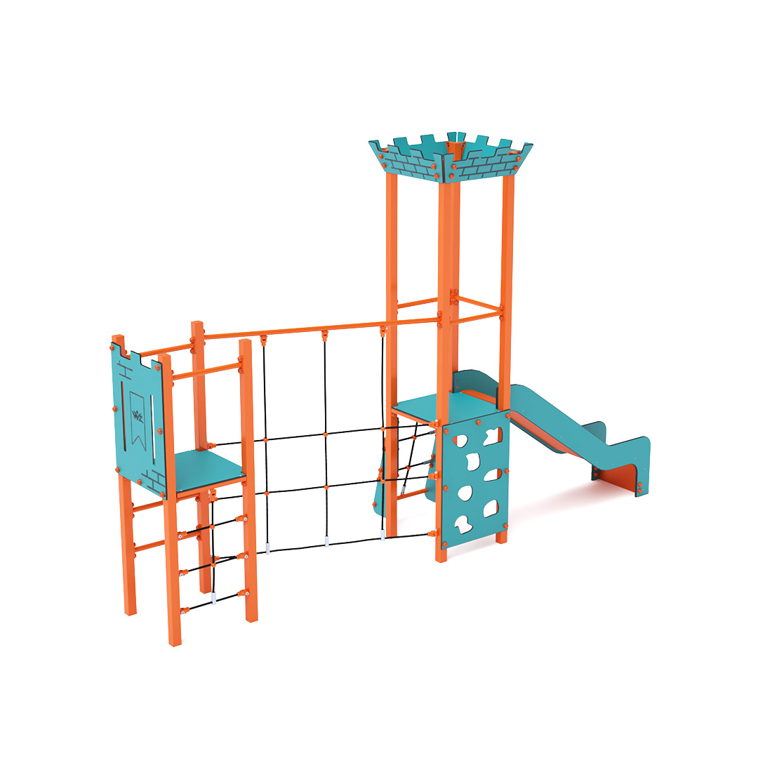 Dieses Mini-Turmset besteht aus zwei kombinierten Türmen. Die Türme sind durch eine diagonale Seilbrücke verbunden. Kinder können das Set über ein vertikales Seil, eine vertikale Rippenkletterei, eine vertikale Kletterwand, ein schräges Seil und eine Treppe erklimmen und anschließend die Rutsche hinuntersausen. Das türkis-orange Design lockt Kinder schon von Weitem zum Spielen an. Die Stahlkonstruktion ist dank Feuerverzinkung und robuster Pulverbeschichtung witterungsbeständig. Das verwendete HPL-Material ist chemikalienbeständig, UV-beständig, farbecht, ungiftig, recycelbar und bruchsicher. Es besteht keine Verletzungsgefahr durch scharfe Kanten oder Splitter. Alle Verbindungen sind aus Edelstahl und mit Kunststoffkappen versehen, um Haltbarkeit und Sicherheit zu erhöhen.