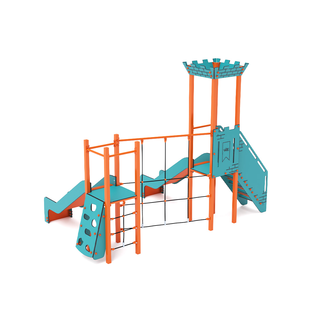Mini-Turmset mit zwei Türmen. Die Türme sind durch eine Stegbrücke verbunden. Kinder können das Set über zwei schräge und zwei rechtwinklige Leitern erklimmen und über zwei Rutschen wieder hinunter. Das türkis-orange Design lädt Kinder schon von Weitem zum Spielen ein. Die Stahlkonstruktion ist dank Feuerverzinkung und robuster Pulverbeschichtung witterungsbeständig. Das verwendete HPL-Material ist chemikalienbeständig, UV-beständig, farbecht, ungiftig, recycelbar und bruchsicher. Es besteht keine Verletzungsgefahr durch scharfe Kanten oder Splitter. Alle Verbindungen sind aus Edelstahl und mit Kunststoffkappen versehen, um Haltbarkeit und Sicherheit zu erhöhen.
