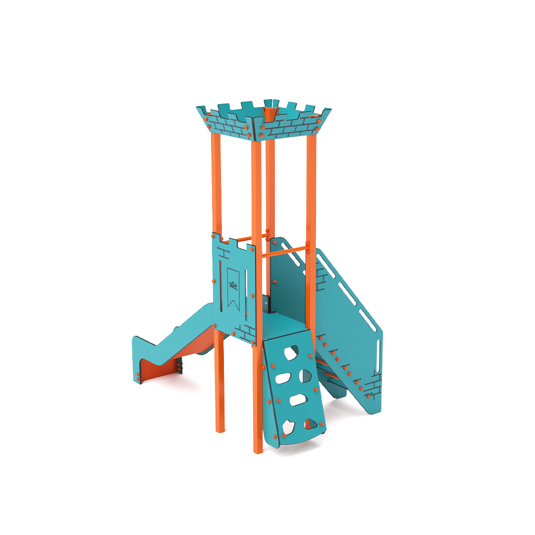 Mini-Turm-Kombinationsset: Ein Turm mit Zinnen, den Kinder über eine schräge Kletterwand oder Treppe erklimmen und anschließend eine Rutsche hinuntersausen können. Das türkis-orange Design zieht schon von Weitem die Blicke auf sich. Die Stahlkonstruktion ist dank Feuerverzinkung und strapazierfähiger Pulverbeschichtung witterungsbeständig. Das verwendete HPL-Material ist chemikalienbeständig, UV-beständig, farbecht, ungiftig, recycelbar und bruchsicher. Es besteht keine Verletzungsgefahr durch scharfe Kanten oder Splitter. Alle Verbindungen sind aus Edelstahl und mit Kunststoffkappen versehen, um Langlebigkeit und Sicherheit zu erhöhen.
